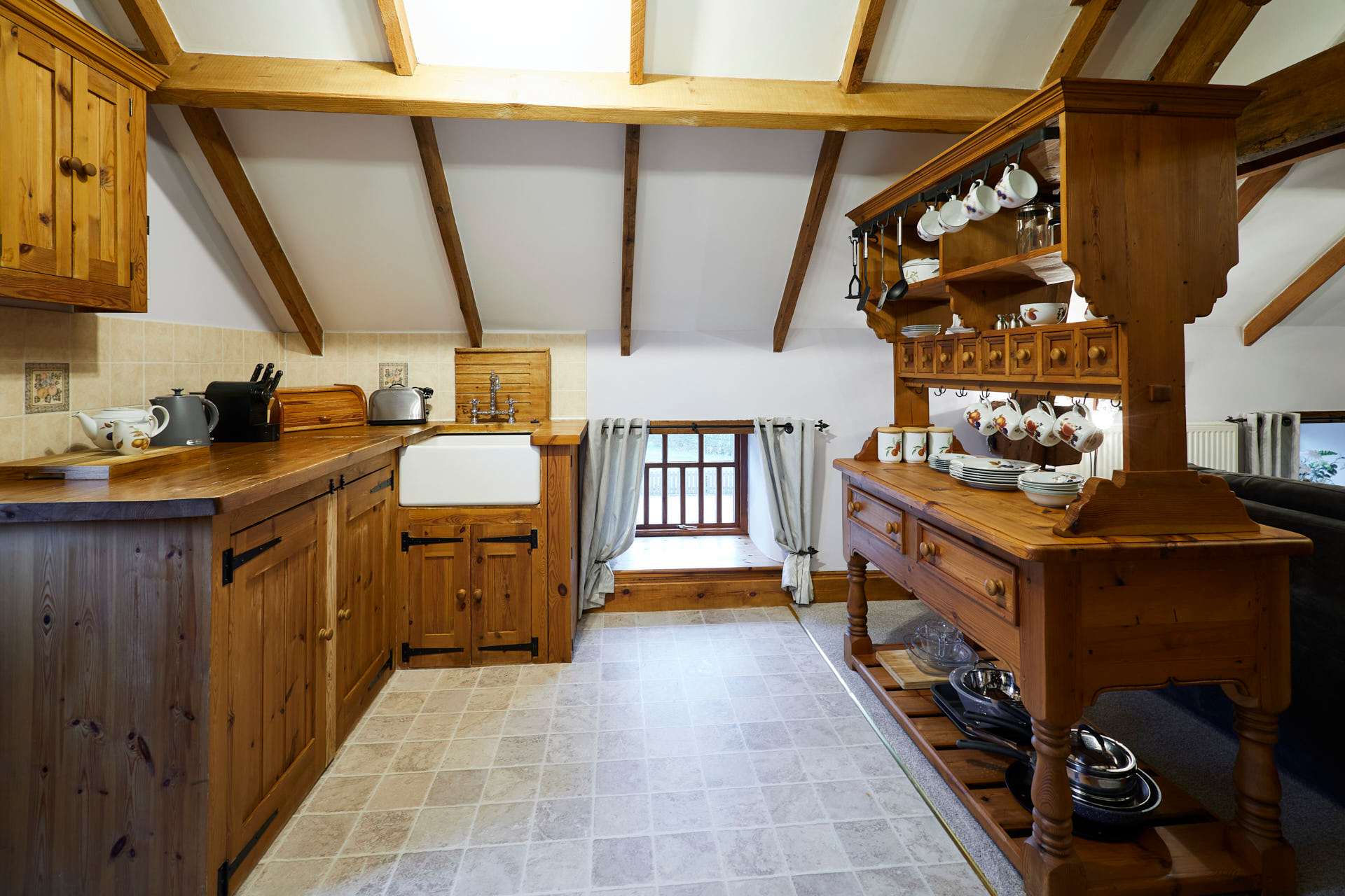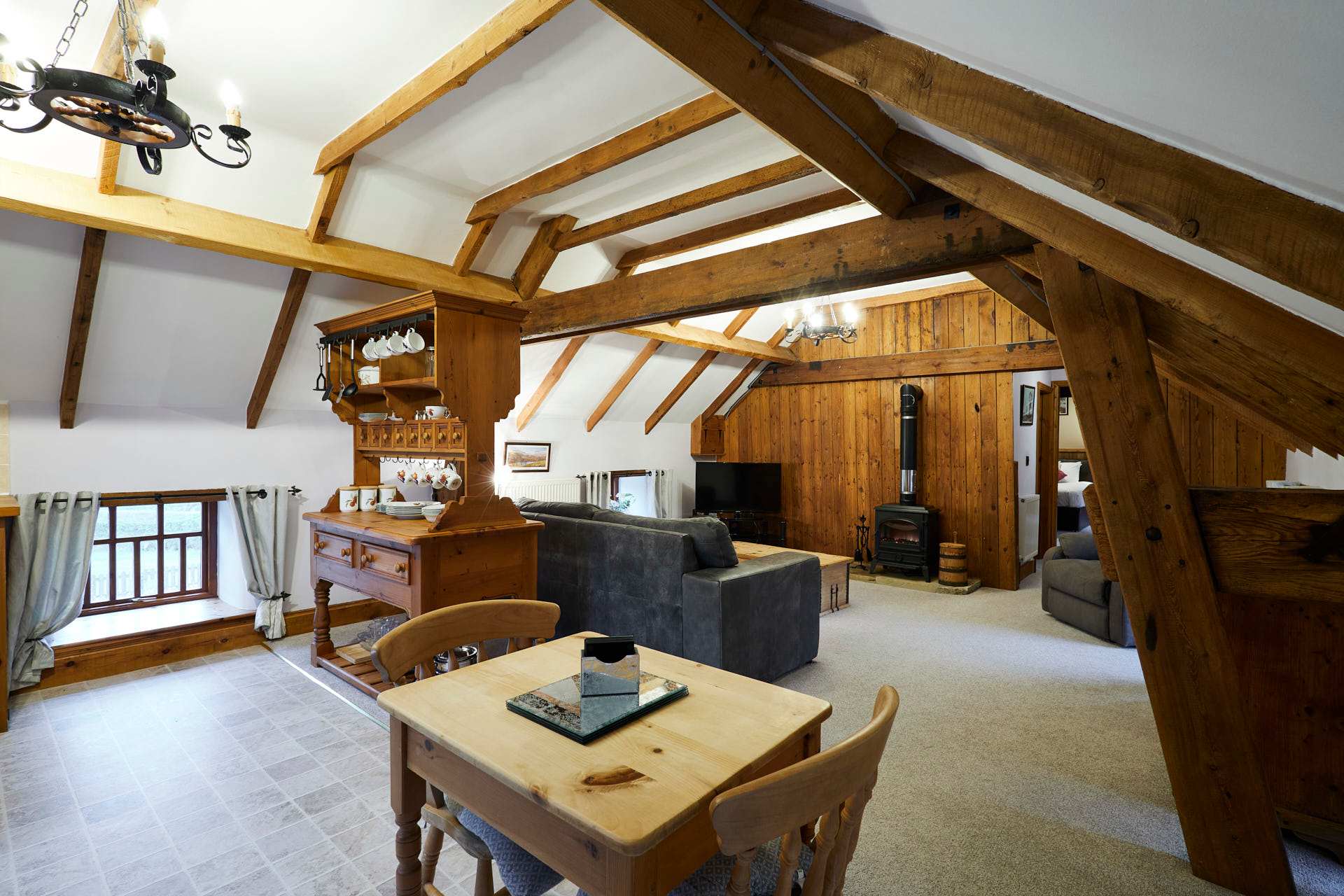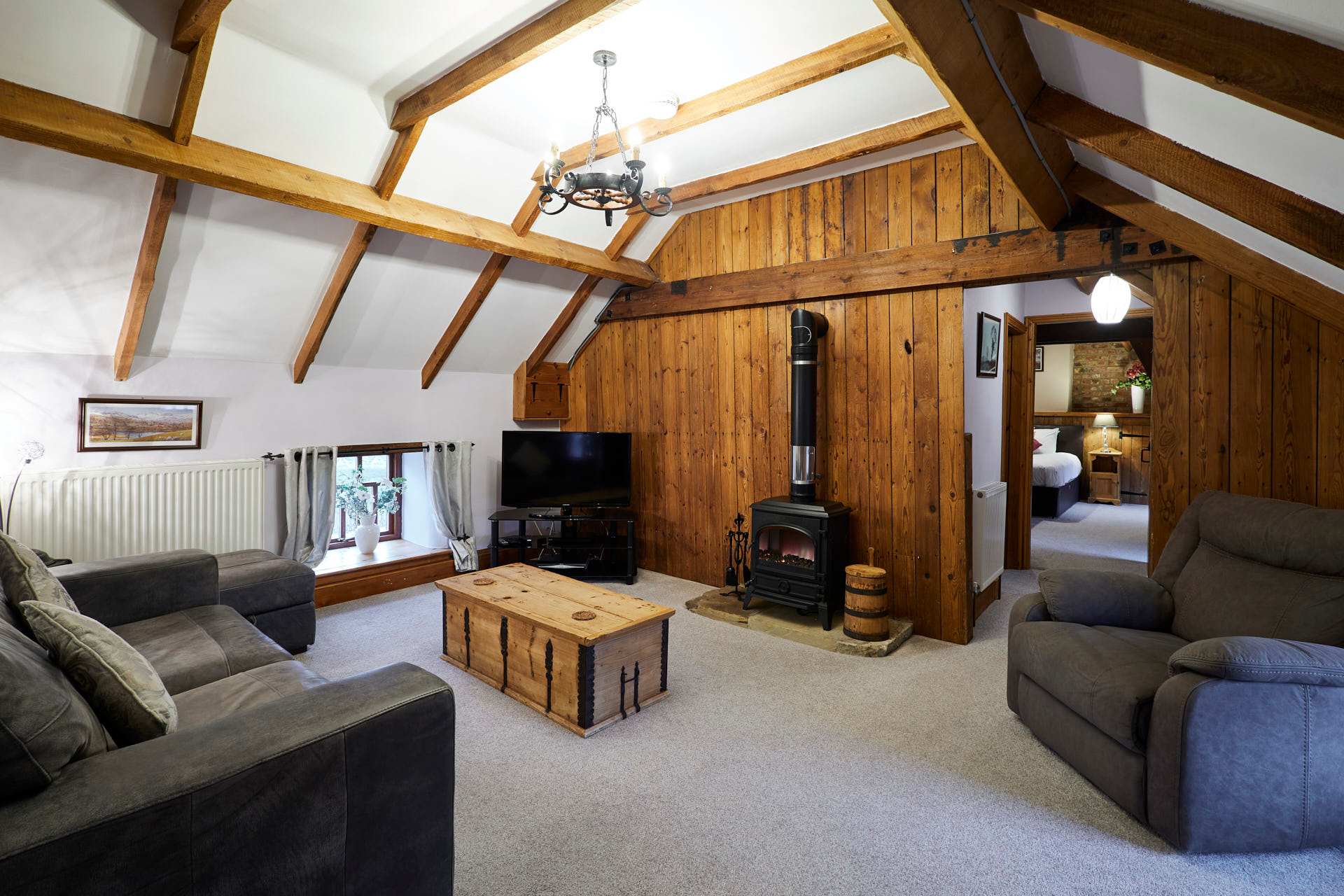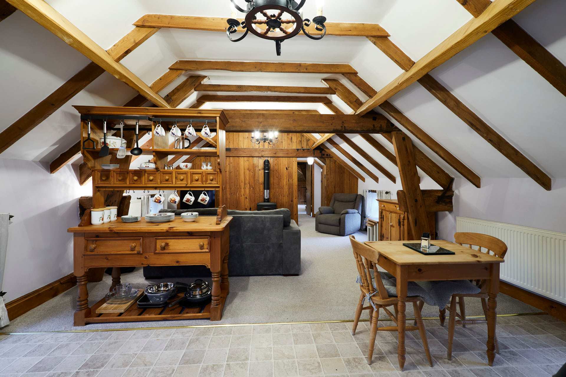 The Grainary is perfect for couples and is a charming first-floor apartment accessed via the original external granary steps. Inside, you’ll find a spacious open-plan living area featuring an electric wood-burning stove, dining space, and a beautifully hand-crafted farmhouse-style kitchen. The bedroom offers a super king-size bed and an en-suite bathroom, with a shower over a spa bath - complete with whirlpool jets. Characterful beamed, sloping ceilings run throughout the property. At the foot of the steps, guests can enjoy a paved, enclosed seating area just outside The Grainary.