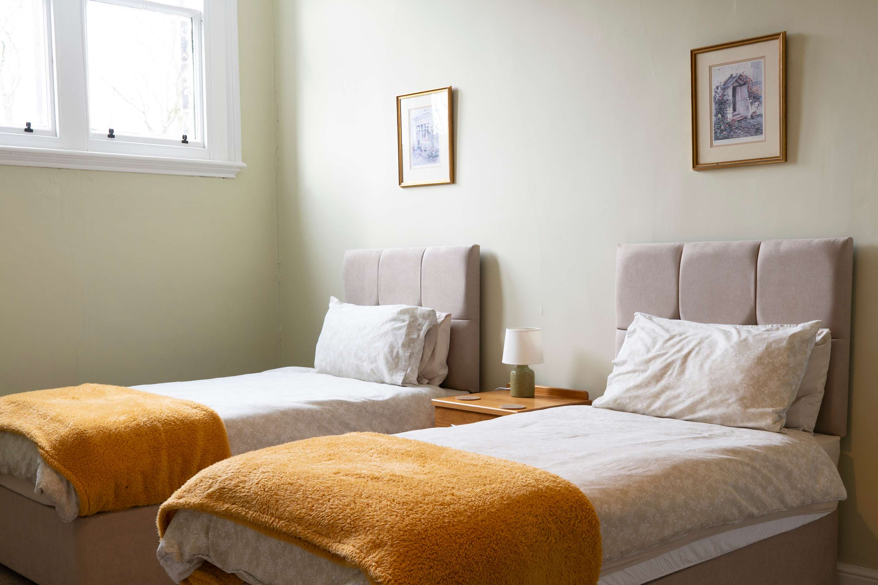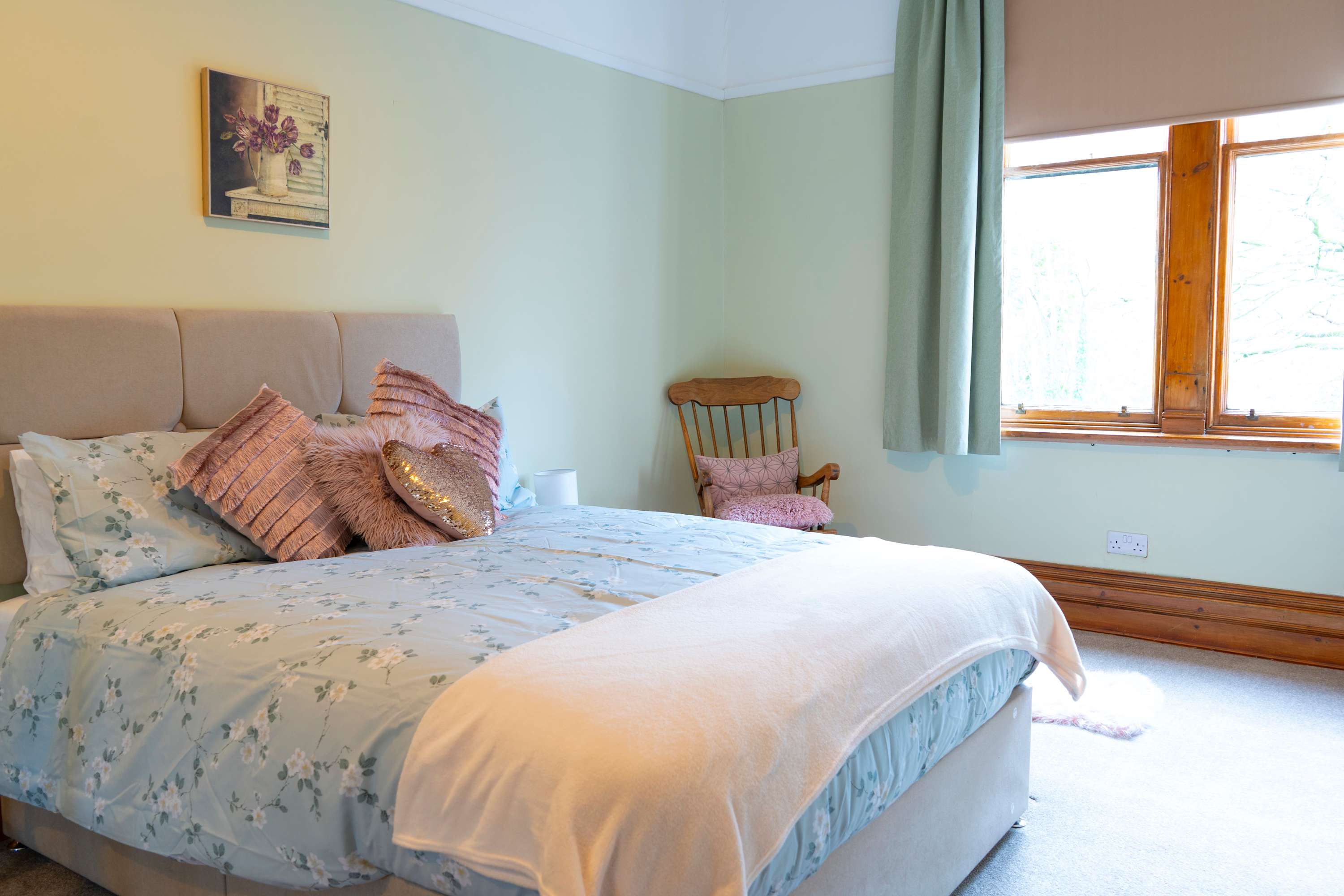 Chatsworth Townhouse II is good accommodation to use for family stays to celebrate graduation at the local university, and also for weddings as the property is near popular venues. You'll find original and traditional features aplenty such as the old fire places (although these are purely decorative). Upon entering the property, you will be straight into the hallway, an elegant space with beautifully patterned flooring which leads you down into the rest of the property. Turning right off the hall, you will enter the main living room. This is the perfect space for a cosy night in front of the flatscreen Smart TV or where you can relax before a busy day exploring the best of what Carlisle has to offer. Spacious and with plenty of seating to spare, the dining room is next door where you can all gather together for meals and relax in your spare time. The kitchen is sleek and modern with everything you could need to make the most of your self-catering stay away from home. Amenities include a dishwasher, refrigerator, freezer, kettle, microwave, oven, hob and toaster. If you head up the first flight of stairs to the first floor, you will come to the first bedroom which has a king-size bed with soft bed linens and pillows. The addition of the first bathroom could make it easy for a couple to have this floor to themselves. Climbing the stairs brings you onto the second floor. Here you can find spacious king and double bedrooms on this floor. Both rooms feature neutral colour schemes and lamps which add a cosy feel at night. Also on this floor is the second bathroom where you can have a nice relaxing soak or take a power shower. It also comes equipped with cabinets for plenty of storage, as well as a WC and wash basin. On the next floor, you arrive at a quiet part of the house - the snug. With leather seating and a TV, It’s a cosy spot to unwind. Also on this floor is a twin bedroom, decorated to the same standard, with soothing greens and sloped ceilings that create the perfect environment for a calming rest after a long day. Finally, on the top floor of the property, you will find a further two bedrooms – one twin and one double, further adding to the family-friendly nature of Chatsworth Townhouse II. There is also outdoor space on offer here in the form of an enclosed seating area in a walled garden. Chatsworth Townhouse II is a unique, traditional property with plenty of room for large family holidays together. If you're arriving with a larger group, you can book Chatsworth Townhouse II along with Chatsworth Townhouse I. These sister properties are situated next to each other, offering unique and charming accommodations in Carlisle, perfect for hosting larger groups.