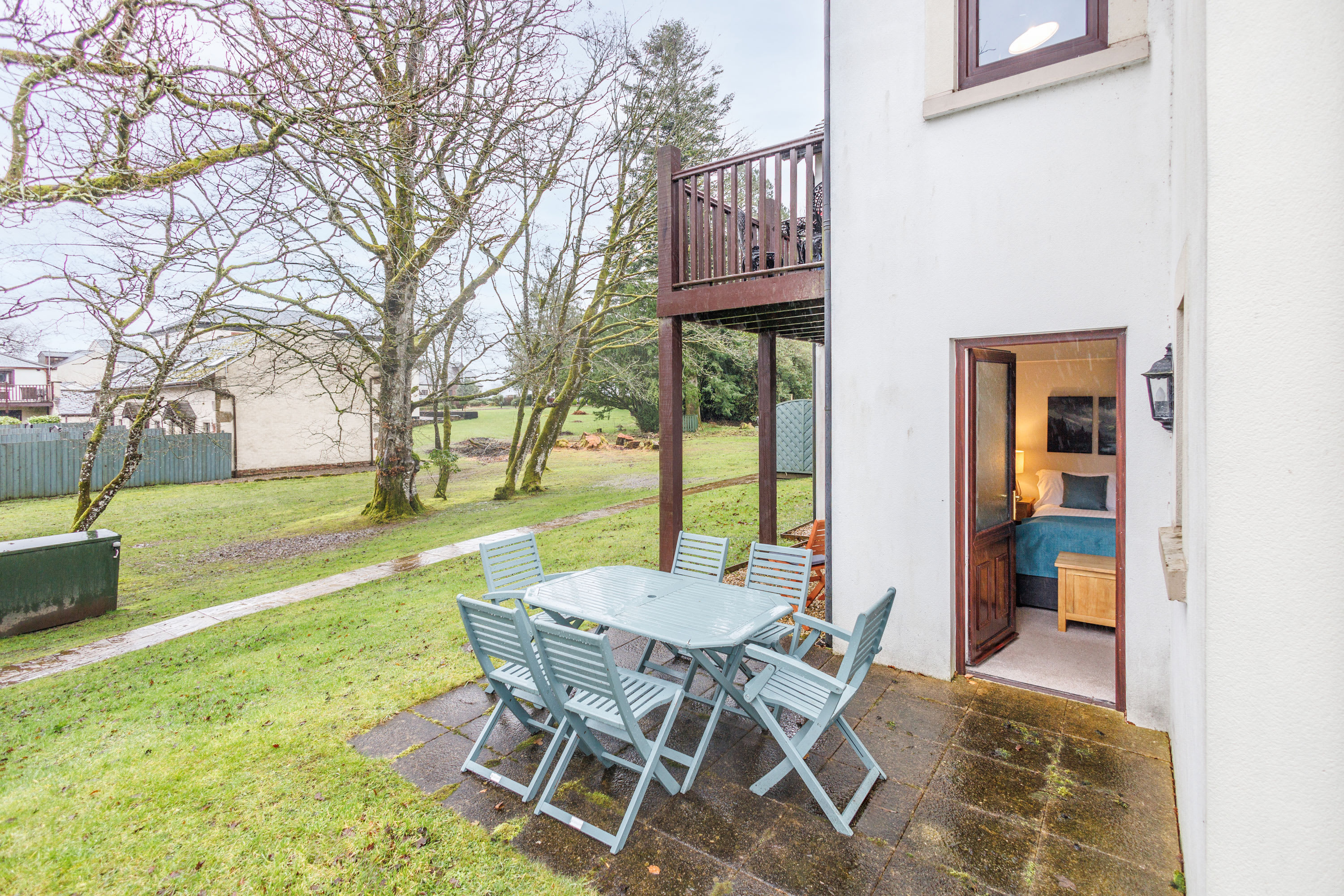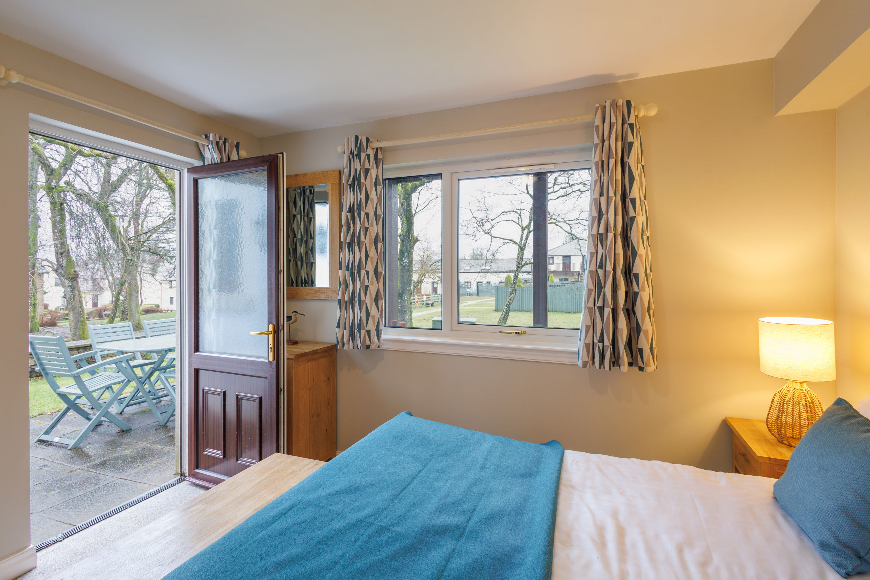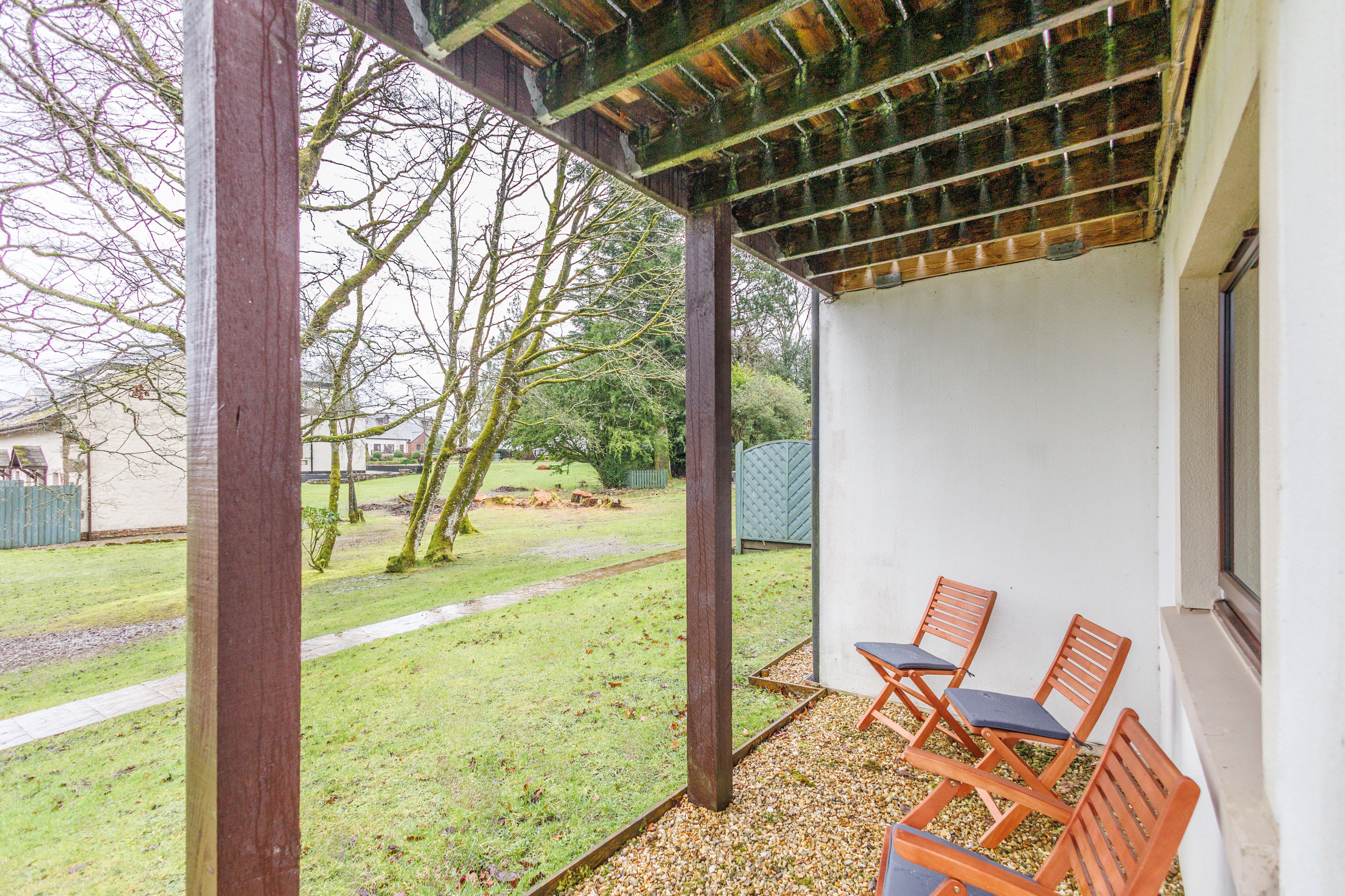 Set within peaceful woodland surroundings, this relaxing and rustic retreat has been thoughtfully designed to complement the natural beauty of the area. With its warm finishes and tranquil setting, the property offers a perfect escape for families or friends looking to unwind in comfort. At the heart of the home is a spacious open-plan kitchen and dining area, ideal for both entertaining and everyday living. The well-equipped kitchen provides ample workspace for preparing meals, while the dining table and chairs create a welcoming space for relaxed mealtimes, board games, or simply gathering together after a day outdoors. Flowing seamlessly from the dining area is the tasteful living room, furnished with plush, comfortable sofas and a TV, creating a cosy spot to relax. Patio doors open onto a private balcony overlooking the surrounding woodland, complete with outdoor table and chairs — the perfect place to enjoy morning coffee or soak in the peaceful forest atmosphere. The ground floor master bedroom offers a restful sanctuary, with doors opening directly onto a patio area outside, allowing you to step straight into the fresh woodland air. This bedroom also benefits from a private en-suite shower room. Two further bedrooms provide flexible accommodation, with one offering twin single beds and the other featuring bunk beds — both enjoying beautiful woodland views. A family bathroom with bath and shower completes the accommodation. Outside, the property continues to impress with a patio area furnished for outdoor dining and relaxation. The rear of the property is surrounded by mature trees and overlooks a tranquil duck pond, enhancing the sense of privacy and calm. A short woodland walk nearby leads to a children’s playground, making this an ideal setting for families while still maintaining a peaceful and secluded feel. This charming woodland property perfectly balances rustic character with modern comfort, offering a truly relaxing escape immersed in nature.