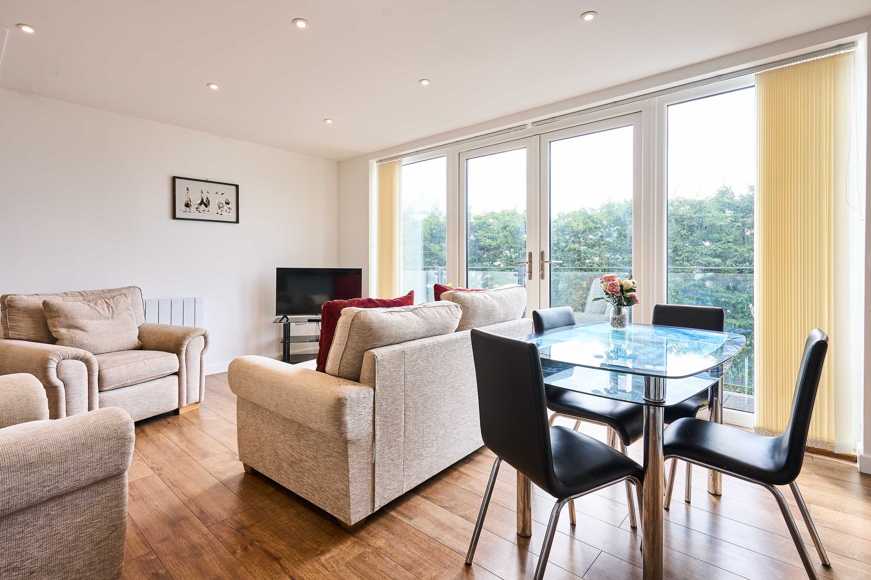 Welcome to your perfect home away from home, a modern, thoughtfully designed space ideal for families and small groups. This stylish apartment features three comfortable bedrooms and one well-appointed bathroom, comfortably accommodating up to five guests. The open plan living area is fully equipped for everything you need to ensure your stay at the property is enjoyed by all. The living area provides a warm and inviting space to unwind, while the clean, modern interiors create a bright and airy feel throughout the home. Step out onto your private balcony, where you can enjoy a relaxing overlooking view—perfect for morning coffee or winding down at sunset. Each bedroom is designed with relaxation in mind, offering a cozy atmosphere for restful nights. Whether you're traveling with family or friends, this space offers the perfect balance of comfort and functionality. Enjoy quality time together, prepare simple meals, and settle into a peaceful environment that makes every stay feel effortless.