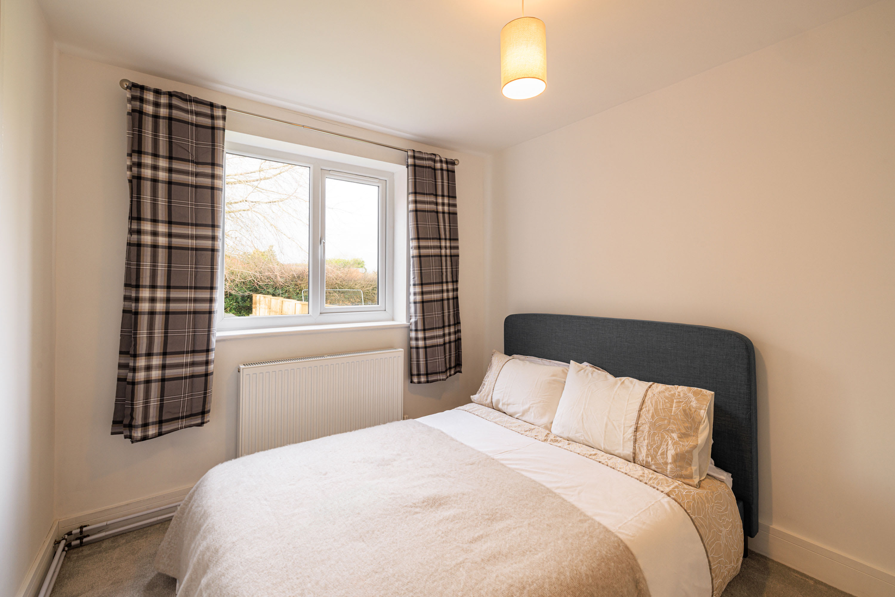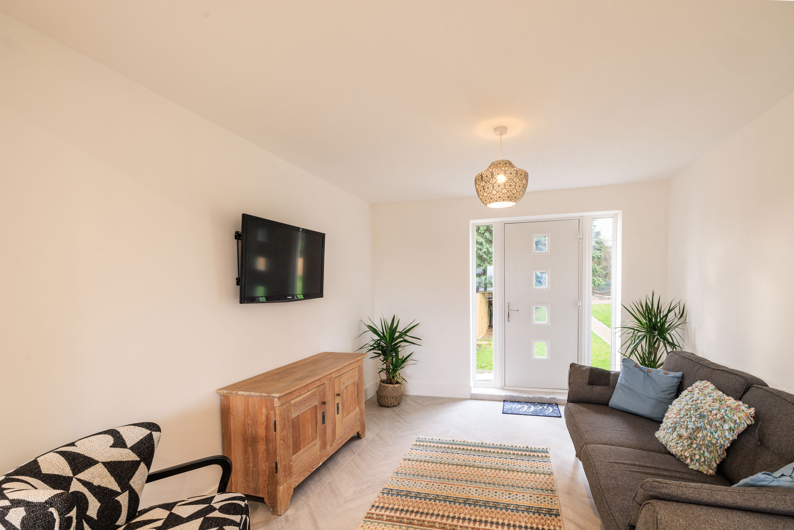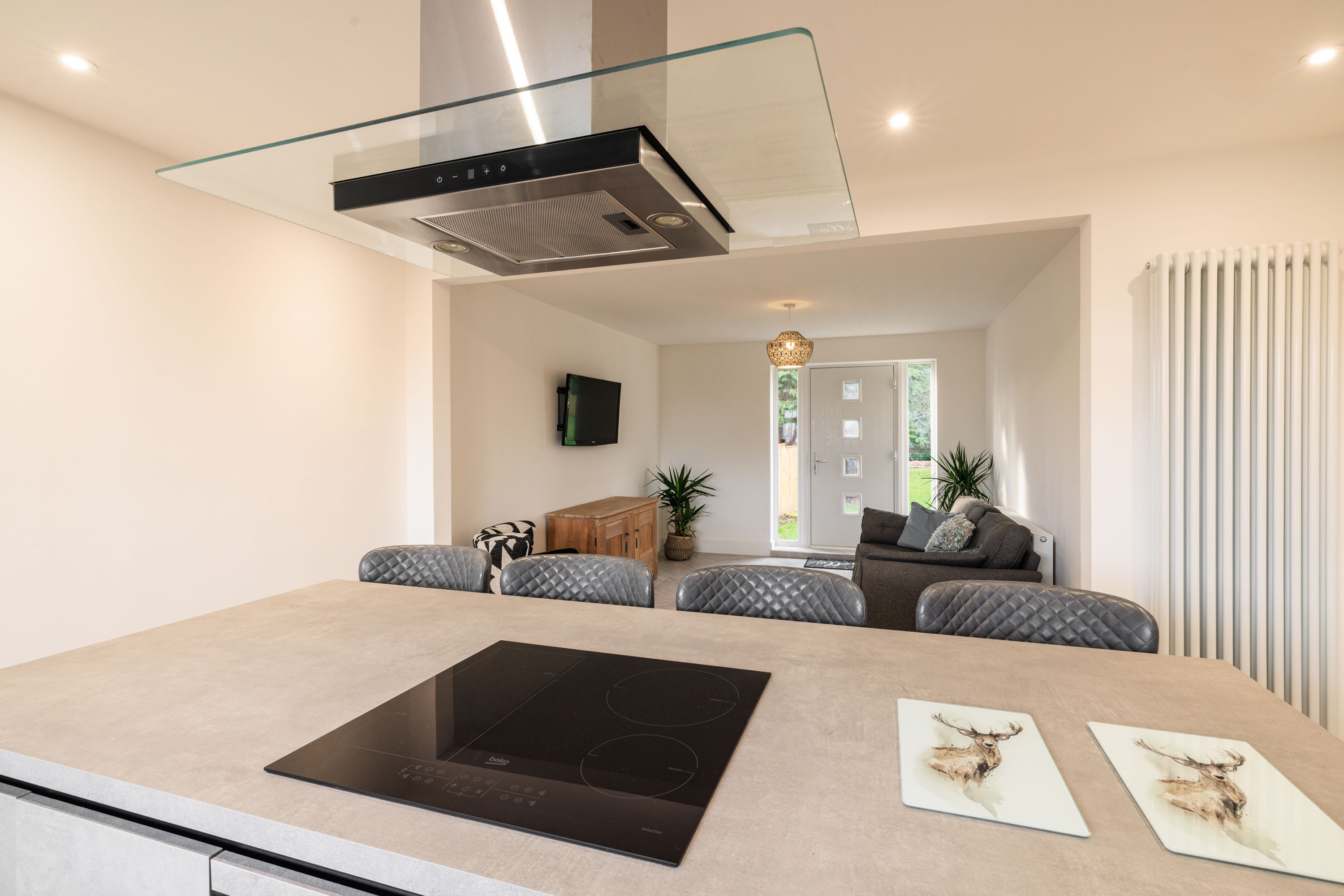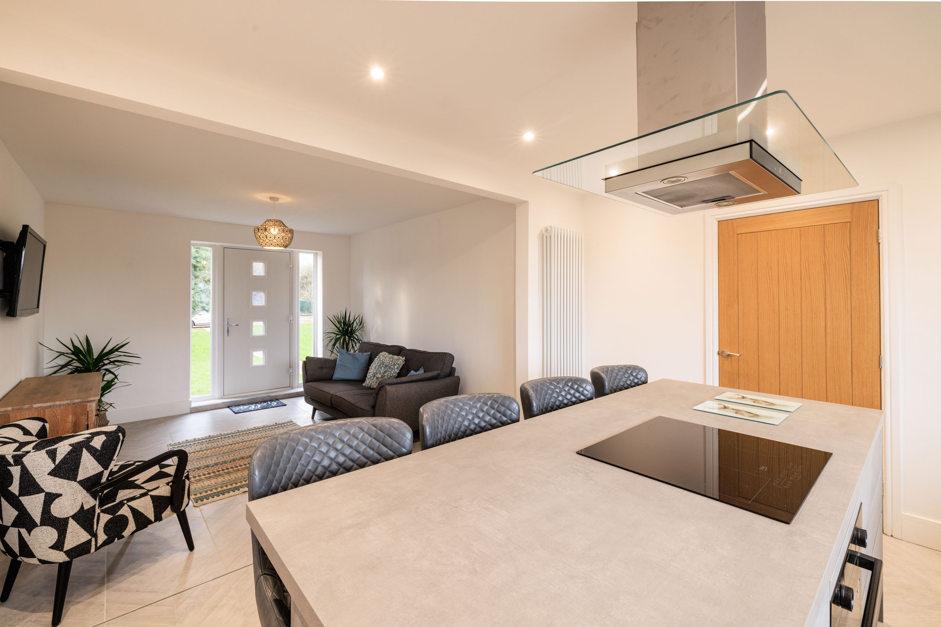 Hawthorn Bank combines contemporary elegance with a warm and inviting atmosphere, offering beautifully designed living spaces finished to an impressive standard throughout. At the heart of the home is a truly stunning, spacious kitchen, thoughtfully designed with sleek integrated cabinetry, clean lines and a seamless finish that enhances the modern aesthetic. The generous breakfast bar provides ample seating, making it a natural hub for morning coffee, relaxed dining or social gatherings, while the electric hob and striking modern extractor above add both practicality and style. Large windows frame a peaceful outdoor outlook, allowing natural light to pour in and create a bright yet calming environment. The kitchen flows effortlessly into a spacious, open-plan living area that feels both airy and welcoming. This light-filled space offers comfortable seating arranged around a flat-screen television, making it perfect for cosy evenings or relaxed entertaining. Neutral and calming flooring runs throughout the home, adding continuity and enhancing the sense of space, while the soft colour palette creates a tranquil backdrop that suits any style. The property continues to impress with three beautifully presented bedrooms. The main bedroom features a comfortable double bed and a restful ambiance, while the second bedroom offers two single beds, ideal for family or guests. The third bedroom provides a cosy single bed, perfect as a quiet retreat or additional guest space. Each room is tastefully decorated in neutral tones, promoting a sense of calm and relaxation. The modern bathroom is finished to a high specification, showcasing complementary tiling, an elegant designer radiator and a luxurious overhead shower complete with sophisticated brass fittings that add a refined touch. Outside, the large front garden provides a wonderful open outlook, creating a peaceful setting to enjoy the changing seasons. With patio furniture in place, it offers the perfect space to sit back and unwind, whether enjoying morning sunshine, evening drinks, or simply watching local wildlife in a tranquil and private setting.