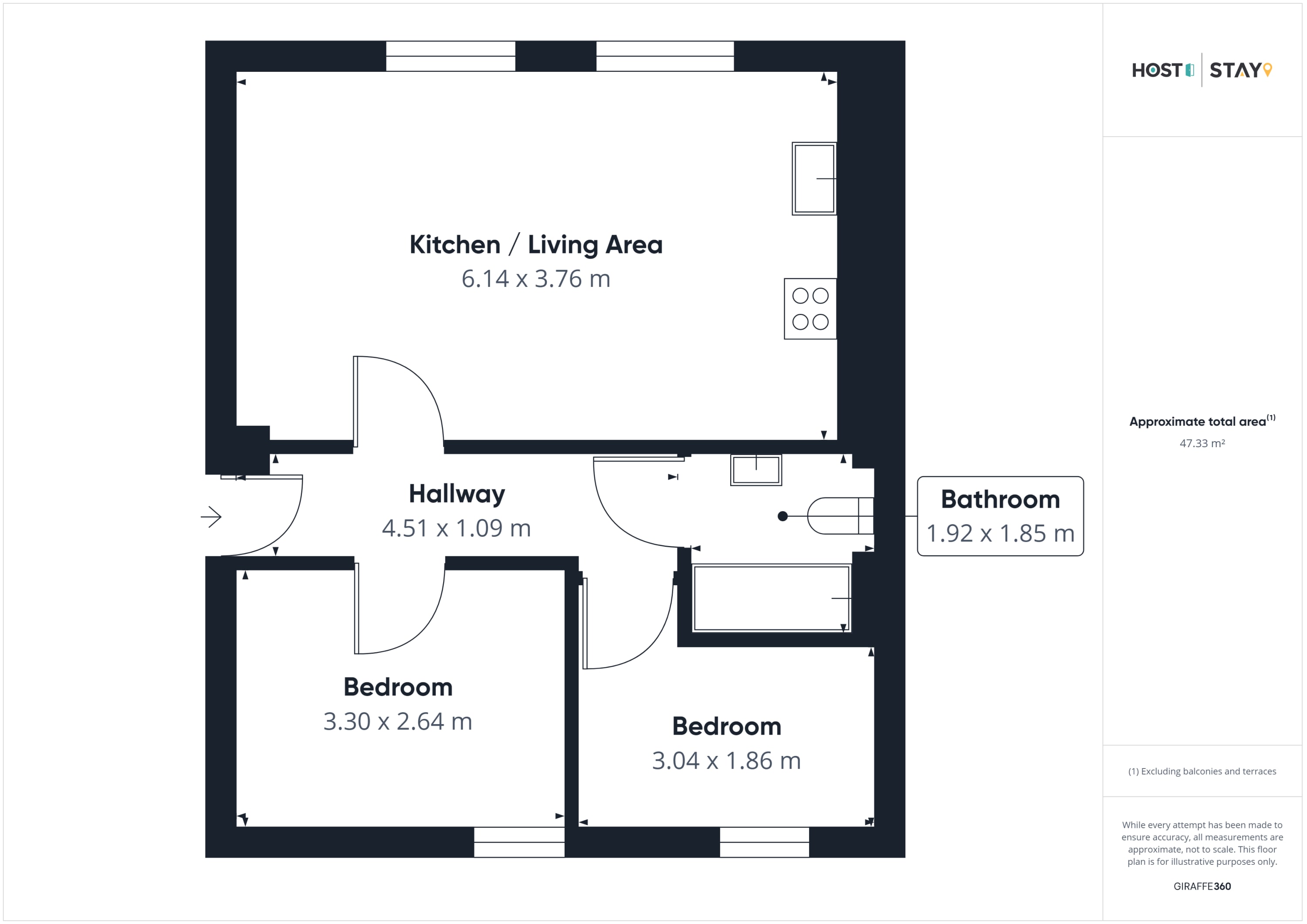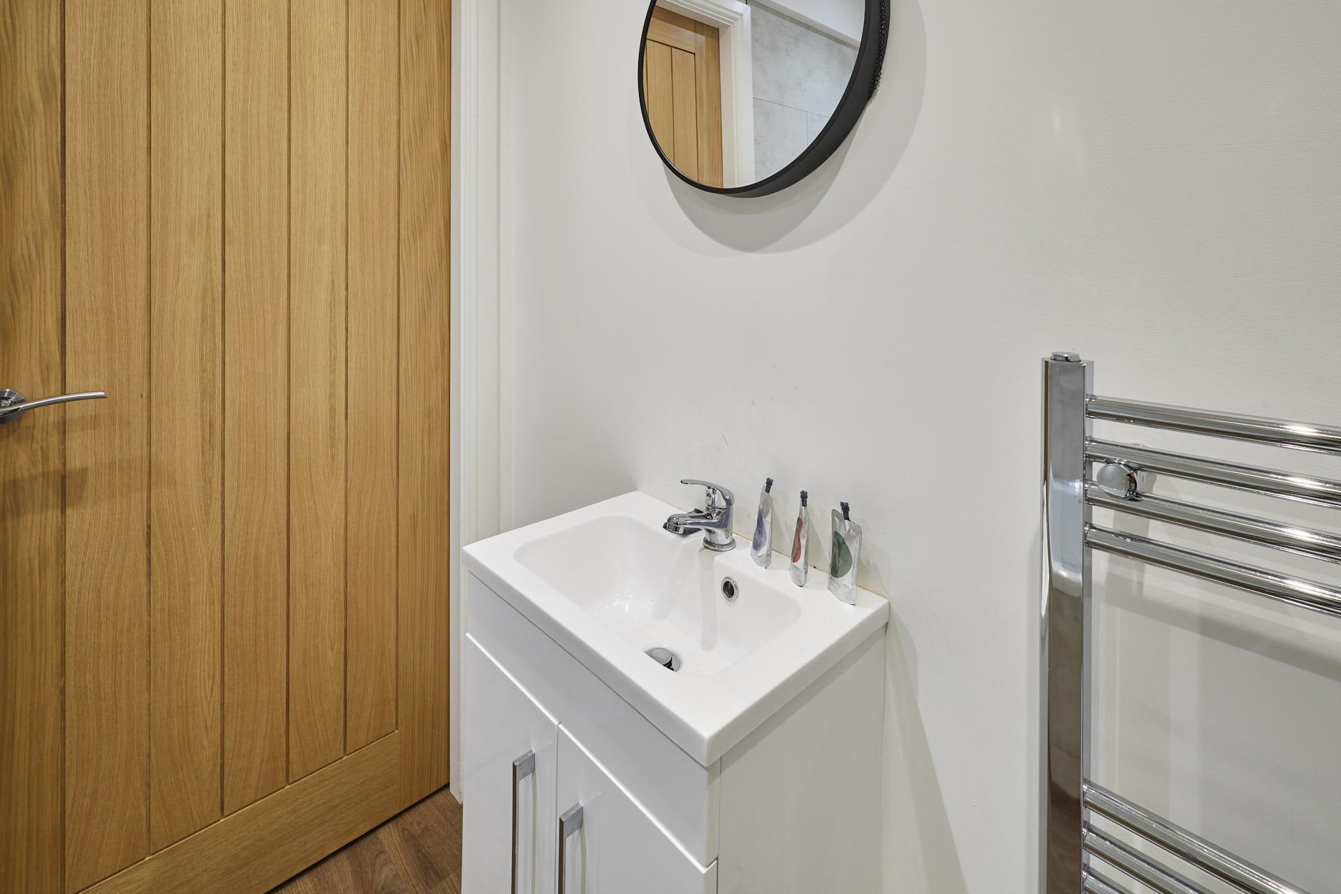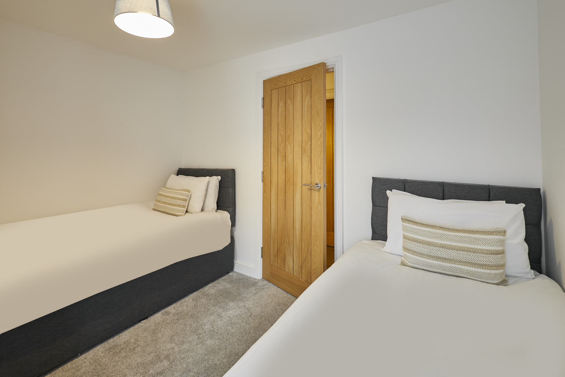 The Globe, Apartment 4 has a fully equipped kitchen with modern appliances including a fridge-freezer, kettle, microwave, oven, toaster and washing machine. Modern in style, the kitchen cabinets are white with matching worktops to create a stylish space. Right next to the kitchen is the dining area which has a breakfast bar style dining table and comfy bar stools. Also sharing the space is a bright and homely living area where you can unwind during your stay. There are two beige coloured sofas and a TV with Freeview so it’s a great place to relax. The master bedroom features a double bed with premium bed linens and plush bedding to ensure you have a great night’s sleep. The second bedroom is a comfy twin. Modern and clean, the family bathroom includes a bathtub with an overhead shower, WC and basin. Outside you'll find an enclosed patio so it's ideal if you want to enjoy a spot of fresh North Yorkshire air during your stay.