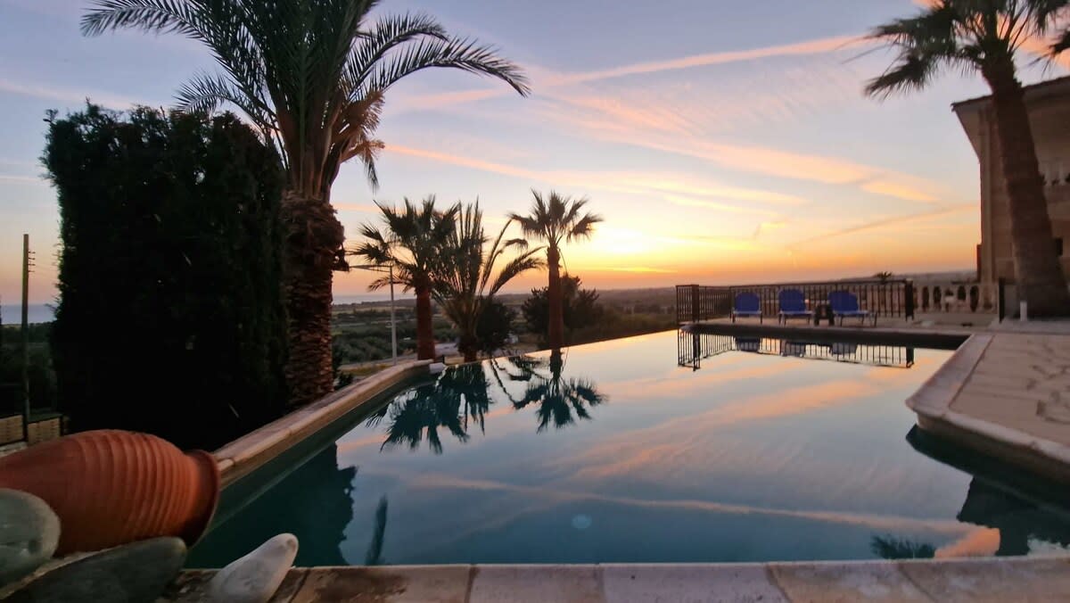 Sunset Villa has a welcoming feel to it throughout, with plenty of space, light and facilities on offer. Fully equipped with cookware, dishes, cutlery, a dishwasher, fridge-freezer, kettle, oven, hob, toaster and washing machine, the kitchen is home to everything you could need for your self-catering stay. The villa boasts three spacious bedrooms. Two rooms have comfortable king size beds, while the other bedroom is a twin. With premium bed linens in all rooms, every care has been taken to ensure you have a great night’s sleep at Sunset Villa. Modern and clean, the family bathroom features a bathtub with an overhead shower, WC and basin. An ensuite is also attached to one of the king bedrooms and this space is home to a shower, wash basin and WC. An additional WC can also be found on the ground floor. Head outside and you’ll be wowed by what’s on offer. Featuring an infinity swimming pool, plenty of outdoor seating and sun loungers, you can really make the most of the villa during your stay.