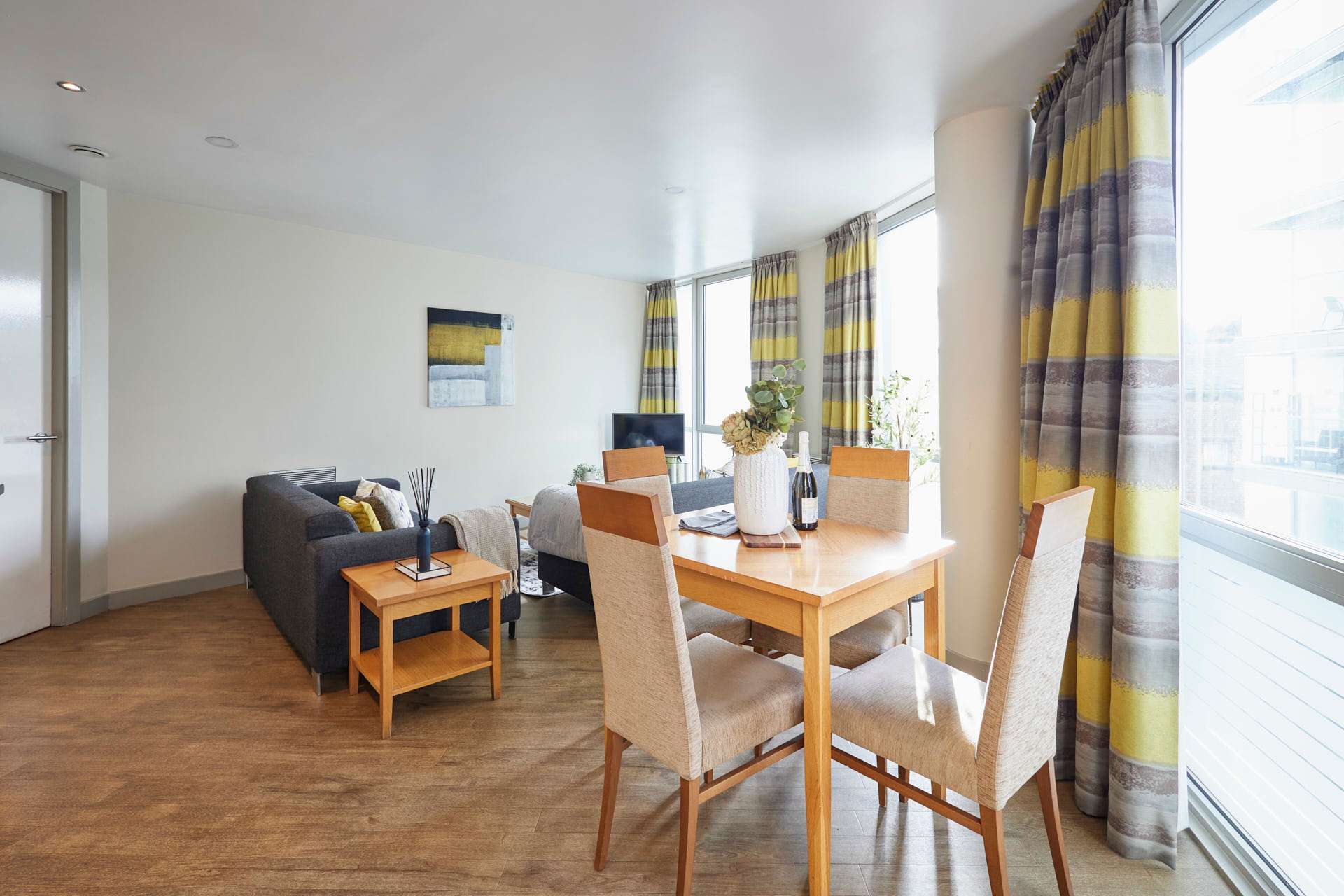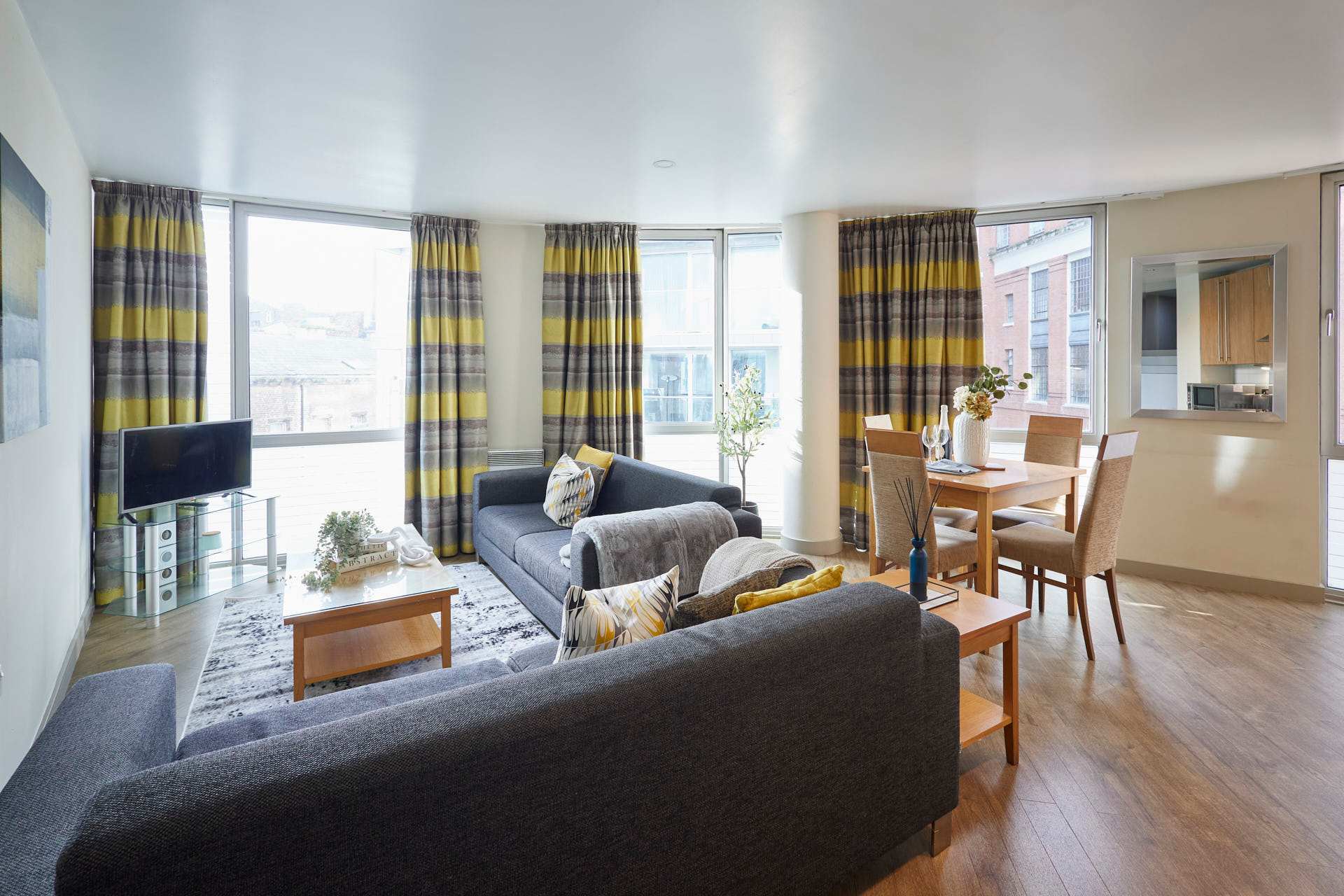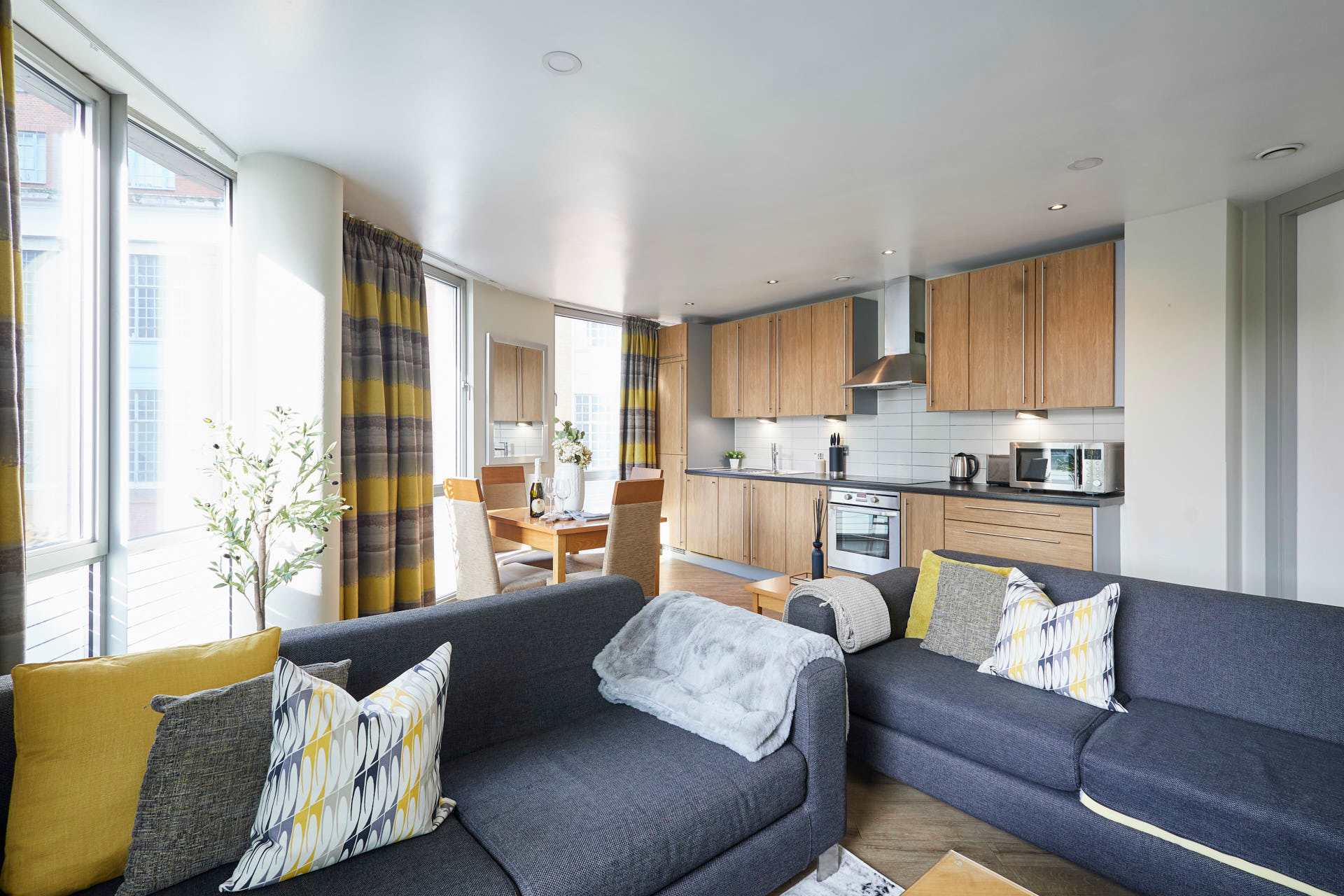 Step inside and be greeted by a bright, stylish apartment designed with comfort and simplicity in mind. The clean décor, contemporary furnishings, and abundance of natural light create a relaxing space where you can truly unwind. The open-plan living, dining, and kitchen area offers plenty of room to relax and recharge. Settle into the sofas after a day of sightseeing, catch up on your favourite shows on the flat-screen TV, or simply enjoy a quiet evening with a book. Next to the large window, the dining area provides a light and welcoming spot for shared meals. With its minimalist design and light wood furniture, it’s perfect for slow breakfasts or cosy dinners with your partner. The modern kitchen is fully equipped with everything you need, including a dishwasher, fridge, freezer, kettle, microwave, oven, hob, and toaster - making cooking and dining in effortless. The bedrooms are both peaceful retreats featuring comfortable king-size beds and soft, inviting furnishings. Elegant touches of colour bring warmth to the spaces, while blackout curtains ensure a restful night’s sleep. A wardrobe and chest of drawers complete the room, offering plenty of storage during your stay. Combining modern design with a homely feel, 207 Hatton Garden is the perfect base for a relaxing Liverpool getaway.