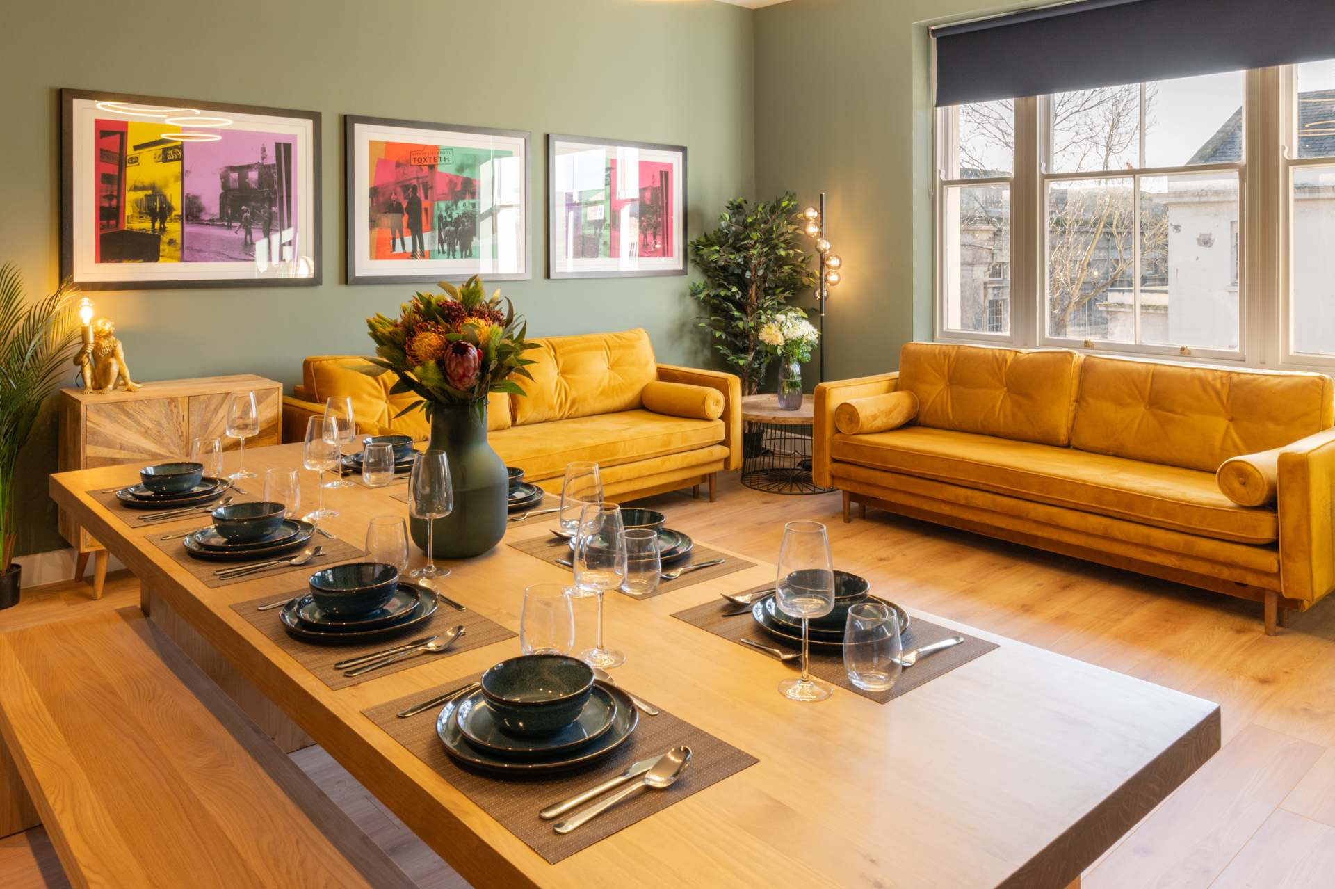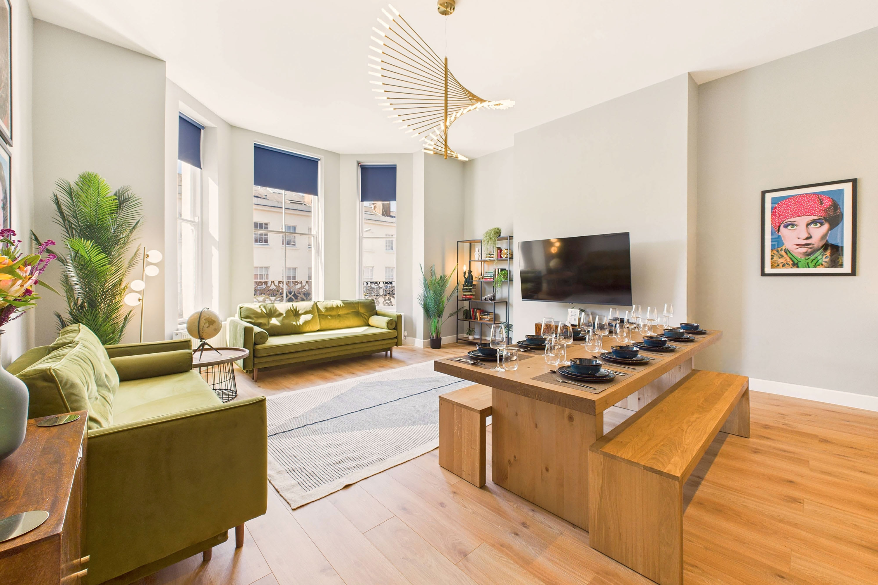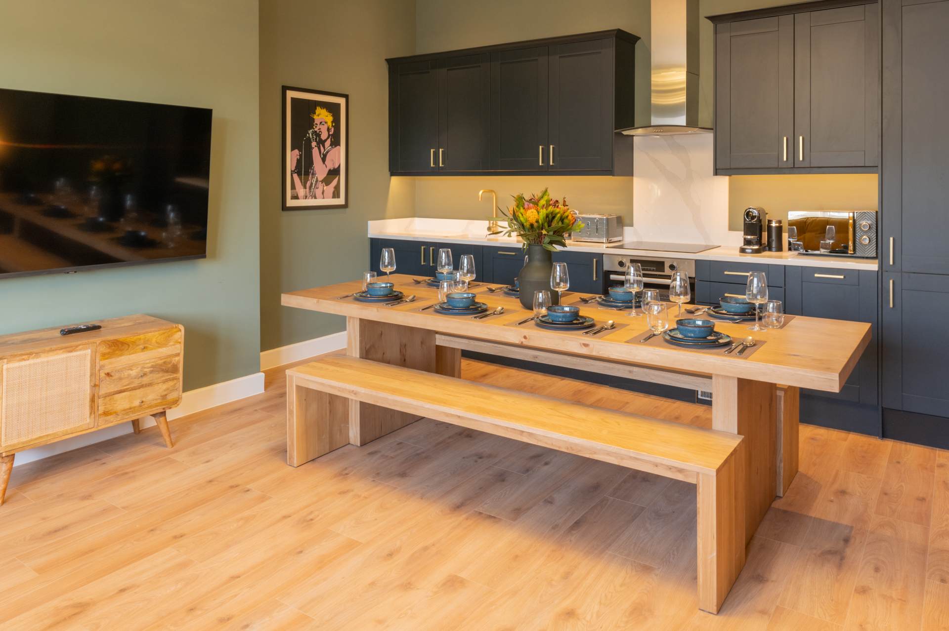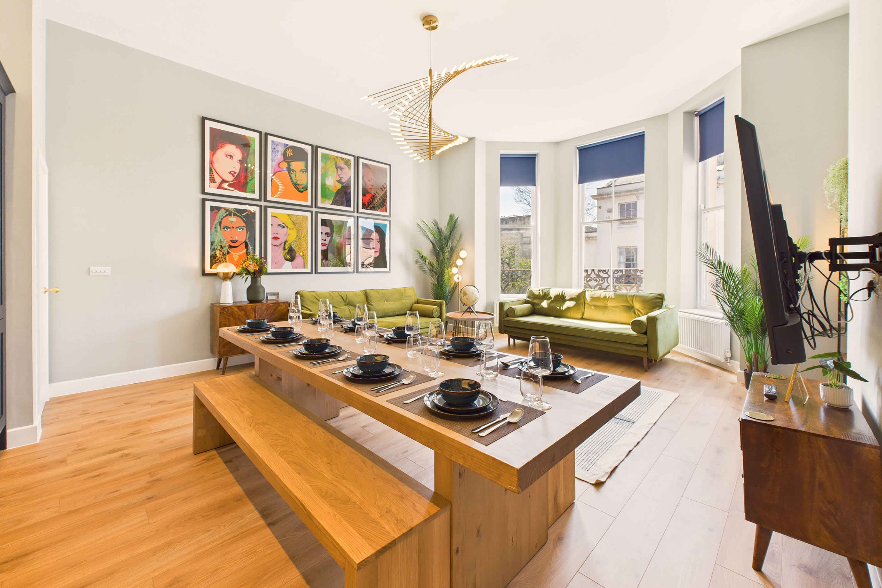 Located in a Grade II listed building, this combined listing offers the perfect accommodation for a getaway with friends, a family gathering, or a business stay! Both apartments are beautifully designed with contemporary furnishings, complemented by wooden flooring and elegant furniture. The space is bright and airy, featuring large windows with views of the neighbourhood and room-darkening blinds for added privacy and comfort. Each apartment boasts open-plan living, dining, and kitchen areas. The living rooms include two sofa beds and large wall-mounted Smart TVs, providing a cosy spot to relax after a busy day. You'll have access to two fully equipped kitchens, each fitted with high-quality appliances, including a hob, oven, microwave, kettle, toaster, fridge/freezer, and a Nespresso coffee machine. The dining areas, furnished with wooden tables and matching benches, are perfect for enjoying meals together. The first apartment features three bedrooms and can accommodate up to 10 guests. The master bedroom boasts a comfortable king-size bed, while the second bedroom offers a double bed. The third bedroom offers three single bunk beds sleeping six guests. The master bedroom also includes an ensuite bathroom, equipped with a shower, WC, and basin. The second apartment includes three bedrooms: one with three single bunk beds that can sleep six guests, another with a double bed for two, and the master bedroom, which comes with a king-size bed and an ensuite bathroom featuring a shower, WC, and washbasin. All of the bedrooms are fitted with a desk that you can utilise for work or for vanity purposes. Nearly all of the rooms are equipped with Smart TVs – whether you're staying in or heading out, you're sure to have a wonderful time. Each apartment has its own family bathroom, designed with contemporary features and fitted with a WC, washbasin, and a bathtub with a rain shower overhead, plus an additional handheld shower.