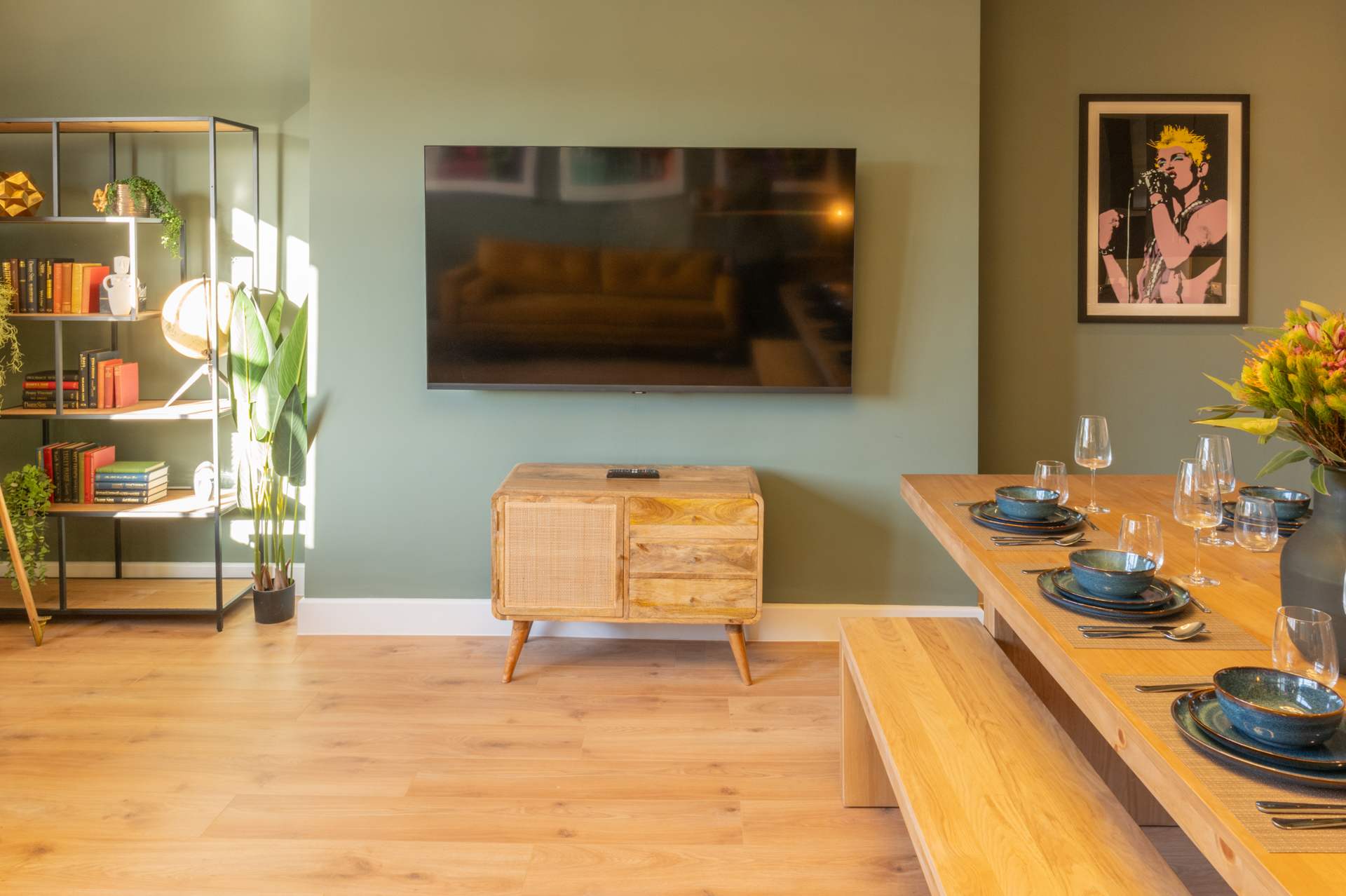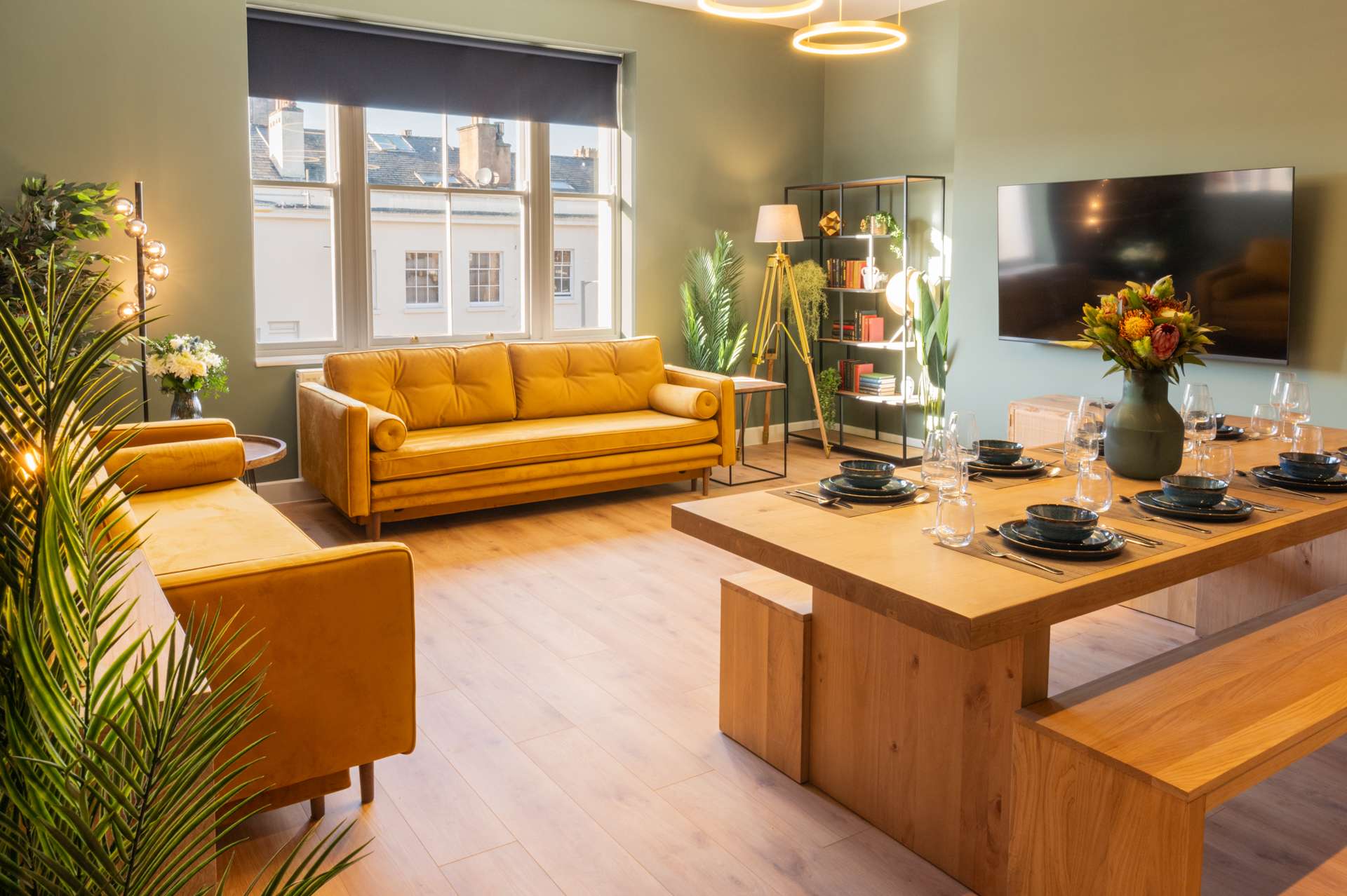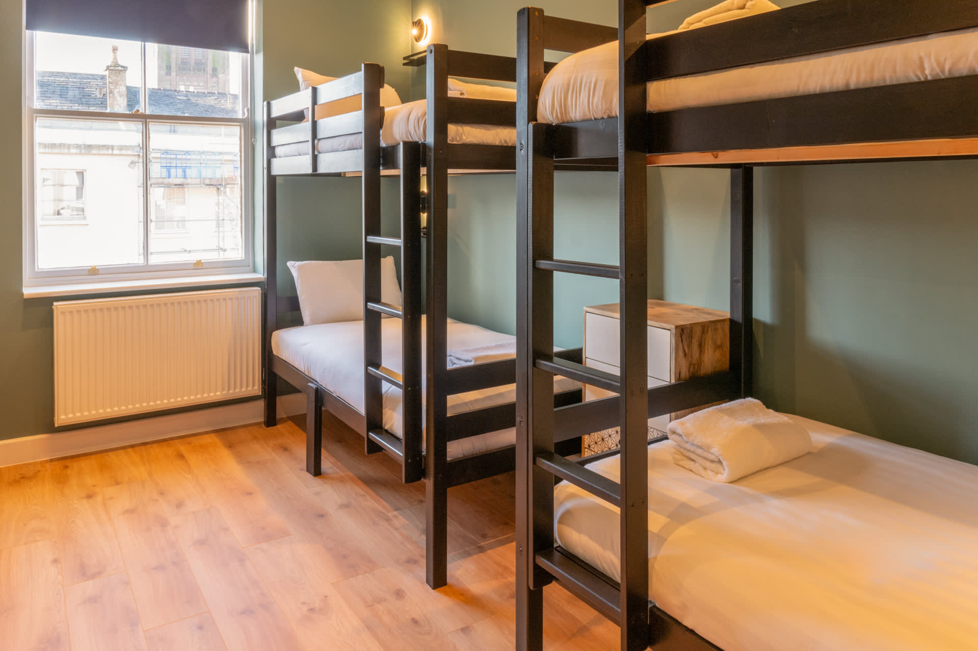 Located in a Grade II listed building, this combined listing offers the perfect accommodation for a getaway with friends, a family gathering, or a business stay! Both apartments are beautifully designed with contemporary furnishings, complemented by wooden flooring and elegant furniture. The space is bright and airy, featuring large windows with views of the neighbourhood and room-darkening blinds for added privacy and comfort. Each apartment boasts open-plan living, dining, and kitchen areas. The living rooms include two sofa beds and large wall-mounted Smart TVs, providing a cosy spot to relax after a busy day. You'll have access to two fully equipped kitchens, each fitted with high-quality appliances, including a hob, oven, microwave, kettle, toaster, fridge/freezer, and a Nespresso coffee machine. The dining areas, furnished with wooden tables and matching benches, are perfect for enjoying meals together. The first apartment features three bedrooms and can accommodate up to 10 guests. The master bedroom boasts a comfortable king-size bed, while the second bedroom offers a double bed. The third bedroom offers three single bunk beds sleeping six guests. The master bedroom also includes an ensuite bathroom, equipped with a shower, WC, and basin. The second apartment includes three bedrooms: one with three single bunk beds that can sleep six guests, another with a double bed for two, and the master bedroom, which comes with a king-size bed and an ensuite bathroom featuring a shower, WC, and washbasin. All of the bedrooms are fitted with a desk that you can utilise for work or for vanity purposes. Nearly all of the rooms are equipped with Smart TVs – whether you're staying in or heading out, you're sure to have a wonderful time. Each apartment has its own family bathroom, designed with contemporary features and fitted with a WC, washbasin, and a bathtub with a rain shower overhead, plus an additional handheld shower.