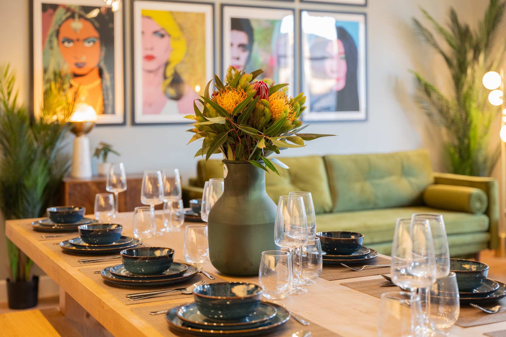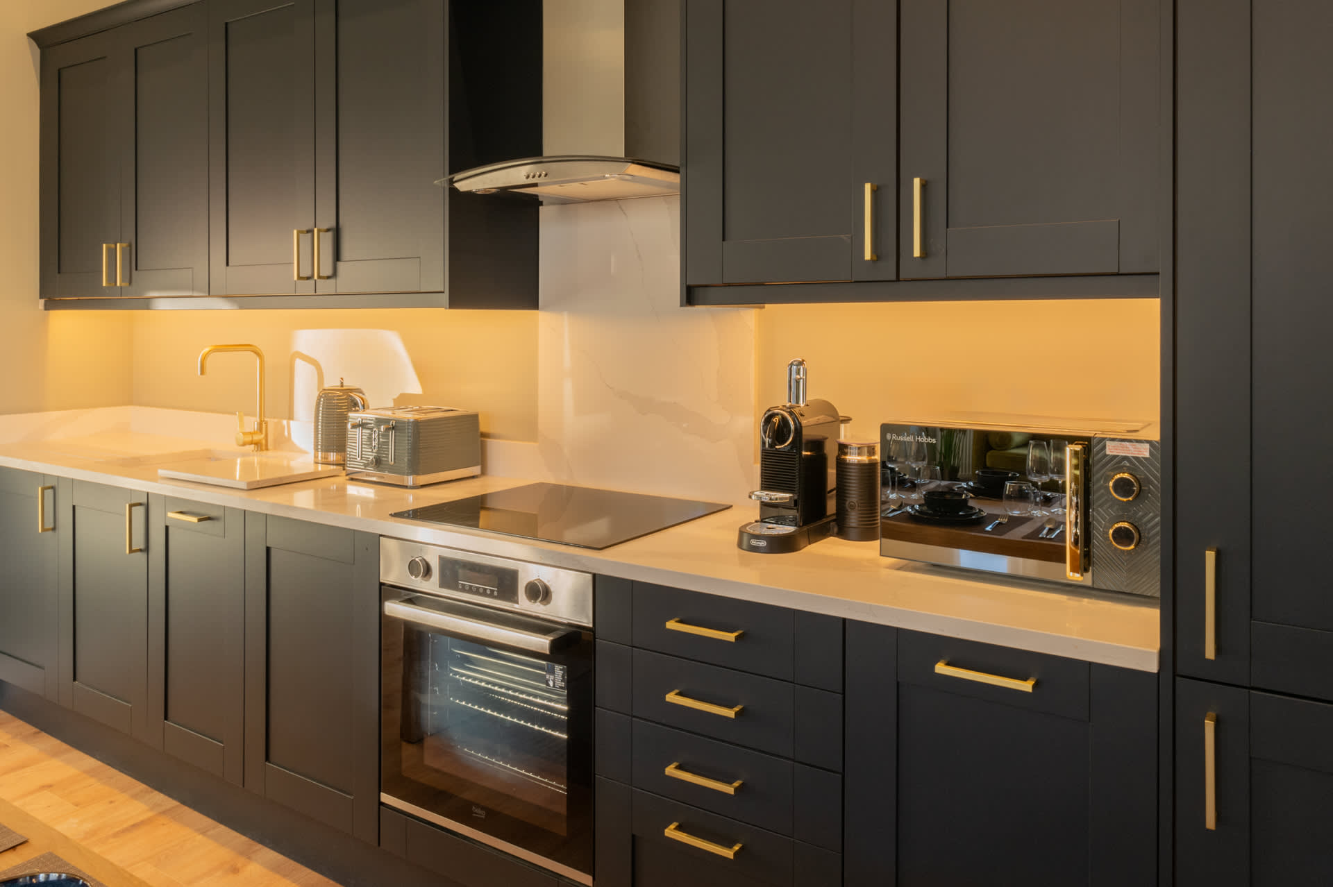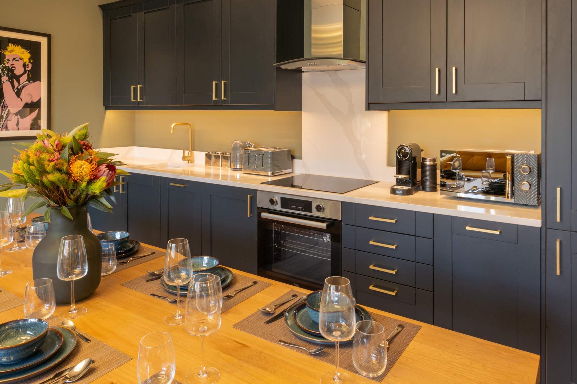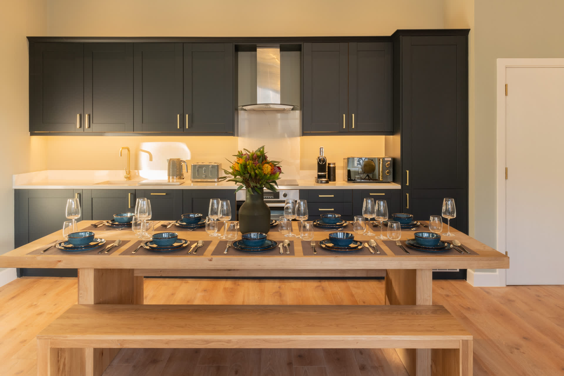 Located in a Grade II listed building, this combined listing offers the perfect accommodation for a getaway with friends, a family gathering, or a business stay! Both apartments are beautifully designed with contemporary furnishings, complemented by wooden flooring and elegant furniture. The space is bright and airy, featuring large windows with views of the neighbourhood and room-darkening blinds for added privacy and comfort. Each apartment boasts open-plan living, dining, and kitchen areas. The living rooms include two sofa beds and large wall-mounted Smart TVs, providing a cosy spot to relax after a busy day. You'll have access to two fully equipped kitchens, each fitted with high-quality appliances, including a hob, oven, microwave, kettle, toaster, fridge/freezer, and a Nespresso coffee machine. The dining areas, furnished with wooden tables and matching benches, are perfect for enjoying meals together. The first apartment features three bedrooms and can accommodate up to 10 guests. The master bedroom boasts a comfortable king-size bed, while the second bedroom offers a double bed. The third bedroom offers three single bunk beds sleeping six guests. The master bedroom also includes an ensuite bathroom, equipped with a shower, WC, and basin. The second apartment includes three bedrooms: one with three single bunk beds that can sleep six guests, another with a double bed for two, and the master bedroom, which comes with a king-size bed and an ensuite bathroom featuring a shower, WC, and washbasin. All of the bedrooms are fitted with a desk that you can utilise for work or for vanity purposes. Nearly all of the rooms are equipped with Smart TVs – whether you're staying in or heading out, you're sure to have a wonderful time. Each apartment has its own family bathroom, designed with contemporary features and fitted with a WC, washbasin, and a bathtub with a rain shower overhead, plus an additional handheld shower.