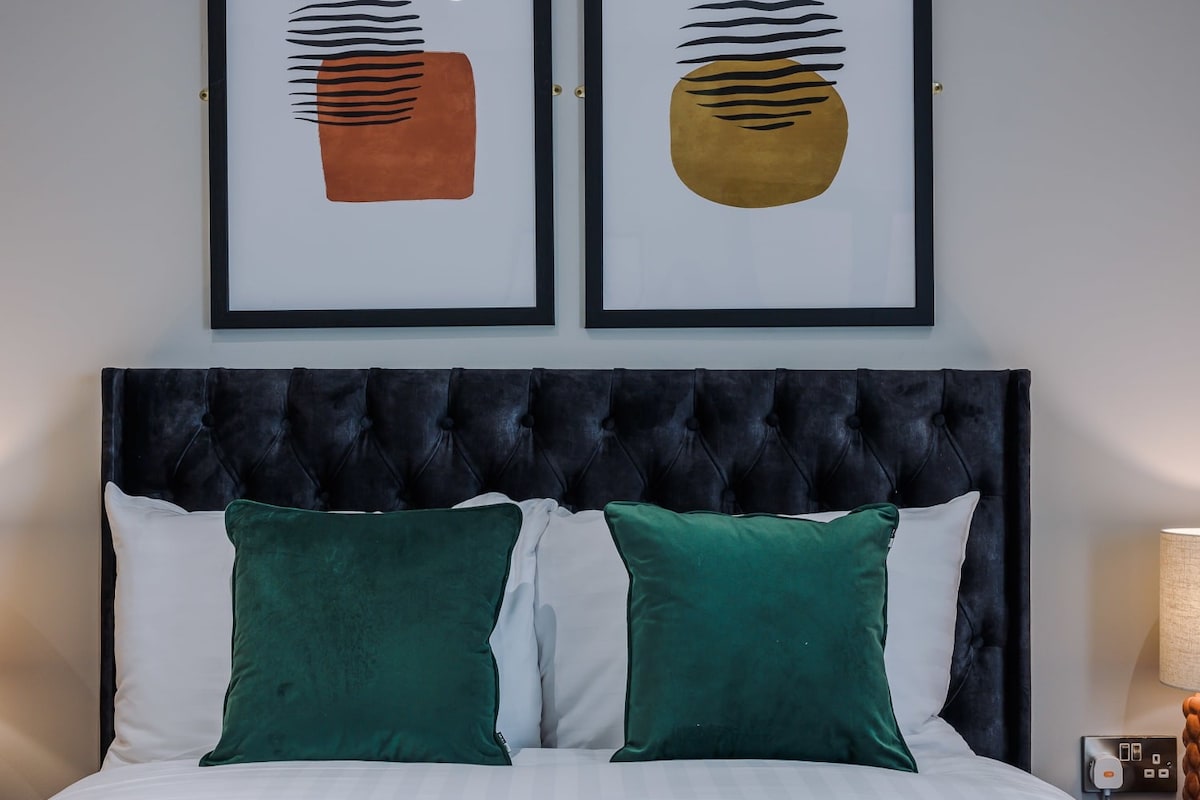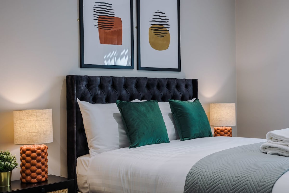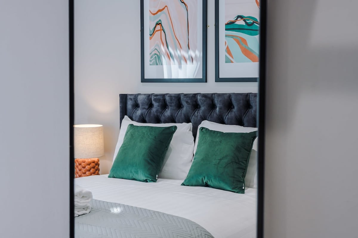A contemporary two-bedroom apartment, with plenty of of space for up to 6 guests. Newly refurbished, with two hotel standard double beds and a double sofa bed with a full deep sprung mattress in the lounge. The cosy interiors offer everything you could need for that home away from home feel. The apartment sleeps 6: Open-plan living/kitchen room: • Fitted with a double sofa bed sleeping up to 2 guests comfortably. • Equipped with a fully kitted kitchen with an integrated microwave, kettle, oven/hob, toaster, basic cookingware, fridge/freezer, Nespresso coffee machine, and more - everything you need for a comfortable stay. • Share a hearty meal with the group at the breakfast bar in the open-plan living/kitchen area. • Has a wall-mounted 50" Smart TV allowing you to stream your favourite online shows! Bedroom 1: • The master bedroom is fitted with a double-size bed sleeping up to 2 guests. • Has a wooden wardrobe for managing your clothes. • Comes with an ensuite bathroom that has toilet, sink, and a shower. Bedroom 2: • Fitted with a double-size bed sleeping up to 2 guests. • Has a hanging rail for managing your clothes! Main Bathroom: • Modern design fitted with a toilet, basin, and a shower over bath.