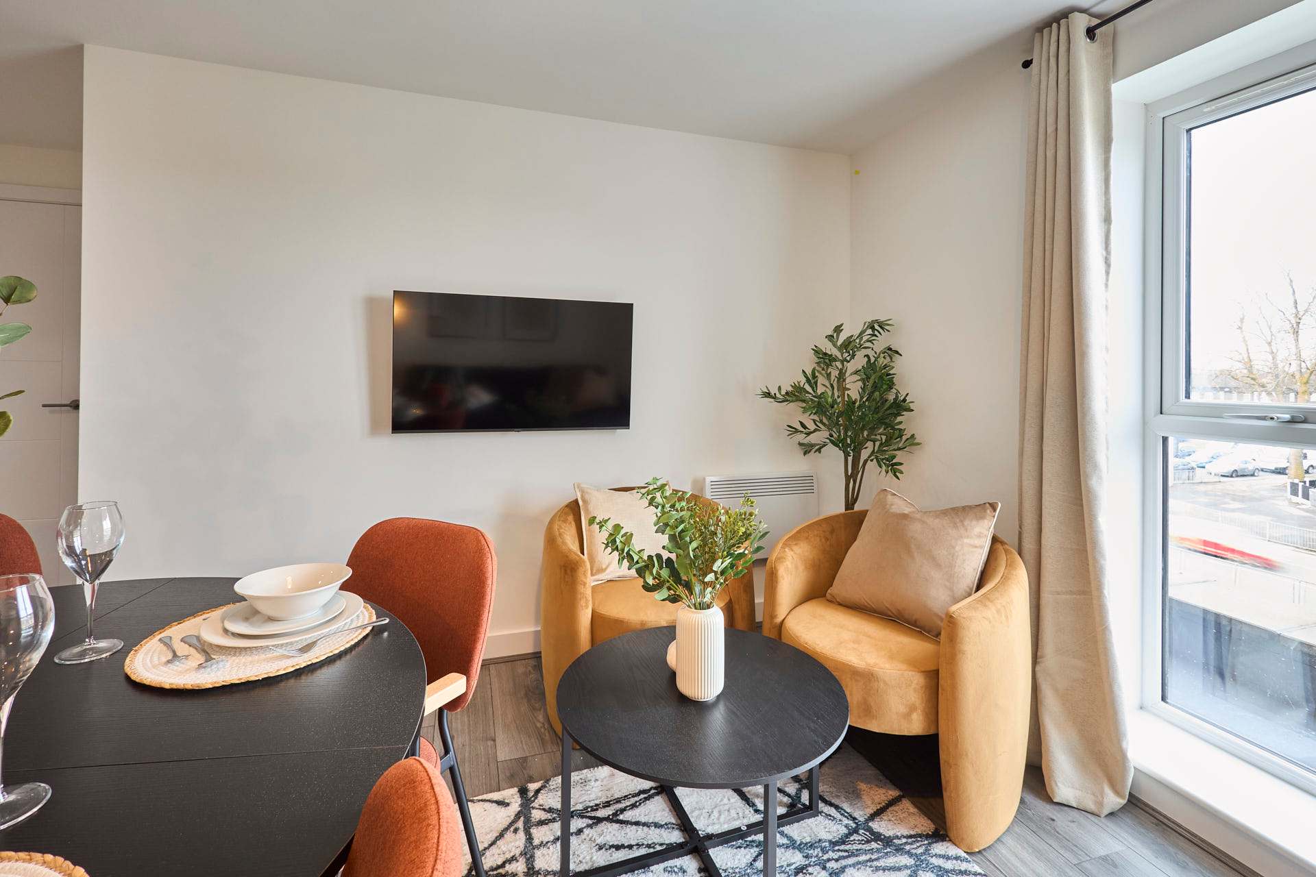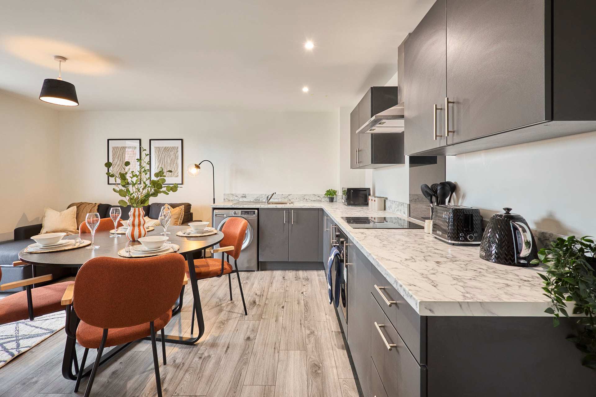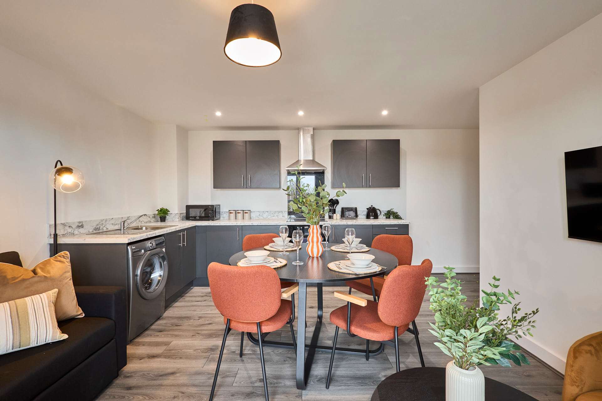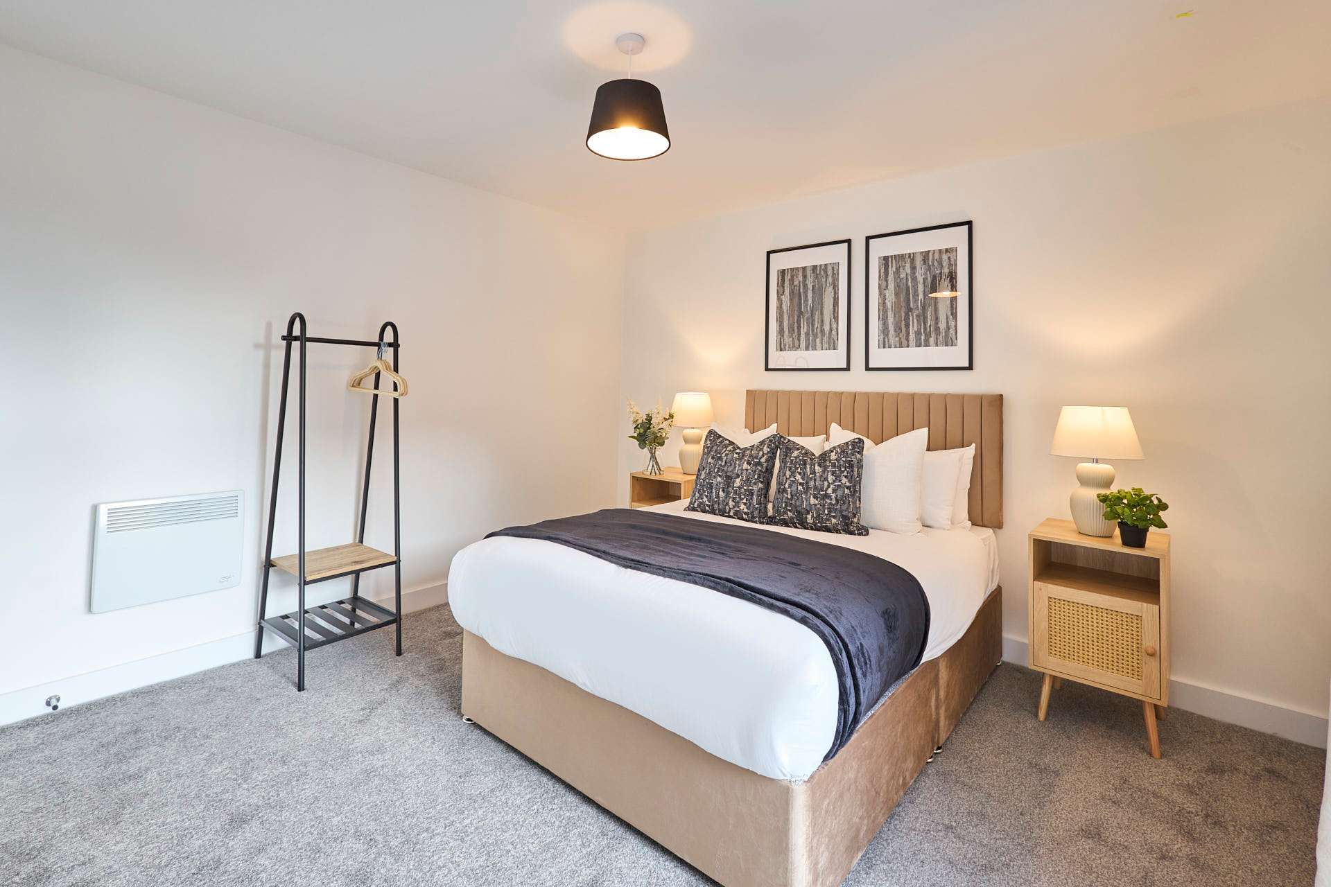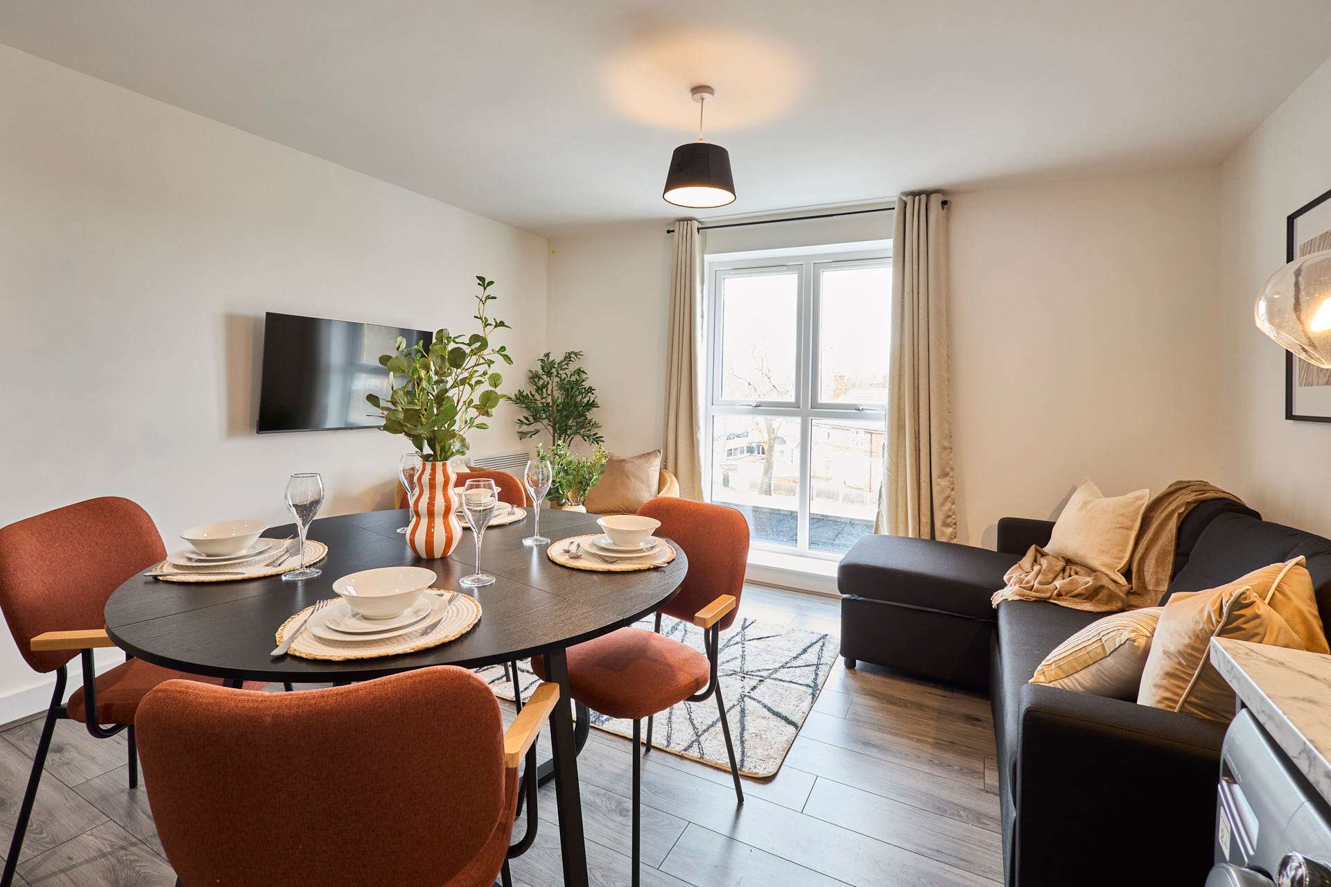 Bright and modern 2-bedroom apartment, designed with style and comfort in mind. Enjoy a light-filled living area, sleek décor, and a cozy dining space. Both bedrooms feature plush bedding and calming interiors for a restful stay. The contemporary bathroom includes a walk-in shower. Perfect for couples or small groups seeking a clean, stylish, and well-located Liverpool base.