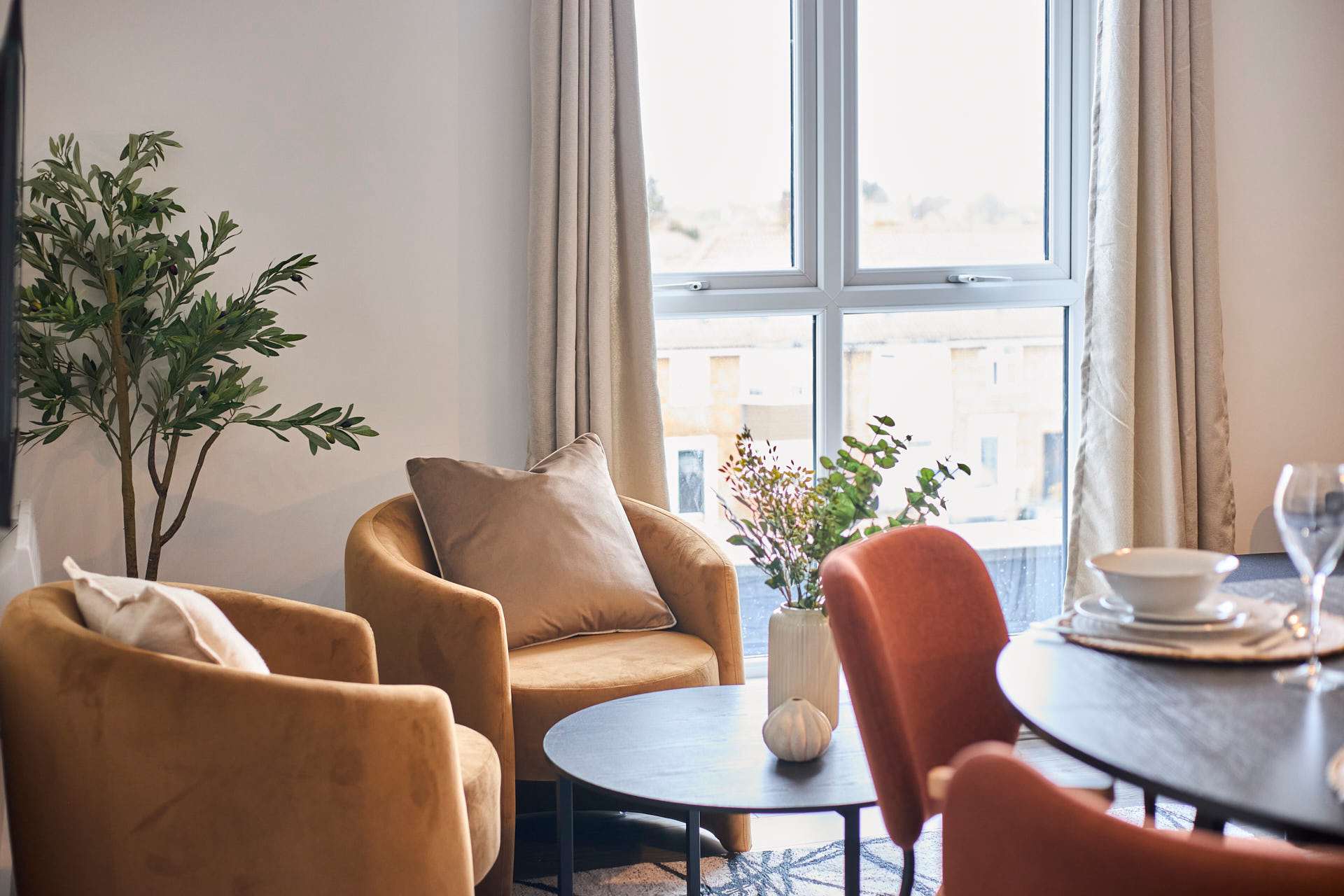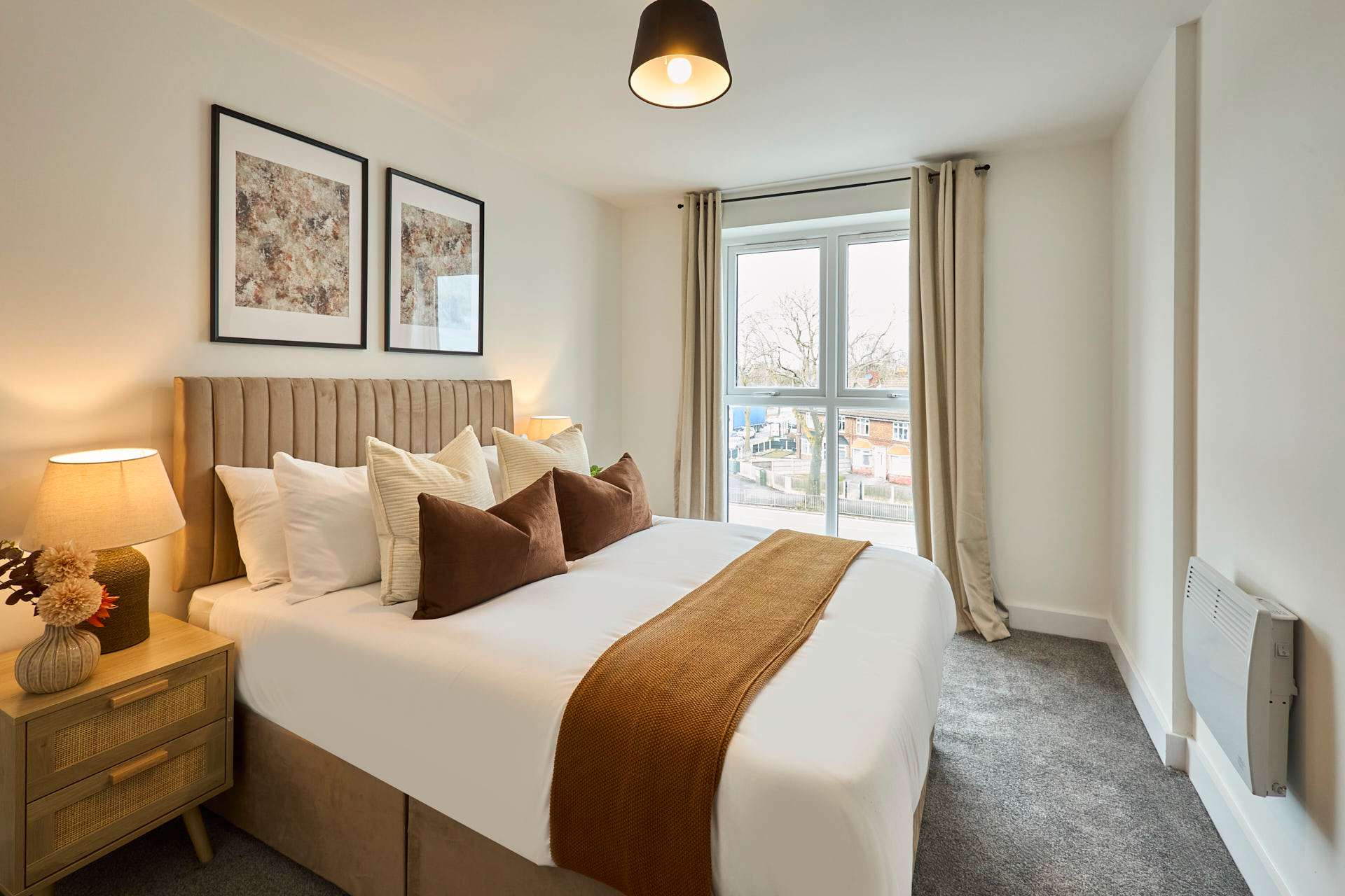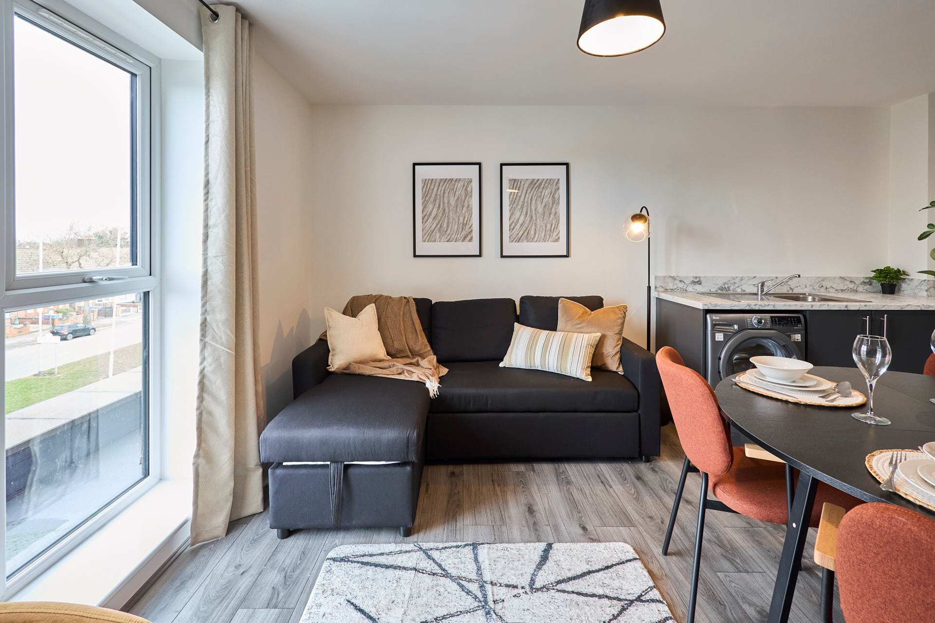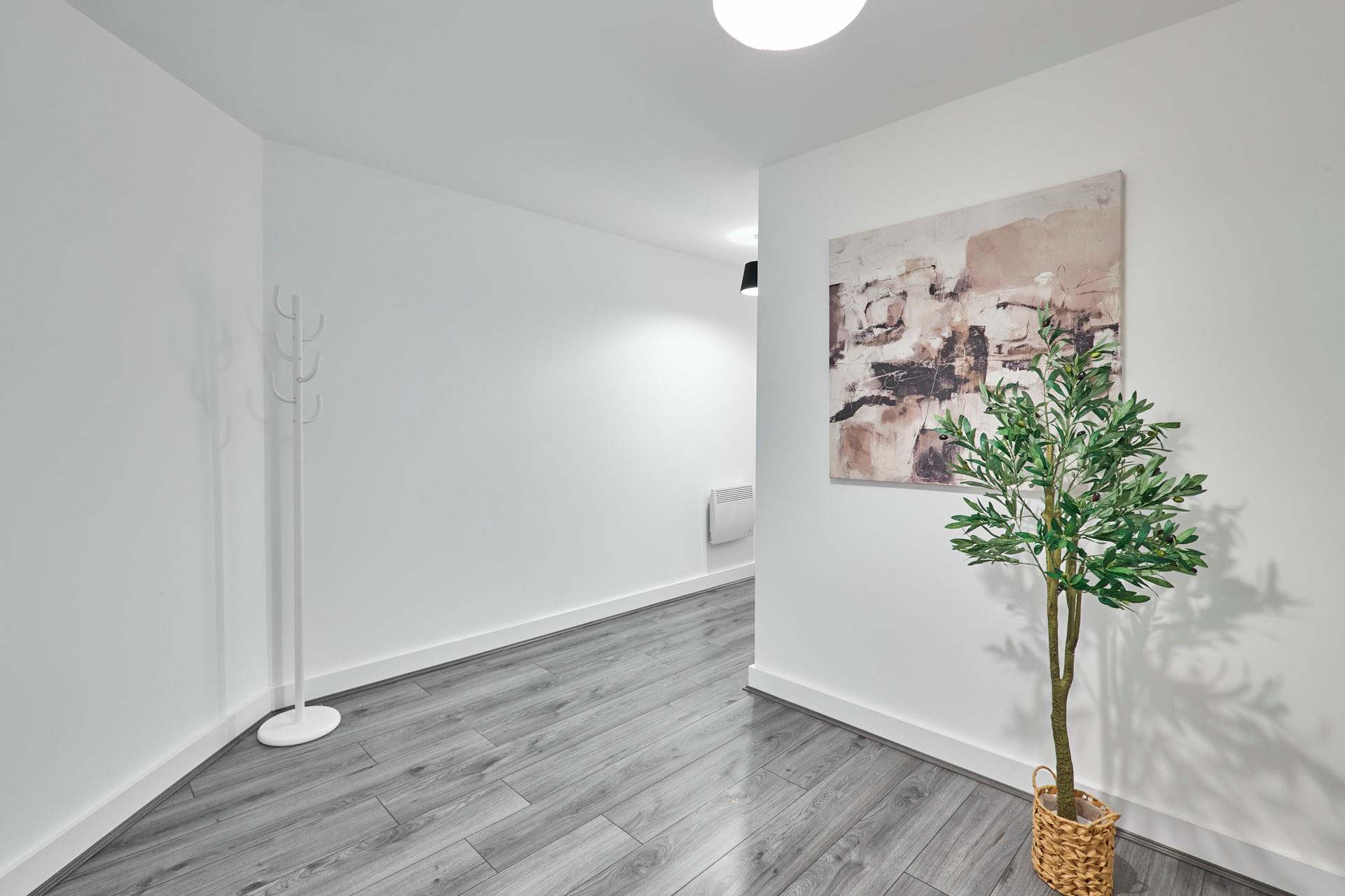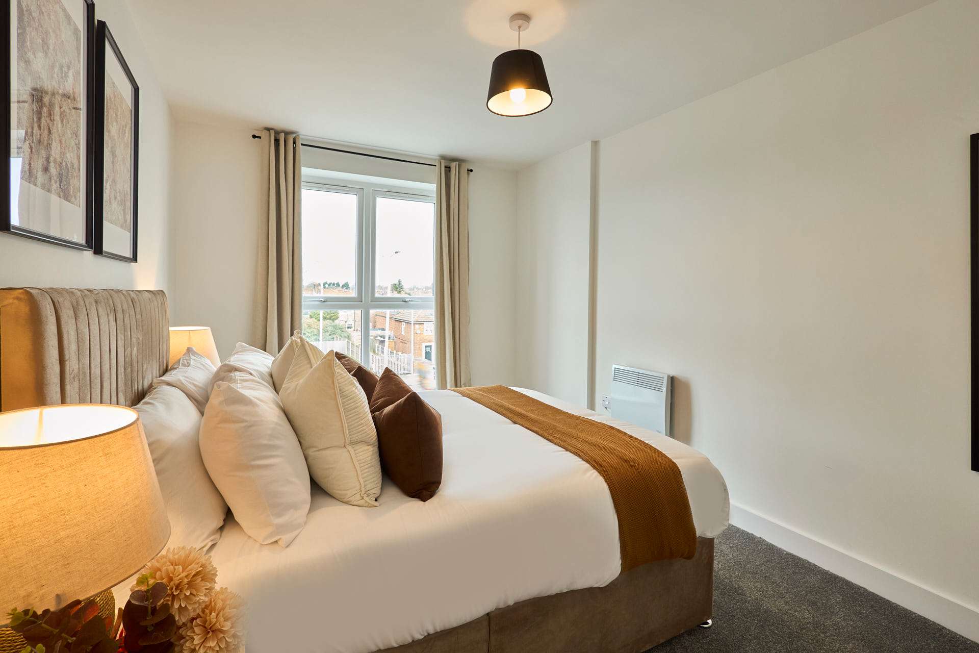 Bright and modern 2-bedroom apartment, designed with style and comfort in mind. Enjoy a light-filled living area, sleek décor, and a cozy dining space. Both bedrooms feature plush bedding and calming interiors for a restful stay. The contemporary bathroom includes a walk-in shower. Perfect for couples or small groups seeking a clean, stylish, and well-located Liverpool base.
