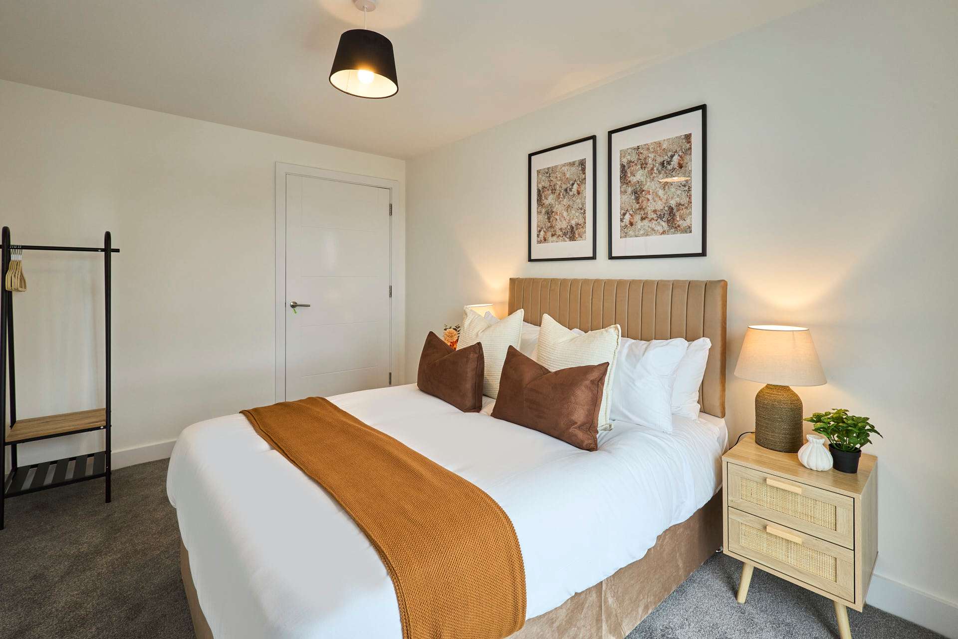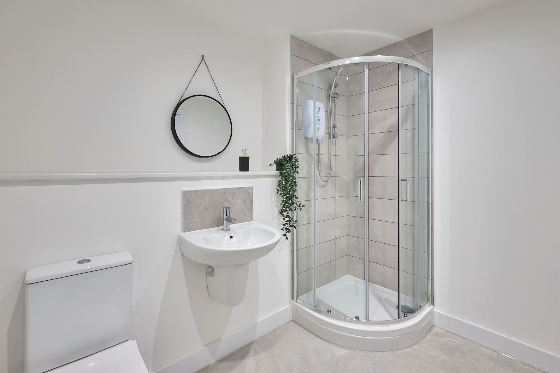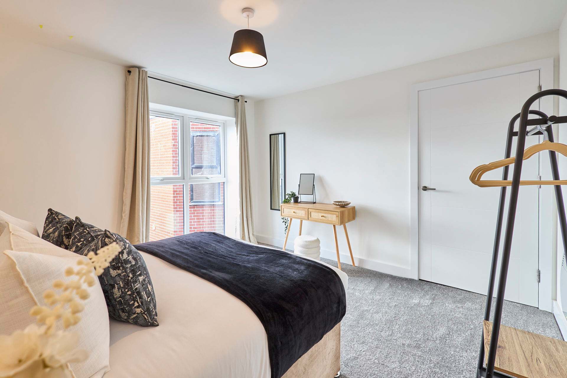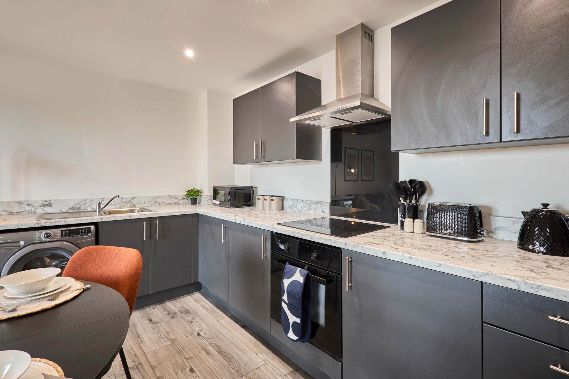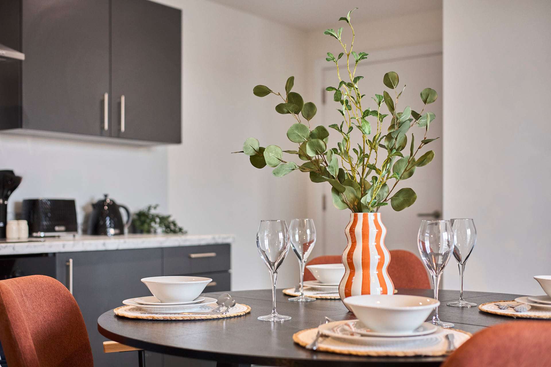 Bright and modern 2-bedroom apartment, designed with style and comfort in mind. Enjoy a light-filled living area, sleek décor, and a cozy dining space. Both bedrooms feature plush bedding and calming interiors for a restful stay. The contemporary bathroom includes a walk-in shower. Perfect for couples or small groups seeking a clean, stylish, and well-located Liverpool base.