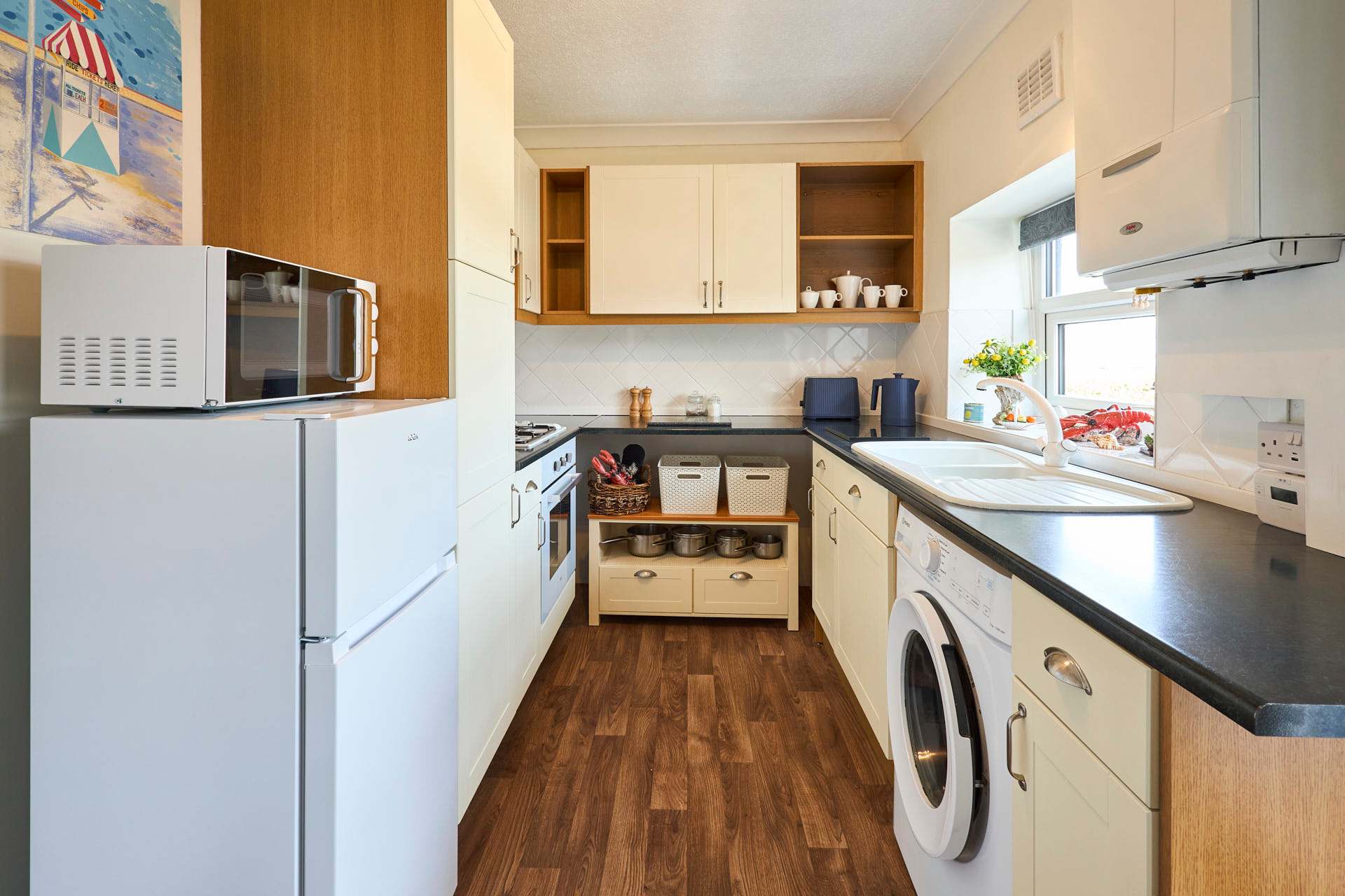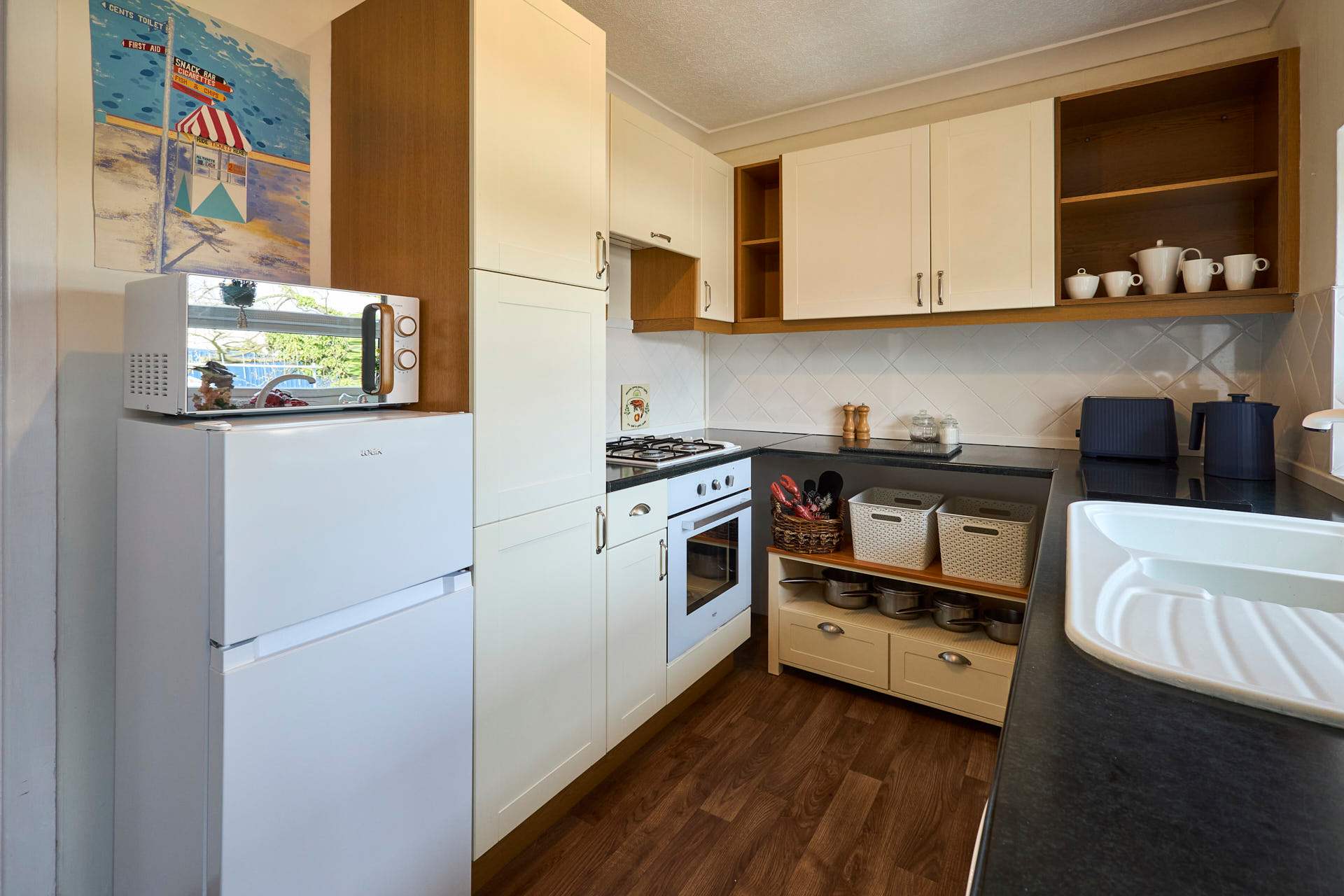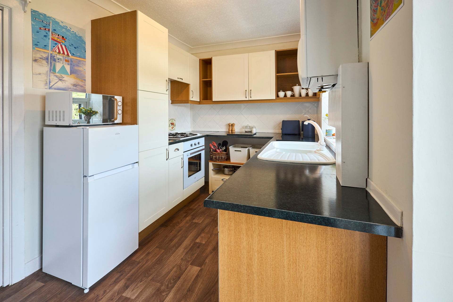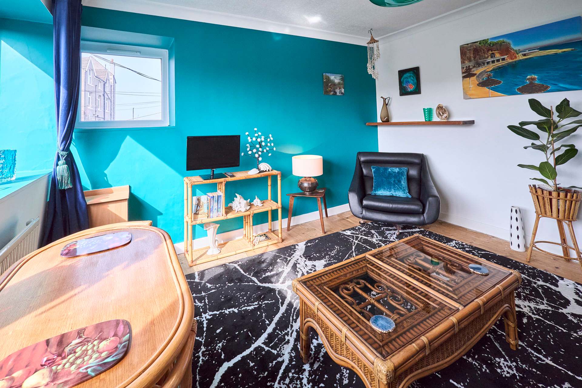 Step into a bright and characterful living space that perfectly captures the property’s quirky coastal charm. Flooded with natural light from a large picture window offering partial sea views, this inviting lounge is the ideal place to relax after a day by the shore. The room is styled with a playful mid-century fisherman’s cove aesthetic, elevated by bold teal walls and subtle touches of tiki-inspired décor. Comfortable leather seating is paired with vibrant cushions, while a rattan coffee table and matching dining set add warmth and texture to the space. A cosy dining nook by the window provides the perfect spot for morning coffee or a sunset drink, while thoughtfully chosen decorative pieces – including coastal accents and an original oil painting – give the room a personal, artistic feel. The well-equipped kitchen continues the property’s blend of practicality and personality, offering everything you need for a comfortable self-catering stay. Bright and neatly laid out, the space features ample worktop area, modern appliances including an oven, hob, microwave, and fridge-freezer, as well as plenty of storage for longer stays. Warm wood-effect flooring and soft neutral cabinetry are complemented by thoughtful decorative touches, creating a welcoming and homely feel. A window allows natural light to filter through, making the kitchen a pleasant space to prepare meals or enjoy a quiet morning coffee. At the far end, a charming feature wall with coastal-inspired wallpaper adds a playful nod to the seaside setting, tying in beautifully with the property’s quirky fisherman’s cove theme. There’s also a convenient washing machine and additional workspace, making this kitchen as functional as it is stylish—perfect for everything from quick breakfasts to relaxed evening dining. The bedroom offers an inviting retreat, thoughtfully styled for comfort and relaxation. A cosy double bed takes centre stage, dressed in vibrant, eye-catching bedding that adds a splash of personality while maintaining a restful atmosphere. A large picture window fills the room with natural light, creating a bright and airy feel throughout the day. The soft sage green feature wall brings a calming, nature-inspired tone to the space, perfectly balancing the bolder accents. Practical yet stylish, the room also includes a sleek wardrobe and a chic vanity unit, providing plenty of storage and a dedicated spot to get ready for the day ahead. Whether you’re winding down after a seaside stroll or enjoying a lazy morning lie-in, this bedroom is a comfortable and tranquil haven. The bathroom is fresh and modern, offering a clean and relaxing space to unwind. Crisp half-height tiling adds a sleek, contemporary feel while keeping the room bright and easy to maintain. A full-sized bath with an overhead shower provides the best of both worlds—perfect for a quick refresh after a day exploring the coast or a long, soothing soak in the evening. Finished with simple, stylish fittings and a light, airy atmosphere, the bathroom complements the property’s overall blend of comfort and thoughtful design.