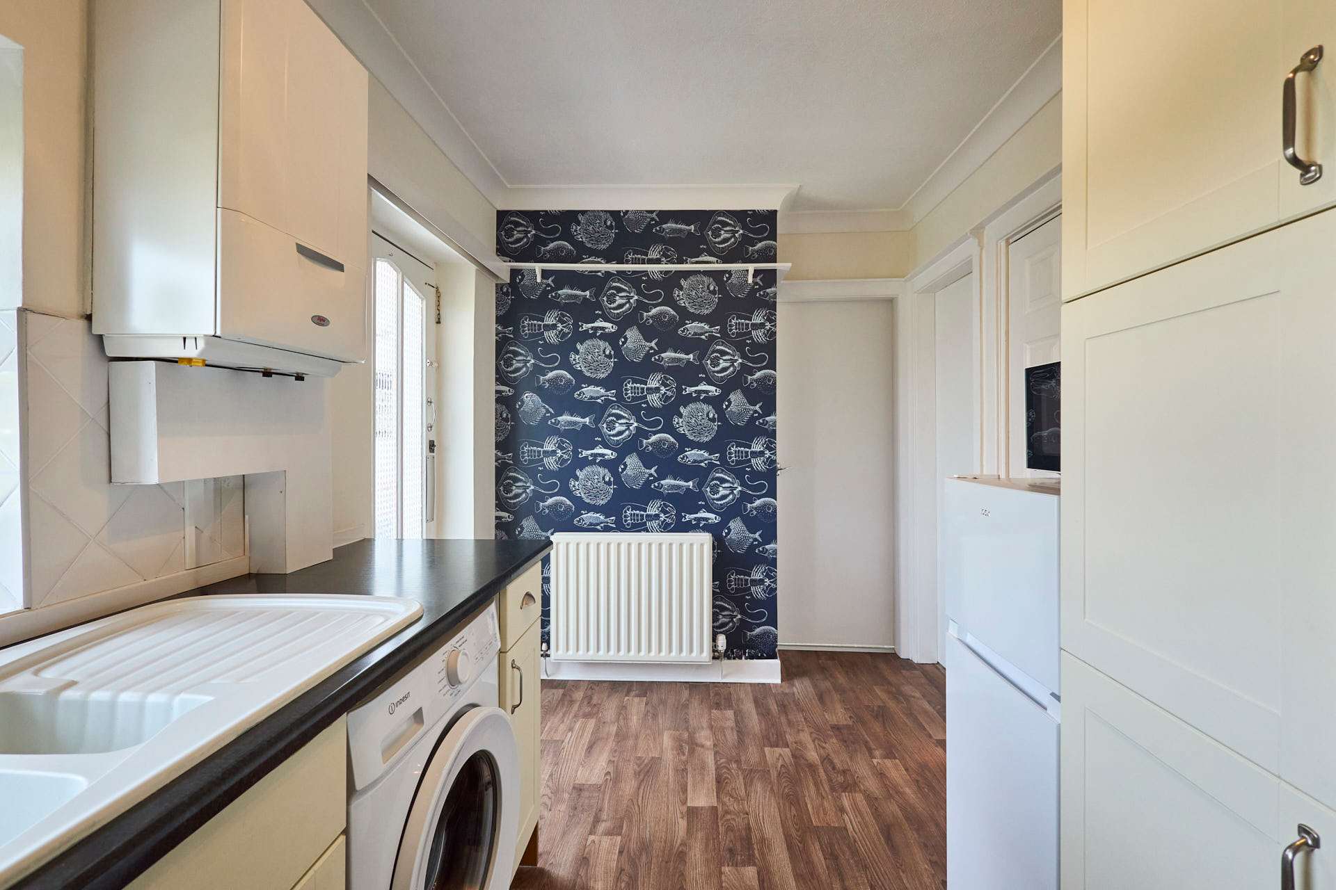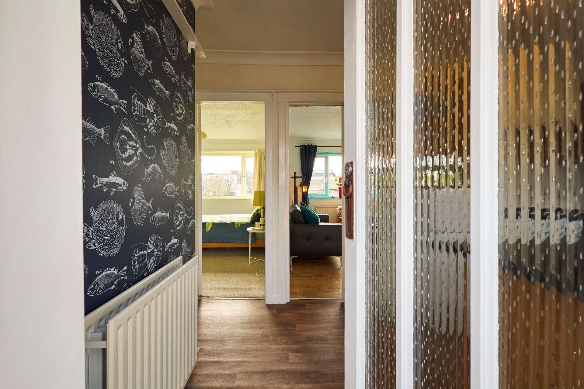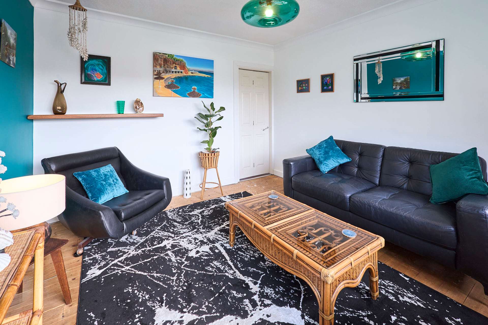 Step into a bright and characterful living space that perfectly captures the property’s quirky coastal charm. Flooded with natural light from a large picture window offering partial sea views, this inviting lounge is the ideal place to relax after a day by the shore. The room is styled with a playful mid-century fisherman’s cove aesthetic, elevated by bold teal walls and subtle touches of tiki-inspired décor. Comfortable leather seating is paired with vibrant cushions, while a rattan coffee table and matching dining set add warmth and texture to the space. A cosy dining nook by the window provides the perfect spot for morning coffee or a sunset drink, while thoughtfully chosen decorative pieces – including coastal accents and an original oil painting – give the room a personal, artistic feel. The well-equipped kitchen continues the property’s blend of practicality and personality, offering everything you need for a comfortable self-catering stay. Bright and neatly laid out, the space features ample worktop area, modern appliances including an oven, hob, microwave, and fridge-freezer, as well as plenty of storage for longer stays. Warm wood-effect flooring and soft neutral cabinetry are complemented by thoughtful decorative touches, creating a welcoming and homely feel. A window allows natural light to filter through, making the kitchen a pleasant space to prepare meals or enjoy a quiet morning coffee. At the far end, a charming feature wall with coastal-inspired wallpaper adds a playful nod to the seaside setting, tying in beautifully with the property’s quirky fisherman’s cove theme. There’s also a convenient washing machine and additional workspace, making this kitchen as functional as it is stylish—perfect for everything from quick breakfasts to relaxed evening dining. The bedroom offers an inviting retreat, thoughtfully styled for comfort and relaxation. A cosy double bed takes centre stage, dressed in vibrant, eye-catching bedding that adds a splash of personality while maintaining a restful atmosphere. A large picture window fills the room with natural light, creating a bright and airy feel throughout the day. The soft sage green feature wall brings a calming, nature-inspired tone to the space, perfectly balancing the bolder accents. Practical yet stylish, the room also includes a sleek wardrobe and a chic vanity unit, providing plenty of storage and a dedicated spot to get ready for the day ahead. Whether you’re winding down after a seaside stroll or enjoying a lazy morning lie-in, this bedroom is a comfortable and tranquil haven. The bathroom is fresh and modern, offering a clean and relaxing space to unwind. Crisp half-height tiling adds a sleek, contemporary feel while keeping the room bright and easy to maintain. A full-sized bath with an overhead shower provides the best of both worlds—perfect for a quick refresh after a day exploring the coast or a long, soothing soak in the evening. Finished with simple, stylish fittings and a light, airy atmosphere, the bathroom complements the property’s overall blend of comfort and thoughtful design.