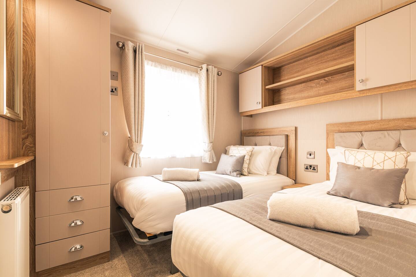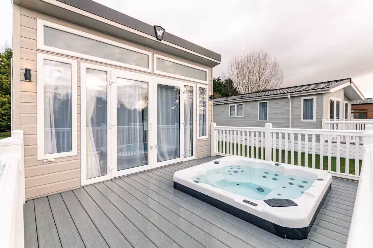 Welcome to Lakeside Retreat, a beautifully finished and luxurious two bedroom, two bathroom lodge designed for comfort and relaxation. Sleeping up to six guests, this stylish holiday home features a spacious double room, a cosy twin room and additional sleeping space on the sofa bed in the living area. The open-plan lounge benefits from soft neutral interiors, a feature fireplace and generous natural light, creating a warm and inviting space to unwind. The fully equipped kitchen offers everything you need for a home-from-home stay, including an oven, stovetop, dishwasher, fridge freezer and all essential cookware. Enjoy meals together at the stylish dining area, or step out through the patio doors to your private deck. Outside, you will find a hot tub and comfortable seating overlooking the serene lake; the perfect spot for morning coffees, sundowner drinks or an evening soak under the stars. Set on a peaceful lodge park surrounded by nature, this retreat is ideal for those seeking tranquillity, scenic views and quality time with loved ones. Whether you're planning countryside walks, cosy evenings in or simple relaxation by the water, Lakeside Retreat provides an idyllic escape with everything you need for a restorative getaway.