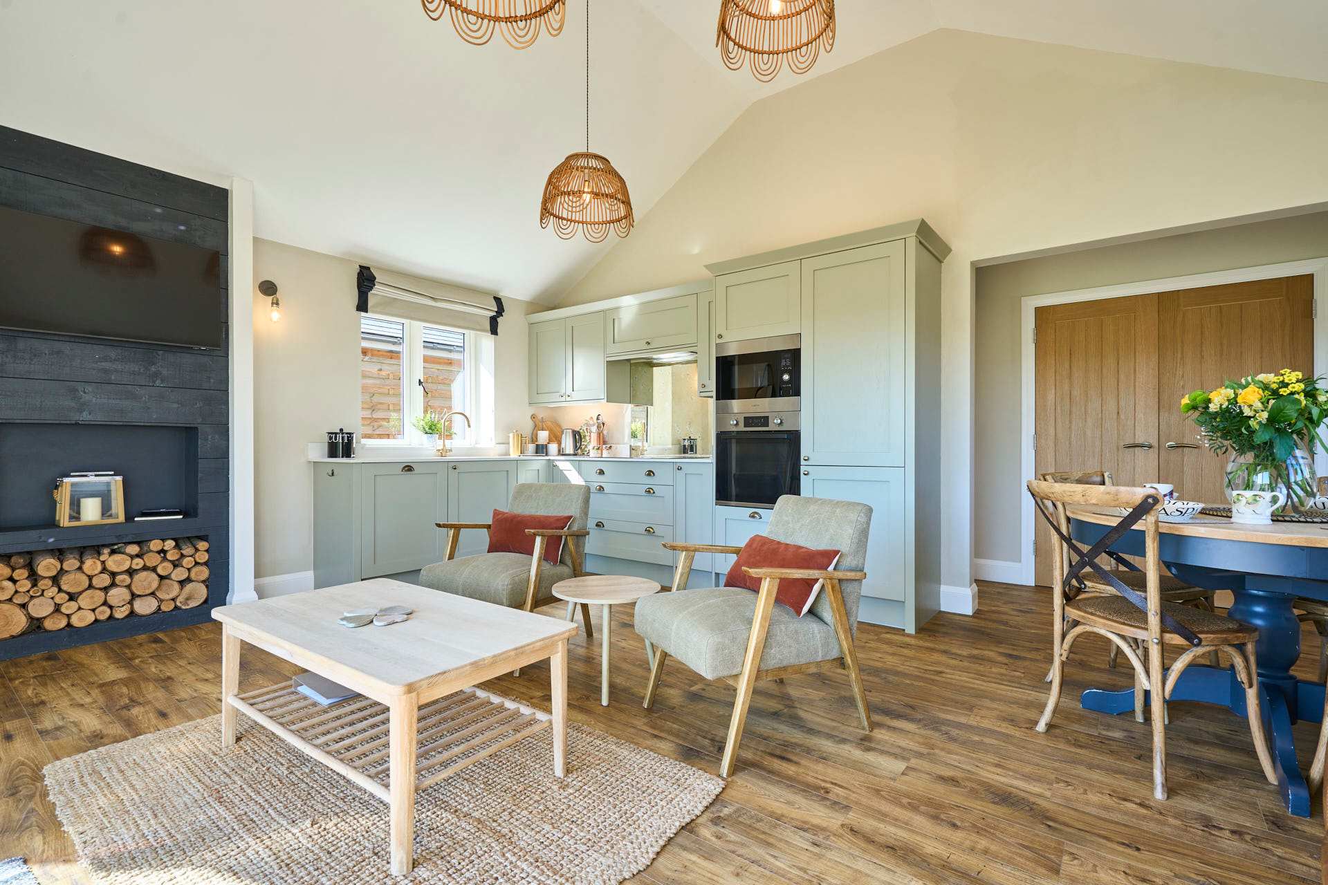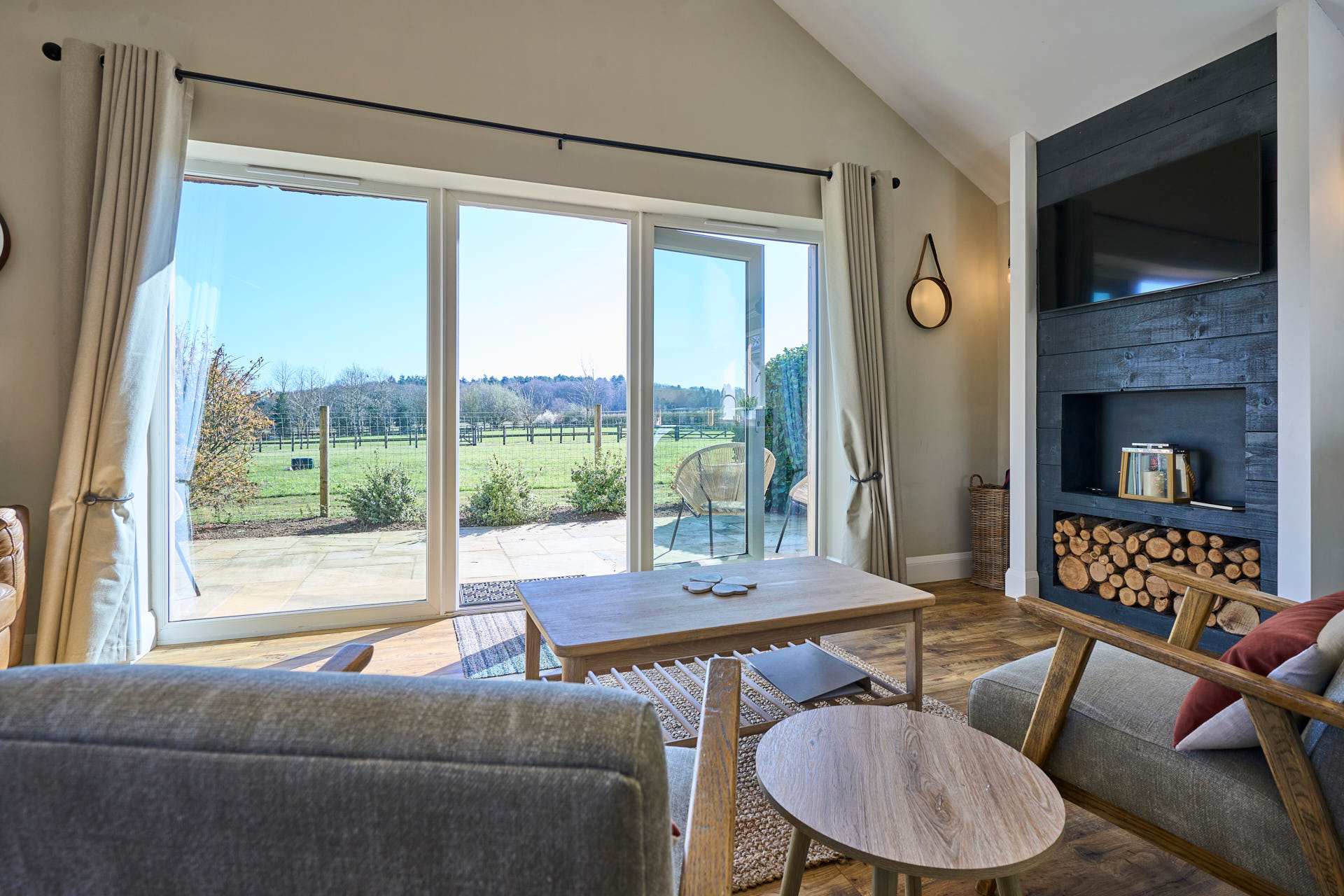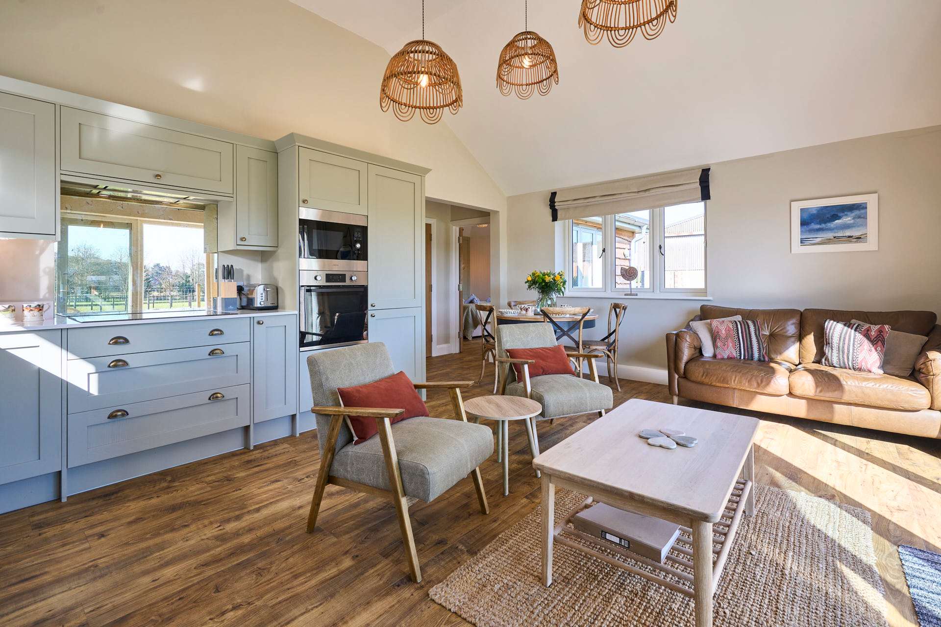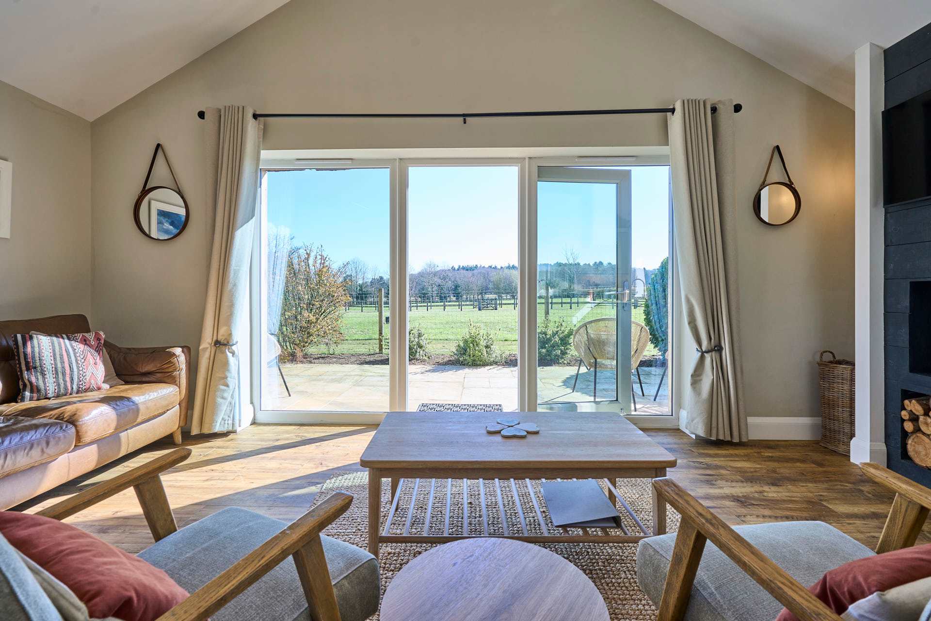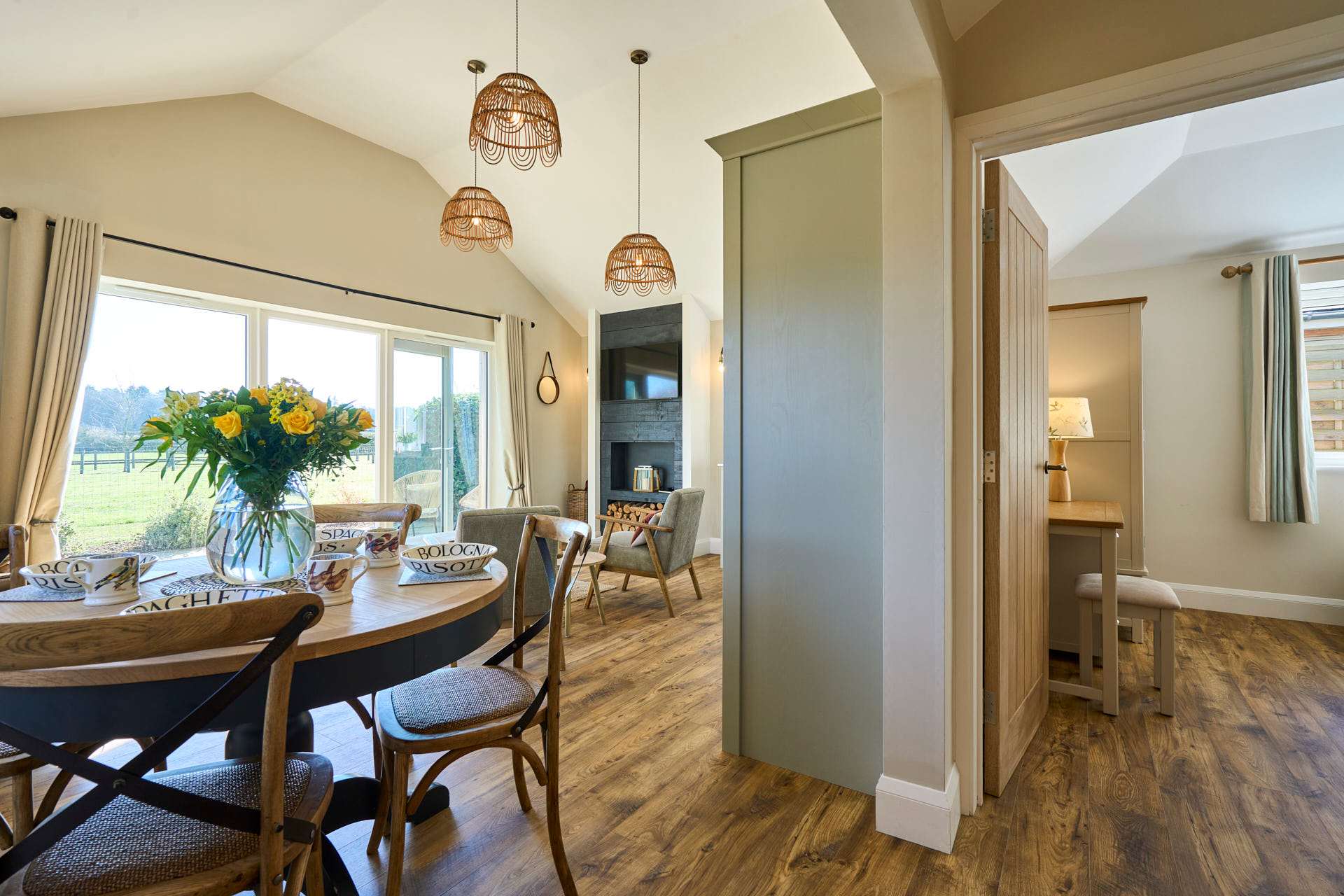 Escape to this beautifully designed 2-bedroom, 2-bathroom retreat, where the modern and chic style meets the calm of the countryside. Flooded with natural light, the open-plan living space is both airy and inviting, featuring elegant furnishings, soft neutral tones, and large glass doors that open out to picturesque views and a private outdoor seating area. The contemporary kitchen is fully equipped with modern appliances and flows seamlessly into a stylish dining area, making it perfect for relaxed meals or entertaining. The cosy lounge provides a comfortable spot to unwind, whether you're enjoying a quiet evening or planning the next day’s adventures whilst admiring the beautiful landscape beyond. Each bedroom has been thoughtfully styled to create a peaceful haven, complete with plush bedding, warm textures, and plenty of storage. The two modern bathrooms are finished to a high standard, offering both convenience and a touch of luxury. Set in a tranquil location, this property is ideal for couples, families, or friends looking to enjoy a relaxing break with all the comforts of a beautifully curated home.