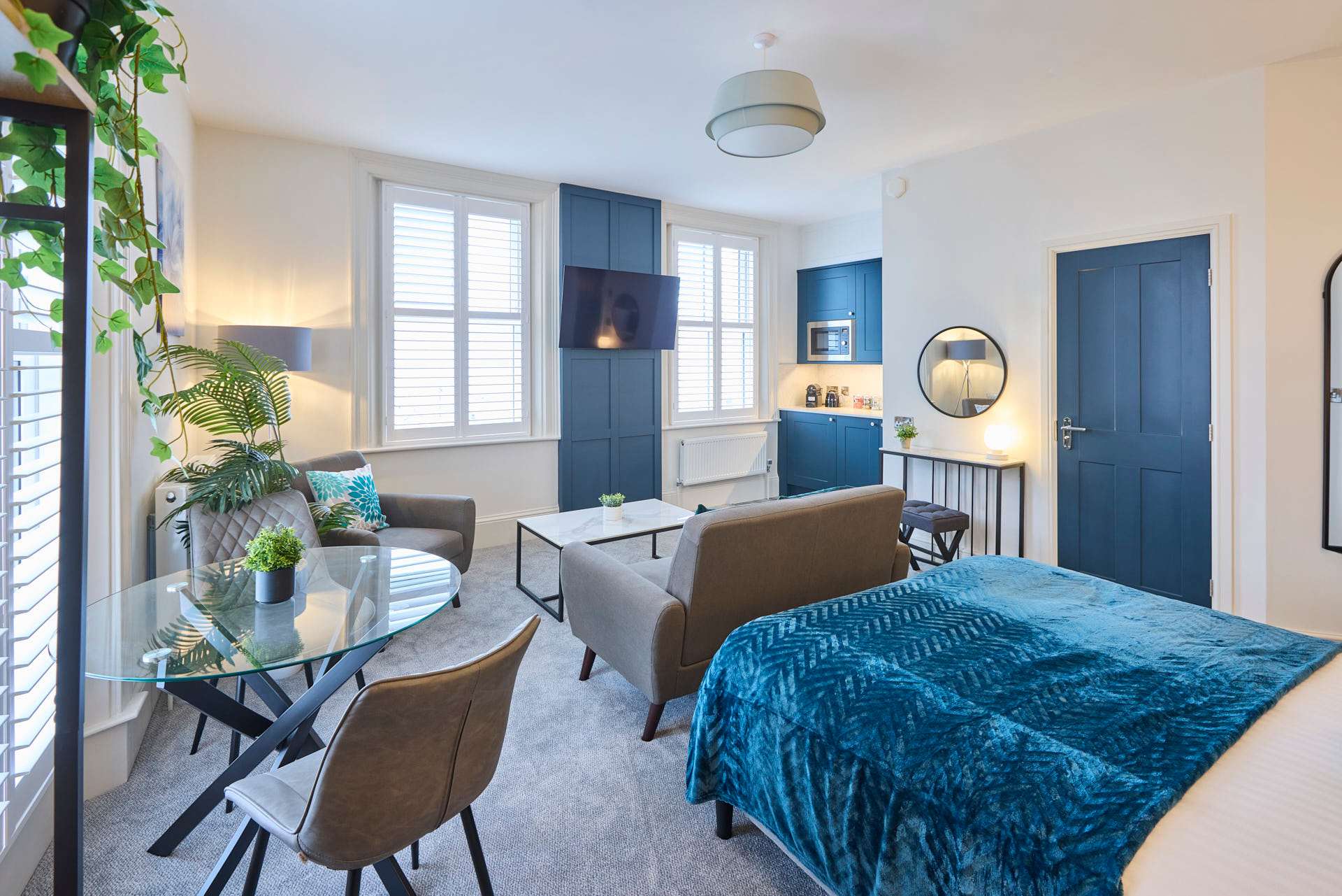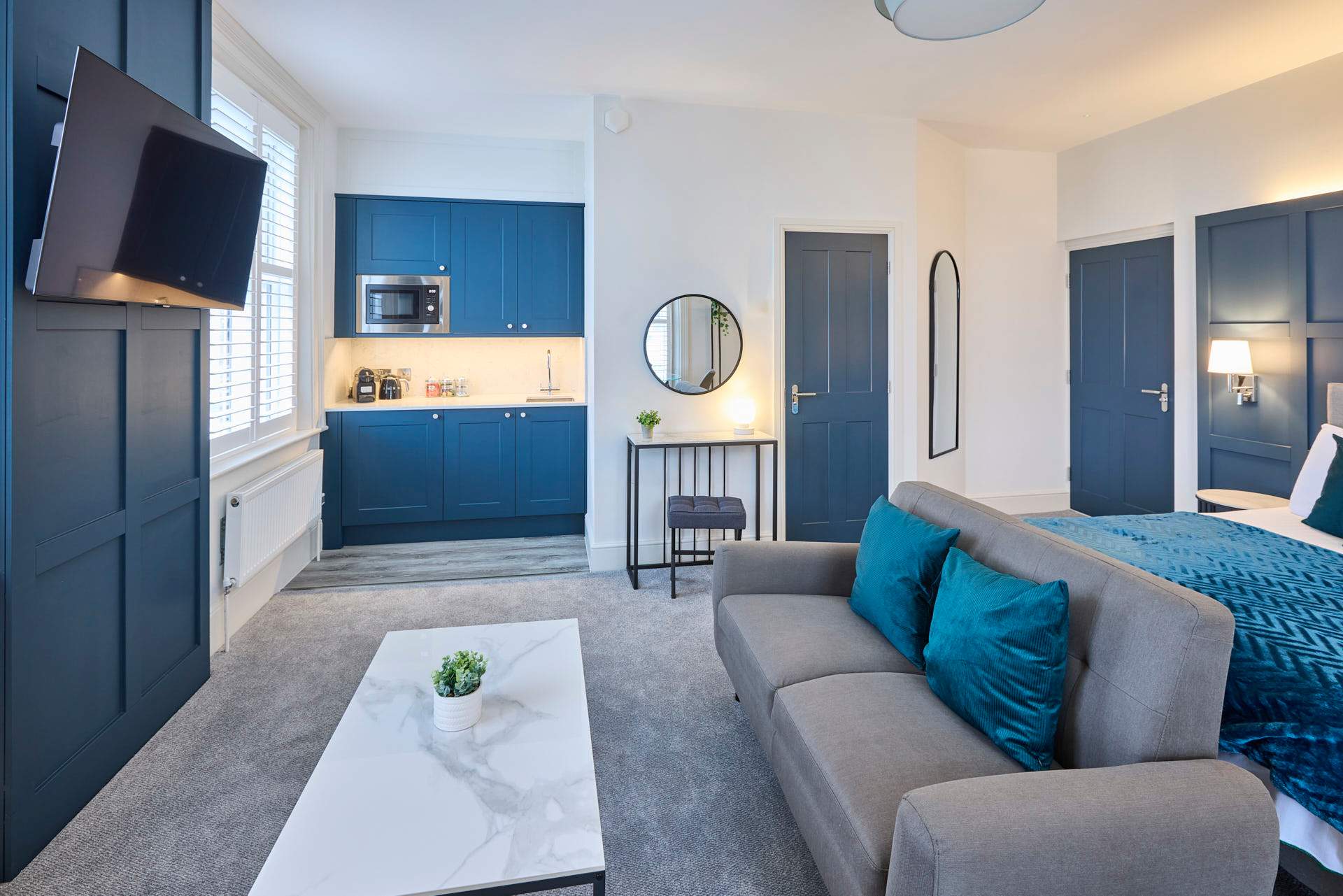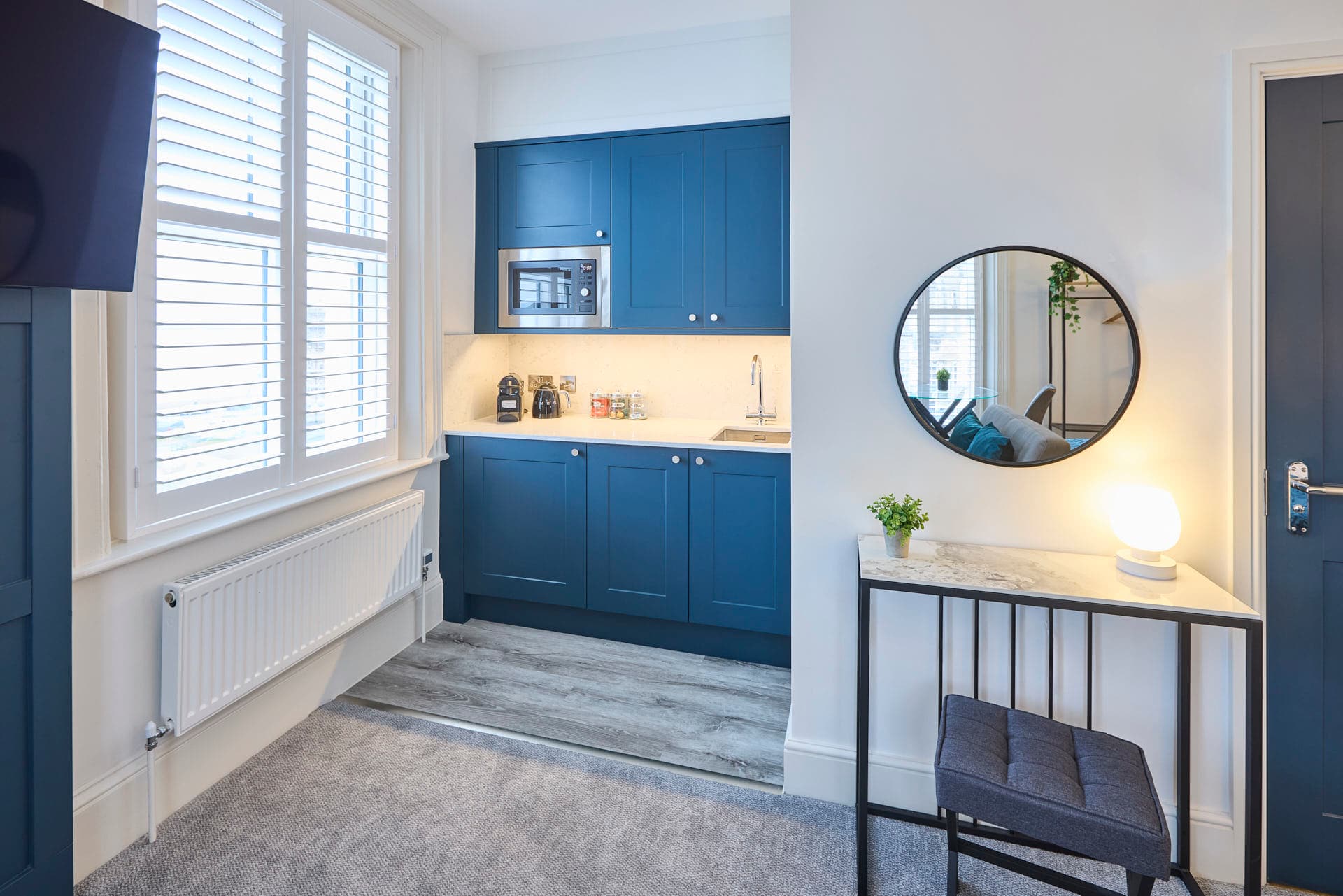 Apartment 5 at The Langley Apartments is a large, bright studio that has been newly refurbished to an exceptional standard. Surrounded by windows, the apartment is flooded with natural light, creating a fresh and airy atmosphere. Neutrally decorated throughout, it is enhanced by subtle coastal touches that bring a sense of calm and relaxation. A feature panel wall behind the bed adds character, while a wall-mounted flat-screen TV provides modern entertainment. The open-plan layout maximises space, making it perfect for unwinding after a day exploring Whitby and the local area. High-quality finishes and contemporary fixtures are evident throughout, from the sleek kitchenette equipped with modern appliances to the stylish bathroom, complete with a practical walk-in shower. Thoughtfully selected décor, inspired by the nearby coastline, adds warmth and charm without compromising the clean, modern aesthetic. Apartment 12 offers a serene and spacious retreat, combining high-standard refurbishment with timeless coastal appeal.