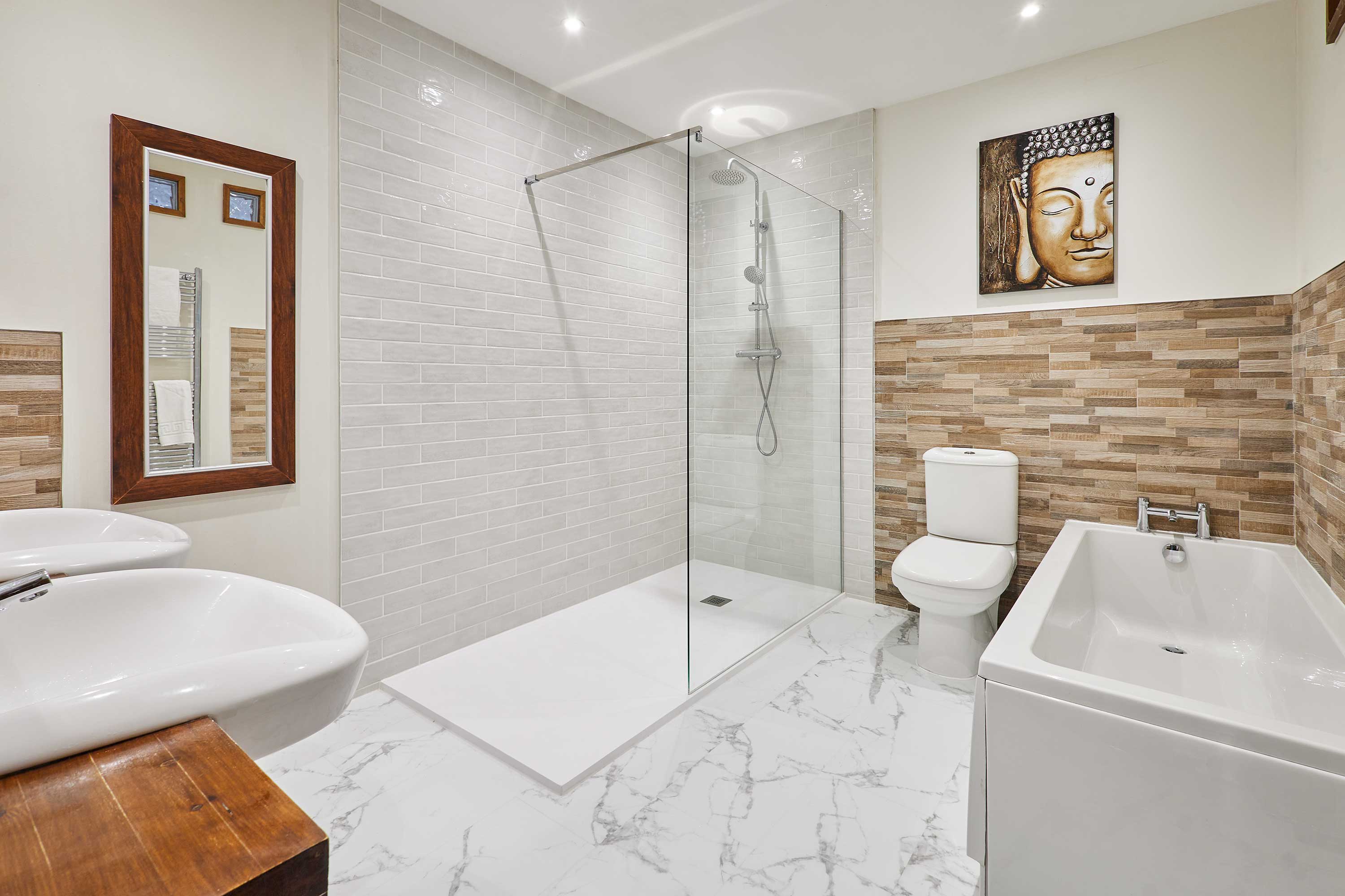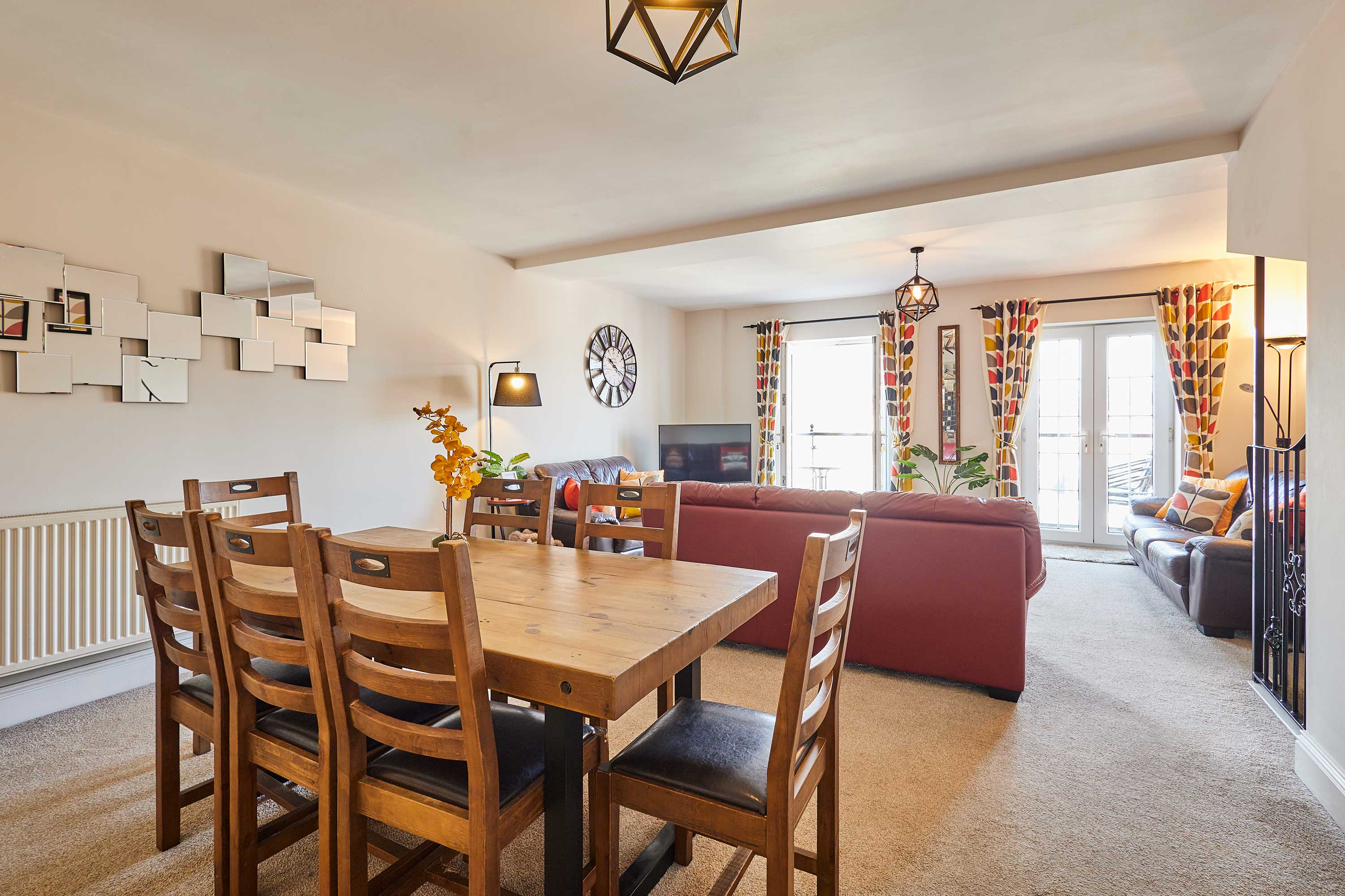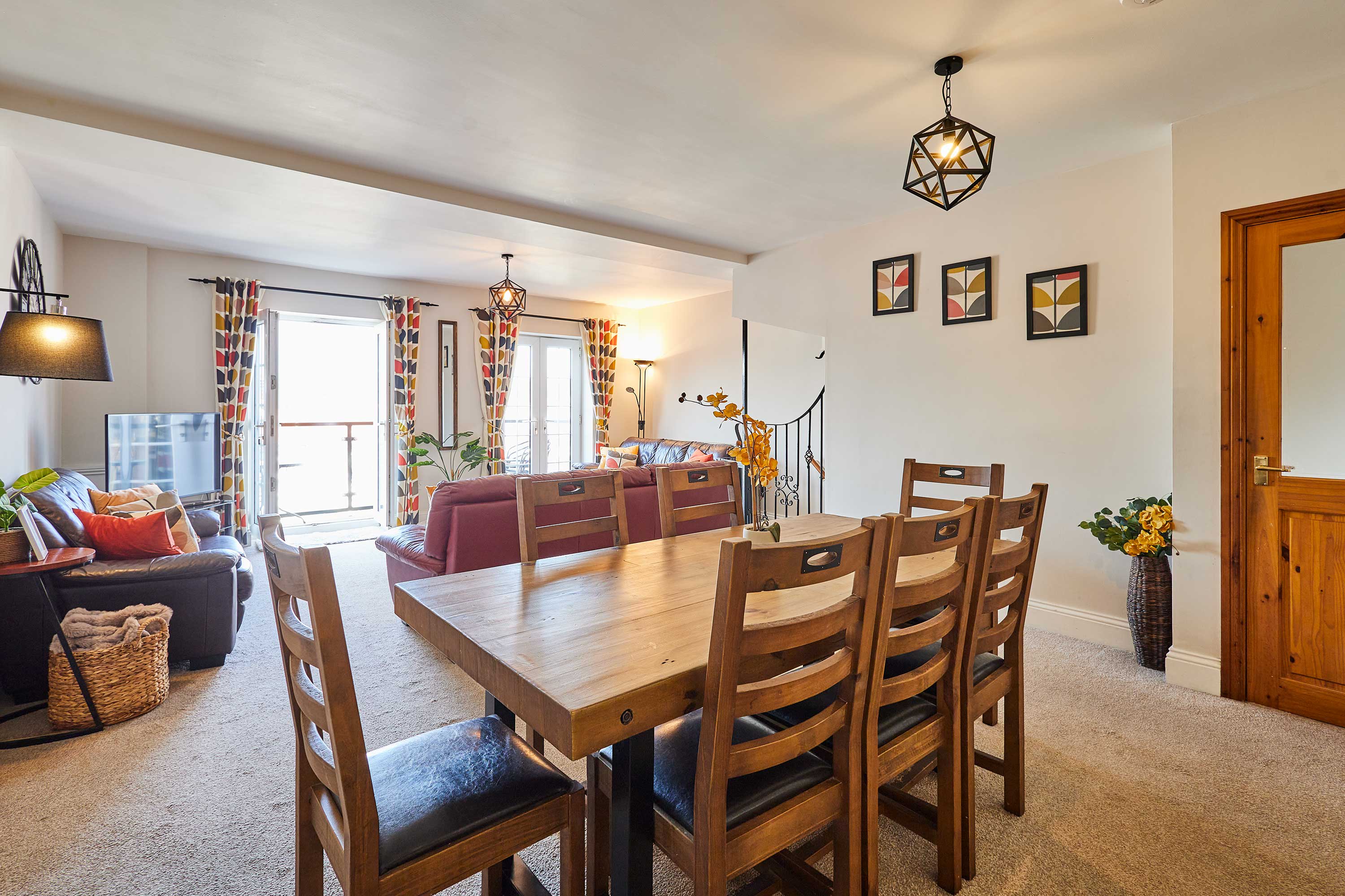 Harbour View House boasts four bedrooms, a spacious open plan living, dining and kitchen space, two bathrooms and two outdoor balcony areas. Located on the top floor of the property, you’ll find three bedrooms including Super King beds, which can be made up into twins if this would be more suitable for your stay, and the third bedroom has a single bed. The floor below is ground level to the road and boasts a garage and bathroom which has a bath with an overhead shower, basin and WC. The next floor down has an open plan living space which includes comfy leather sofas and a flat screen TV equipped with Freeview and a DVD player. The perfect spot for the whole family to get together, you can snuggle up and watch films after a full day of fun in Whitby. Open the double doors and you have access to a balcony with views across harbour. Ideal for relaxing, sit on the outdoor furniture and take in the stunning scenery of the river below. Towards the back of the open plan space is the kitchen and dining area. The kitchen is modern with wooden cabinets, monochrome tiles and a statement, high shine black light feature. Fully equipped for all self-catering stays, the kitchen has a dishwasher, oven, hob, microwave, refrigerator, toaster, kettle and coffee machine. There is also a washing machine and tumble dryer so the property is perfect for longer stays. The dining area includes a breakfast bar with two stools as well as a solid wood dining table with dining chairs. Great for family meals and entertaining with friends, this space is the social hub of the house. Downstairs on the bottom floor, you’ll find the master ensuite bedroom. With a Super King bed and two singles, this room is ideal for family stays and groups of friends. The room is complete with premium furniture and a TV with Freeview. The ensuite bathroom includes a huge walk in shower, bathtub, two basins and a WC. Outside there is a terrace area where you’ll find two picnic tables and views of the harbour ahead.