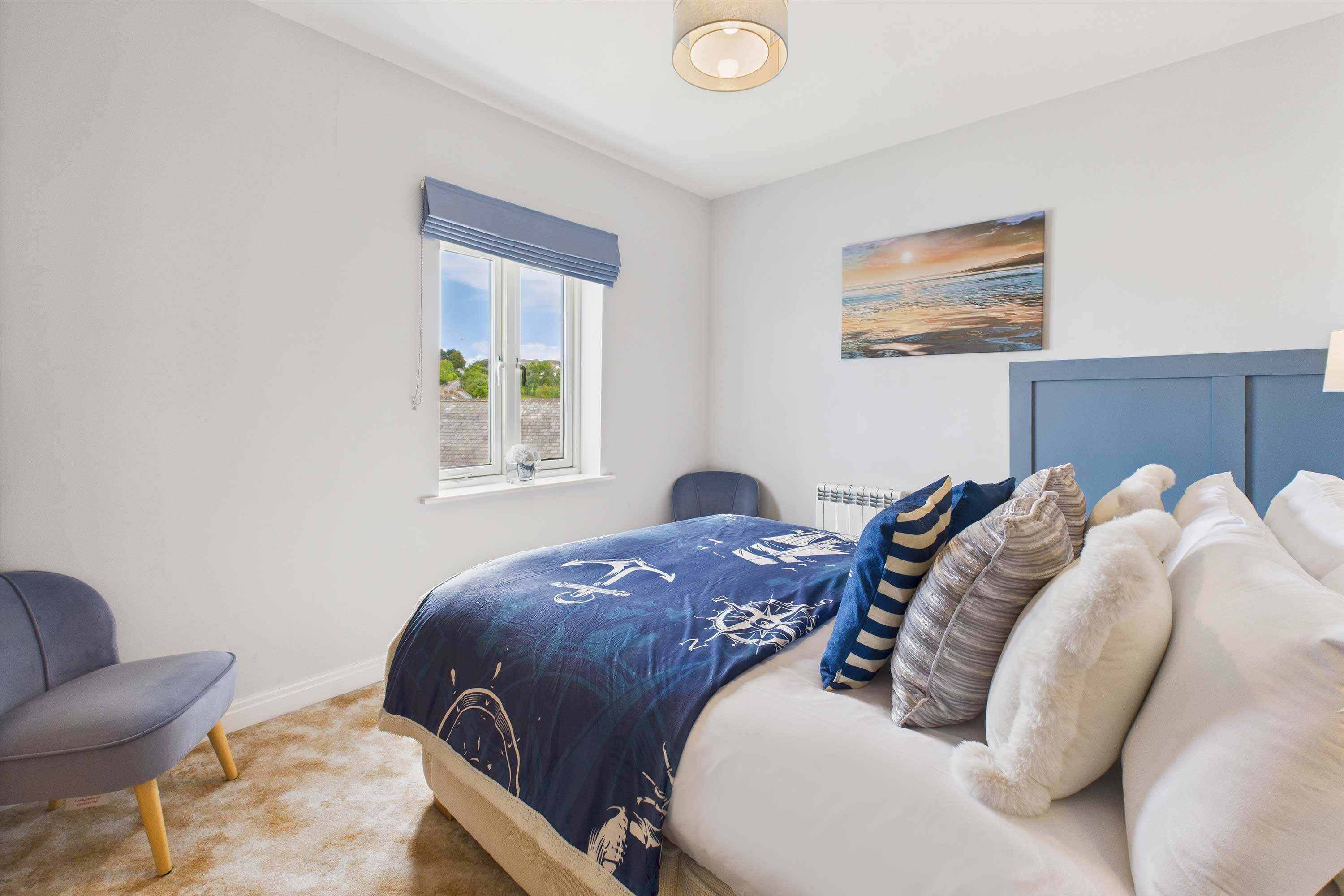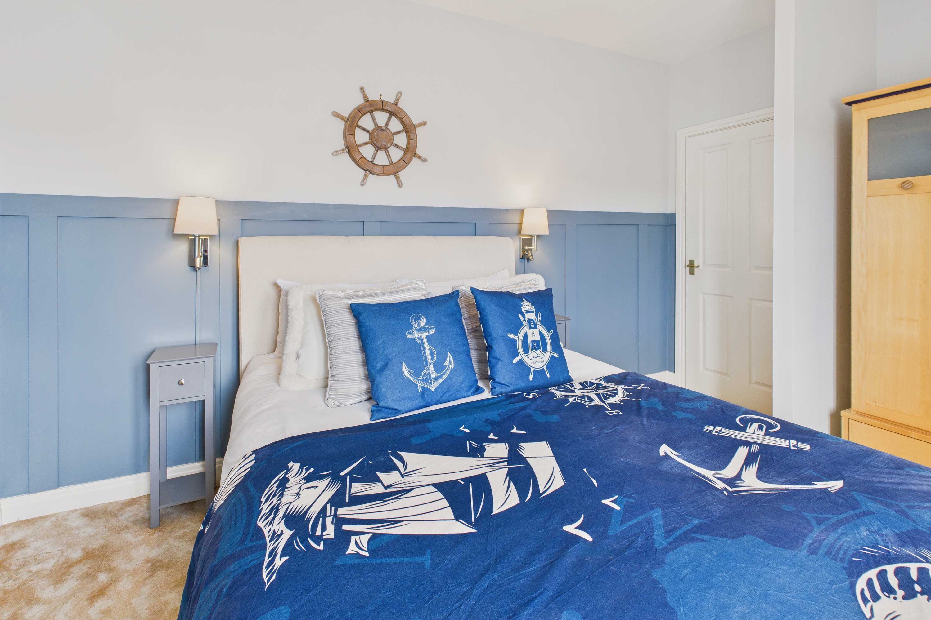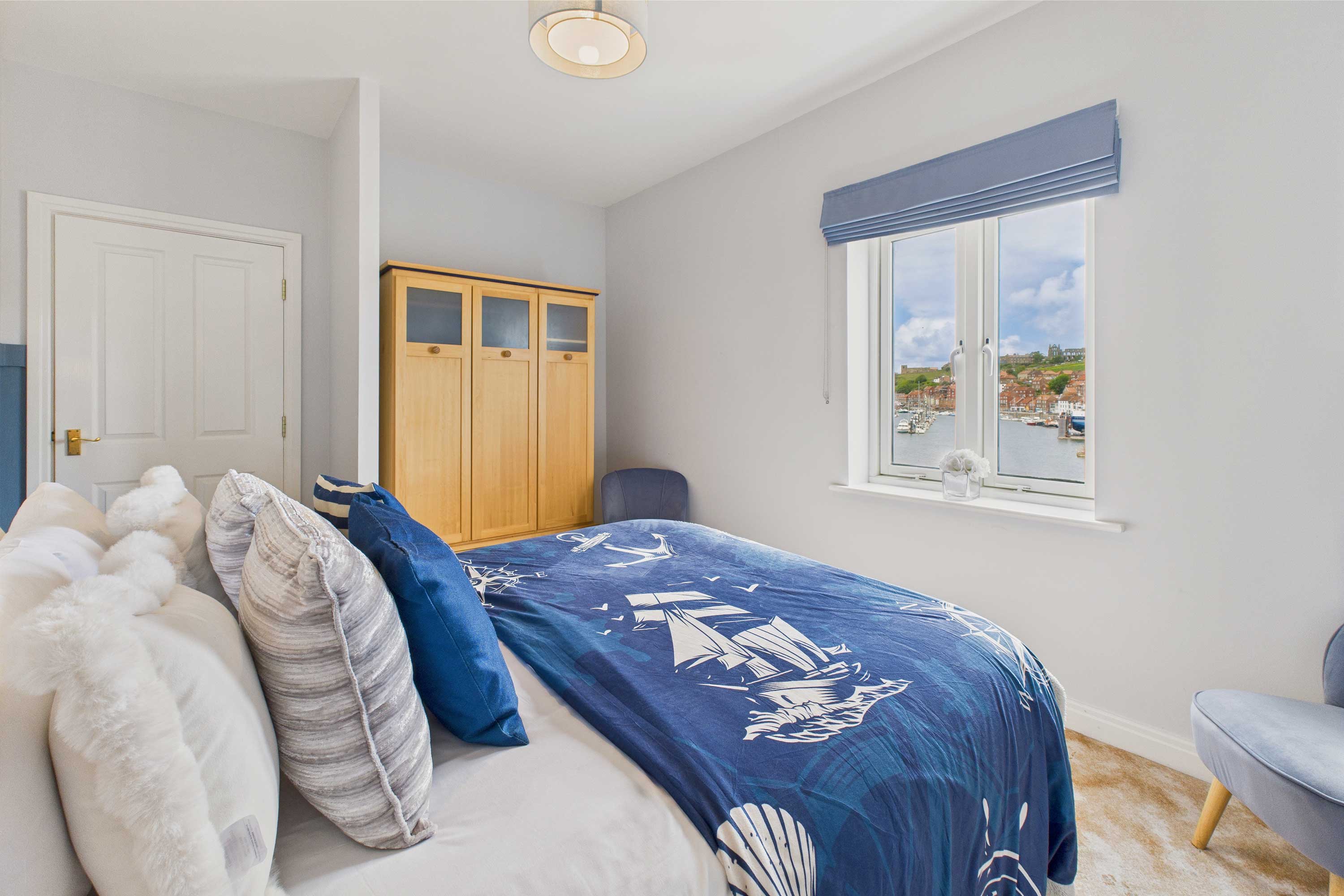 Starboard Bow has an open plan living and dining area where you can relax during your stay. Featuring a tan leather sofa, a matching armchair with a leather chair and a new Samsung 50" smart TV, you can cosy up here after a busy day exploring Whitby. The dining area includes a round table with four matching chairs Fully equipped, the kitchen has everything you could need to make the most of your self-catering stay. With modern appliances and cookware provided, you’ll be able to prepare meals easily. Head to the bedrooms and you’ll find a comfortable space. The first bedroom boasts a king size bed, premium bedding and views of Whitby Harbour, you’ll instantly feel relaxed here. Velvet statement chairs and bedside tables complete the space. The second bedroom is fitted with a superking-size bed. The bathroom includes a bathtub with an overhead shower, WC and basin. Outside you’ll find a communal garden with two park benches overlooking the harbourside.