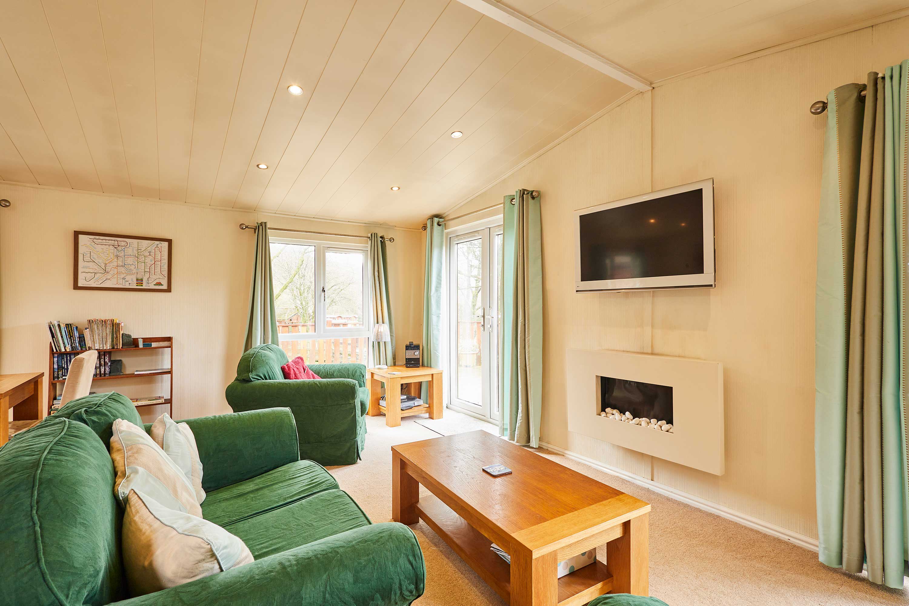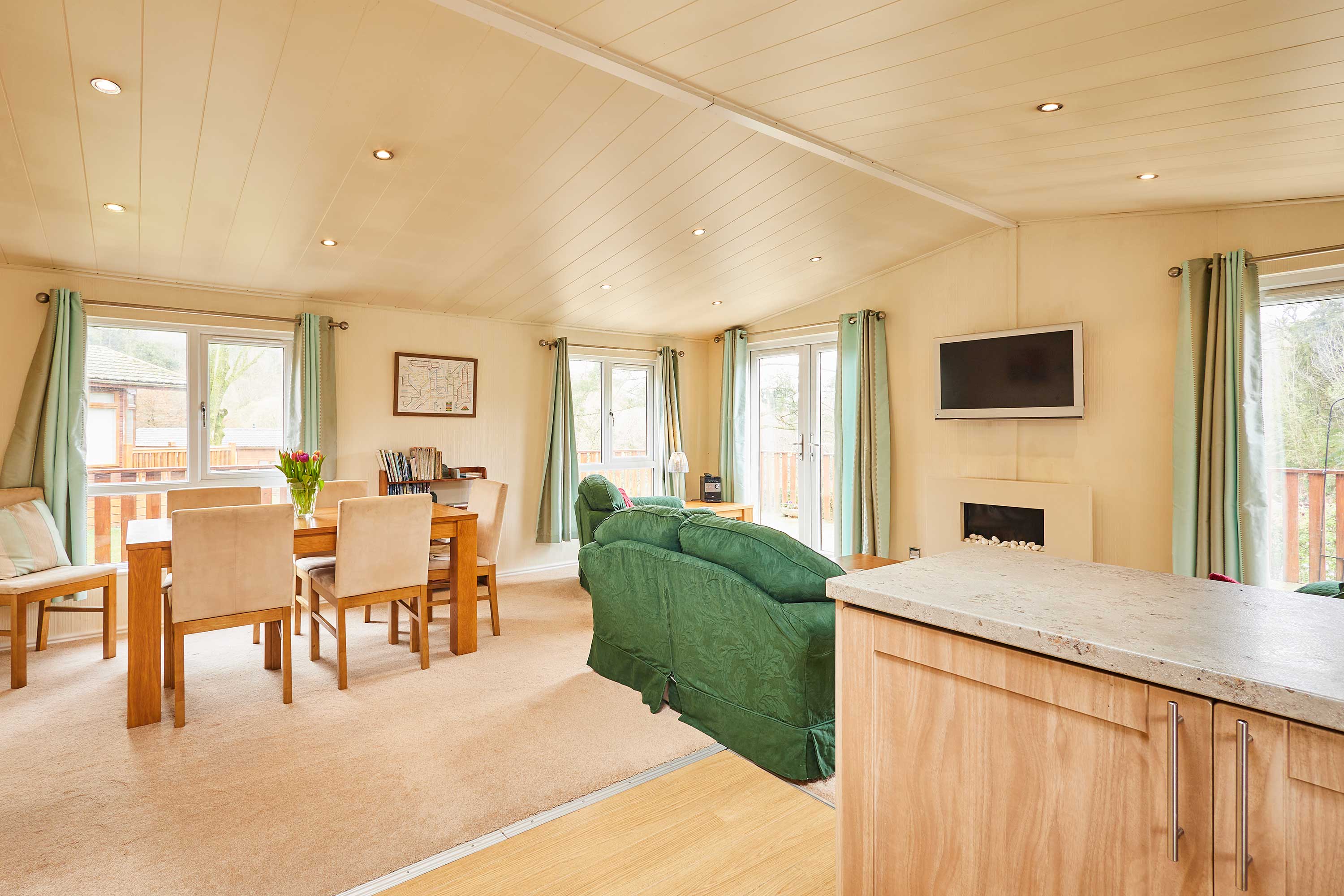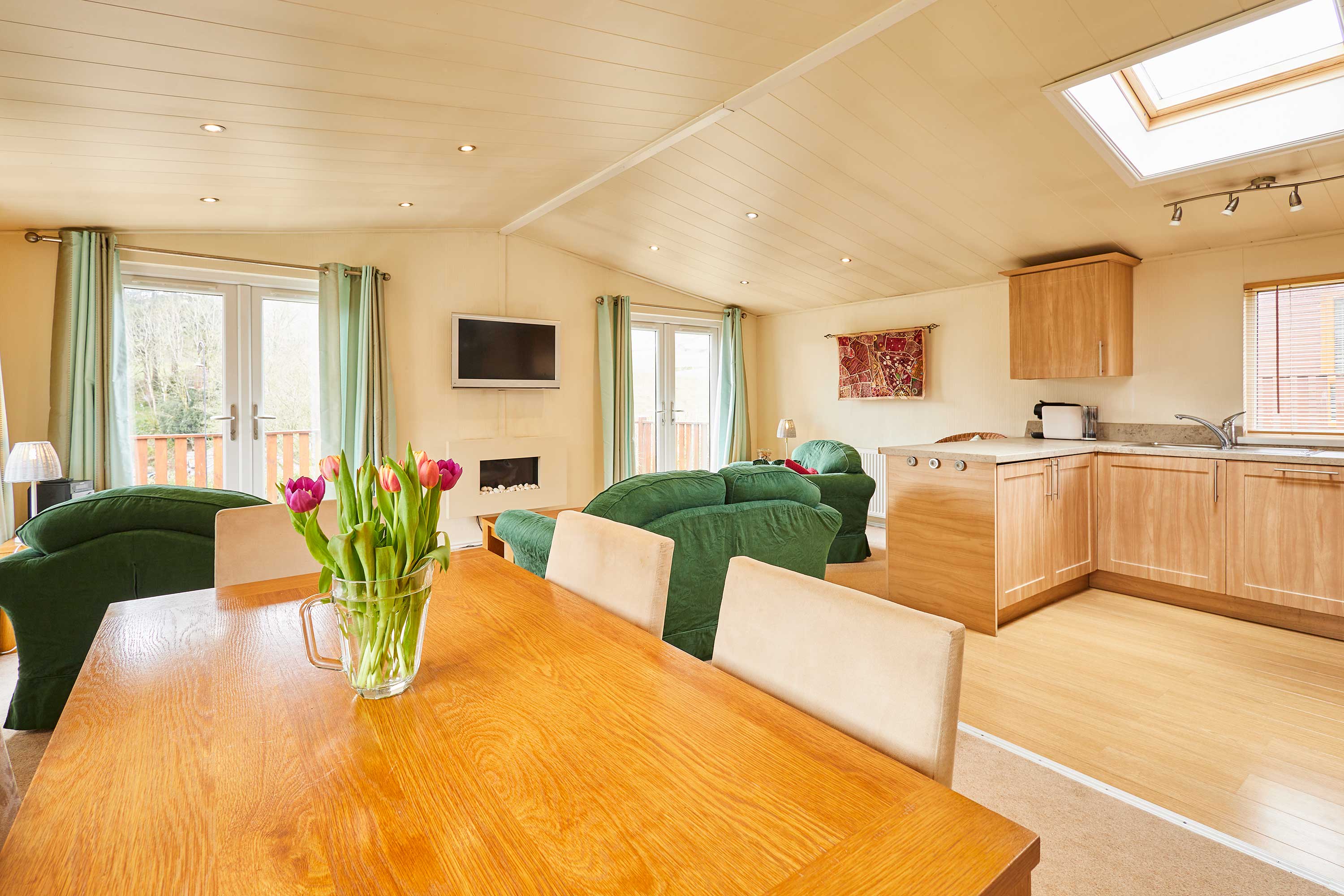 The heart of this home is the open plan living and dining space - ideal for families and friends to gather and create memories during their stay. The living area features comfortable sofas and a television, making it easy for guests to relax and unwind during a chilled day or after a day spent exploring the local area. The fully equipped kitchen is perfect for guests to grab a quick snack or prepare a home cooked meal. This is ideal for guests staying for a short break or a longer getaway. These meals can then be enjoyed by guests in the adjacent dining area. Pine View also features three bedrooms, each providing comfortable beds and ample storage space. They are thoughtfully designed to create a relaxing environment for guests to unwind and relax. There are an ensuite and main bathroom at Pine View, offering comfort and convenience for guests wanting to refresh themselves throughout their stay. A patio outside the property features a seating area that is ideal for guests to enjoy the local picturesque countryside views.