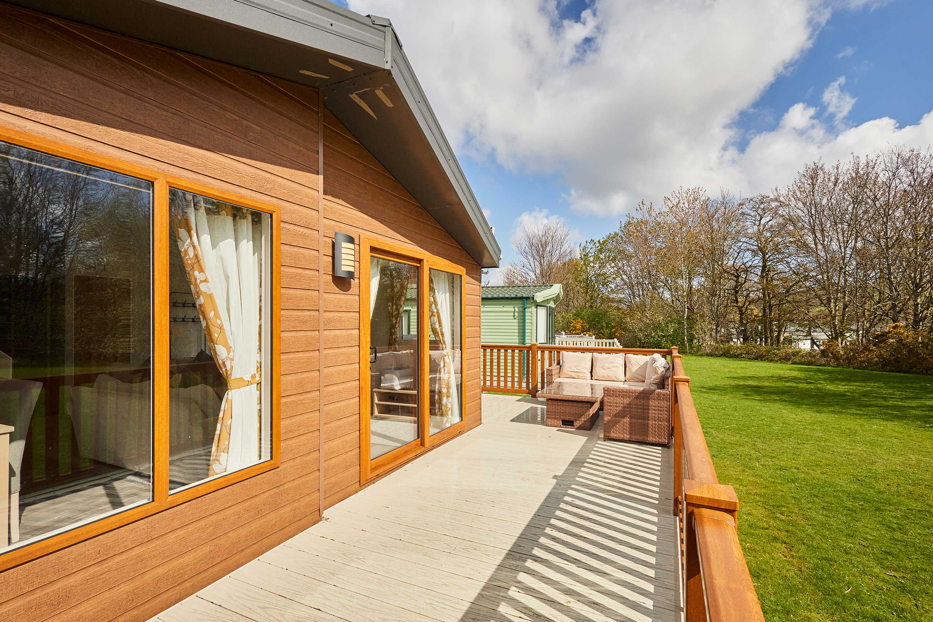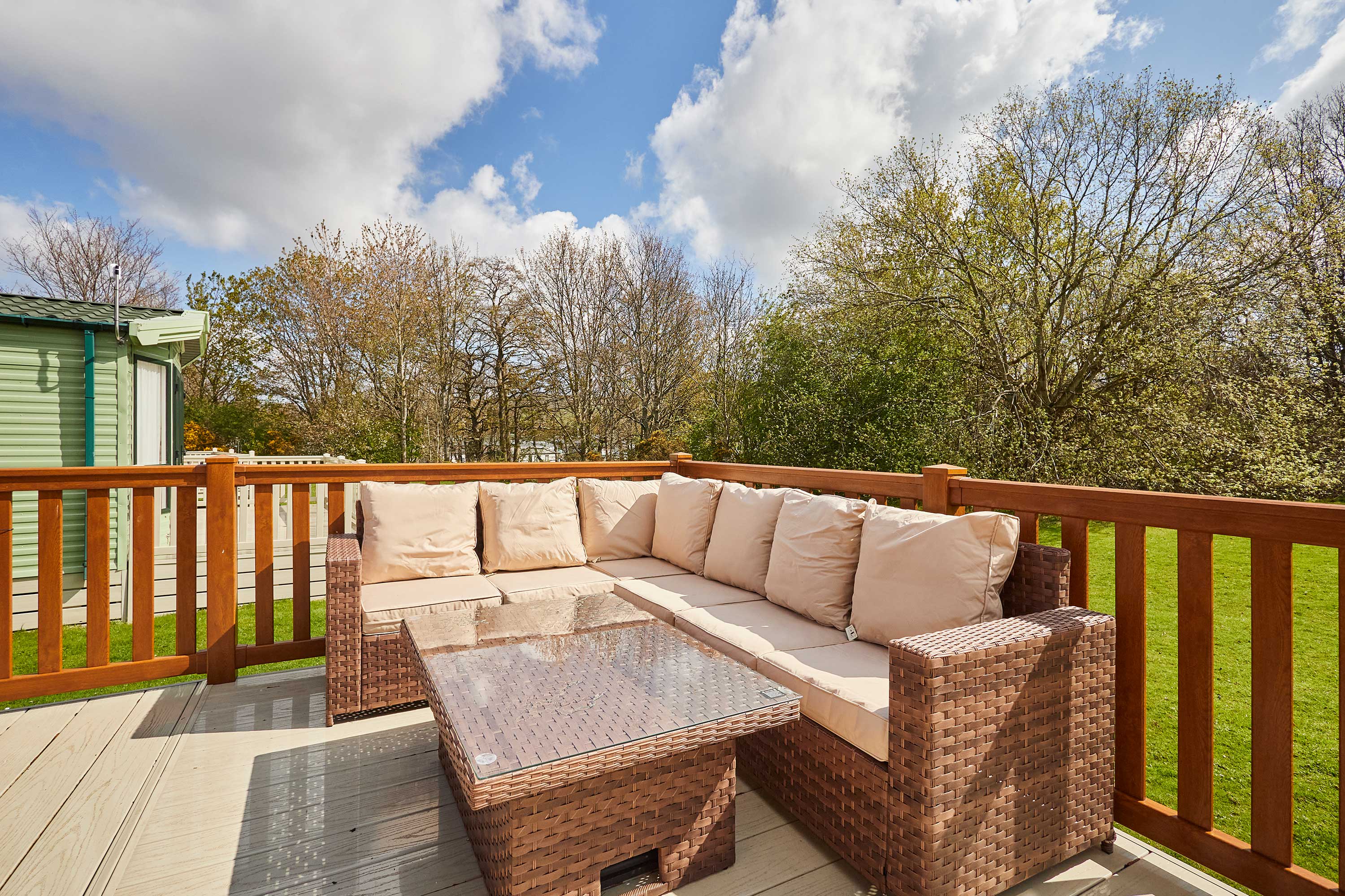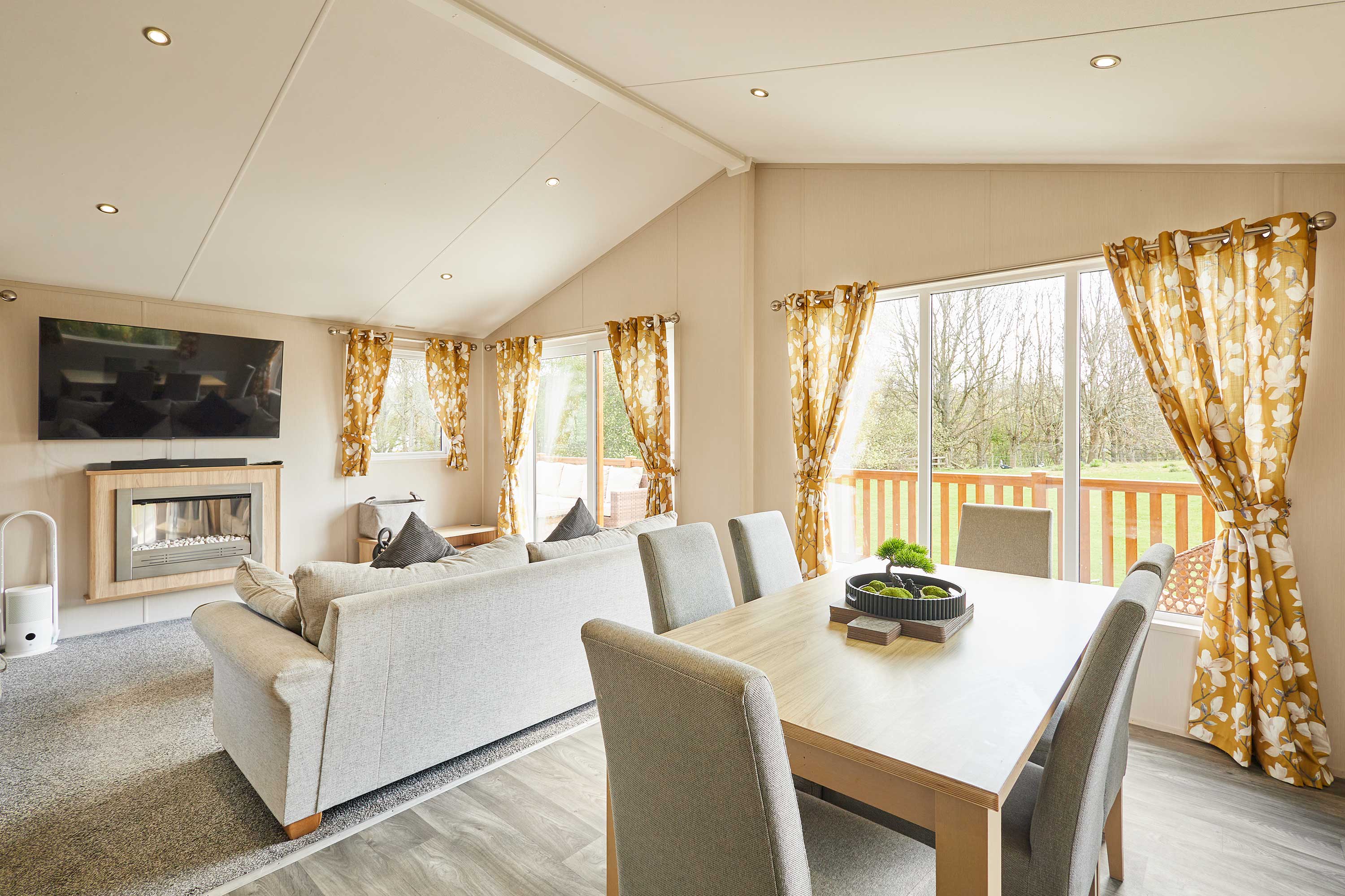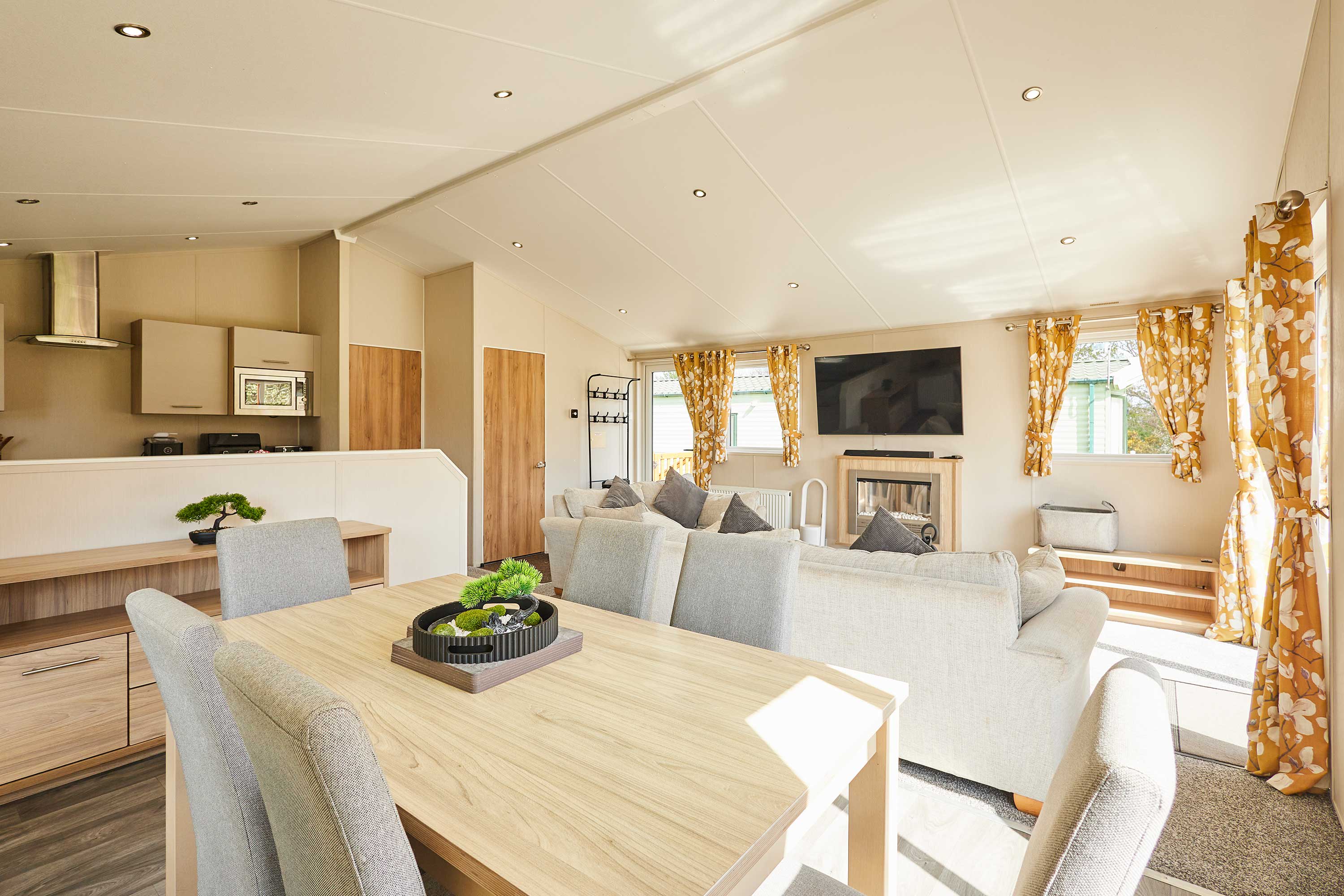 The heart of this home is the cosy open-plan living area that features comfortable seating and is ideal for guests looking to relax and create memories together. The television and fireplace in the room create a warm and inviting space for guests to unwind with ease. The fully equipped kitchen provides everything guests need for quick snacks or home cooked meals during their stay. This creates convenience for guests, whether they're enjoying a short break or a longer getaway. There is a dining area adjacent to the kitchen that allows guests the opportunity to enjoy delicious meals together. The three bedrooms feature comfortable beds, ample storage space and are thoughtfully designed to provide a welcoming space for guests to relax during their stay. Both sleek bathrooms offer convenience for guests as they look to refresh themselves during their stay. The outside seating area means that guests can soak up the sun and enjoy fresh air in the privacy of this home away from home. There is also a play-park on site that is ideal for children needing to burn energy and have fun.