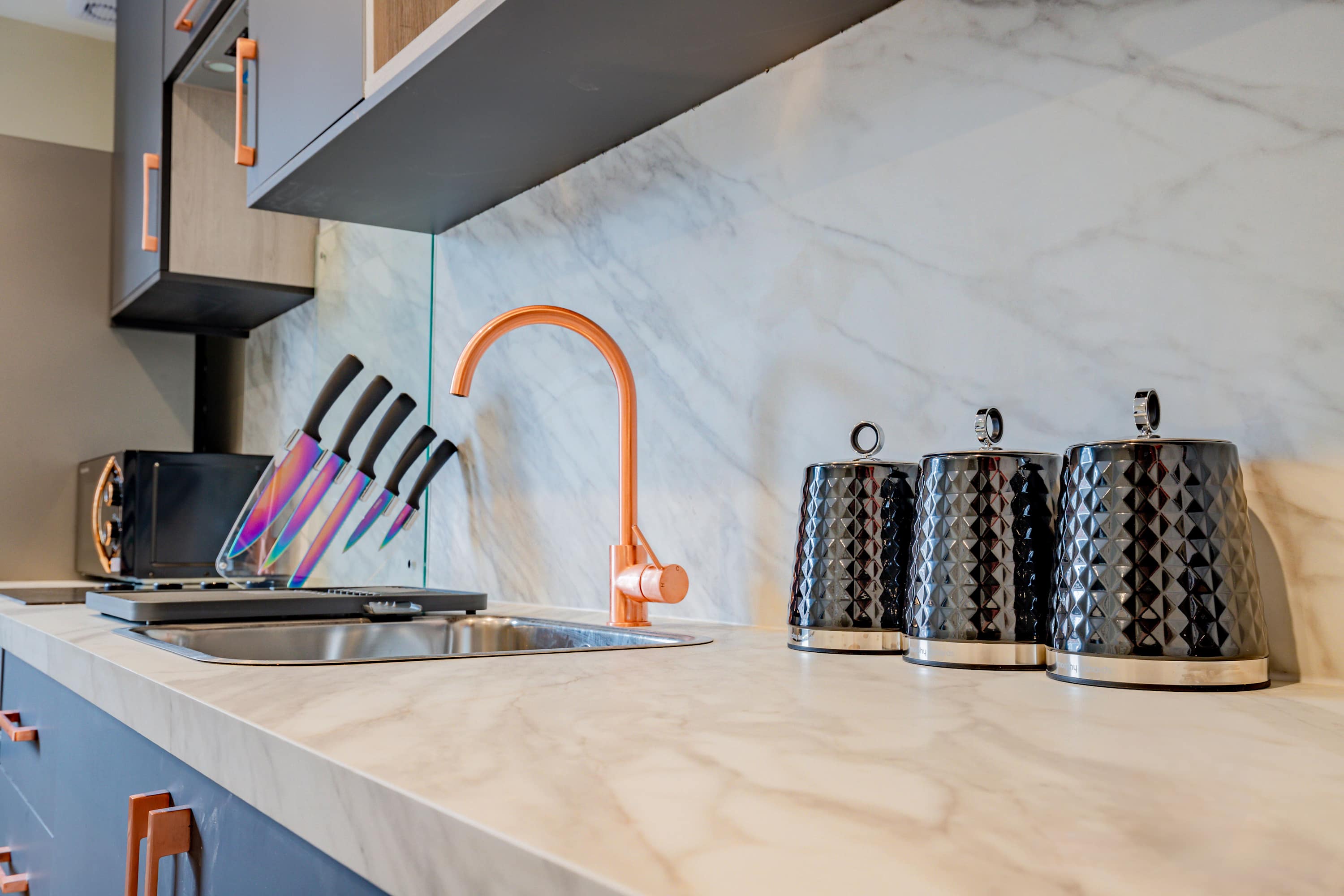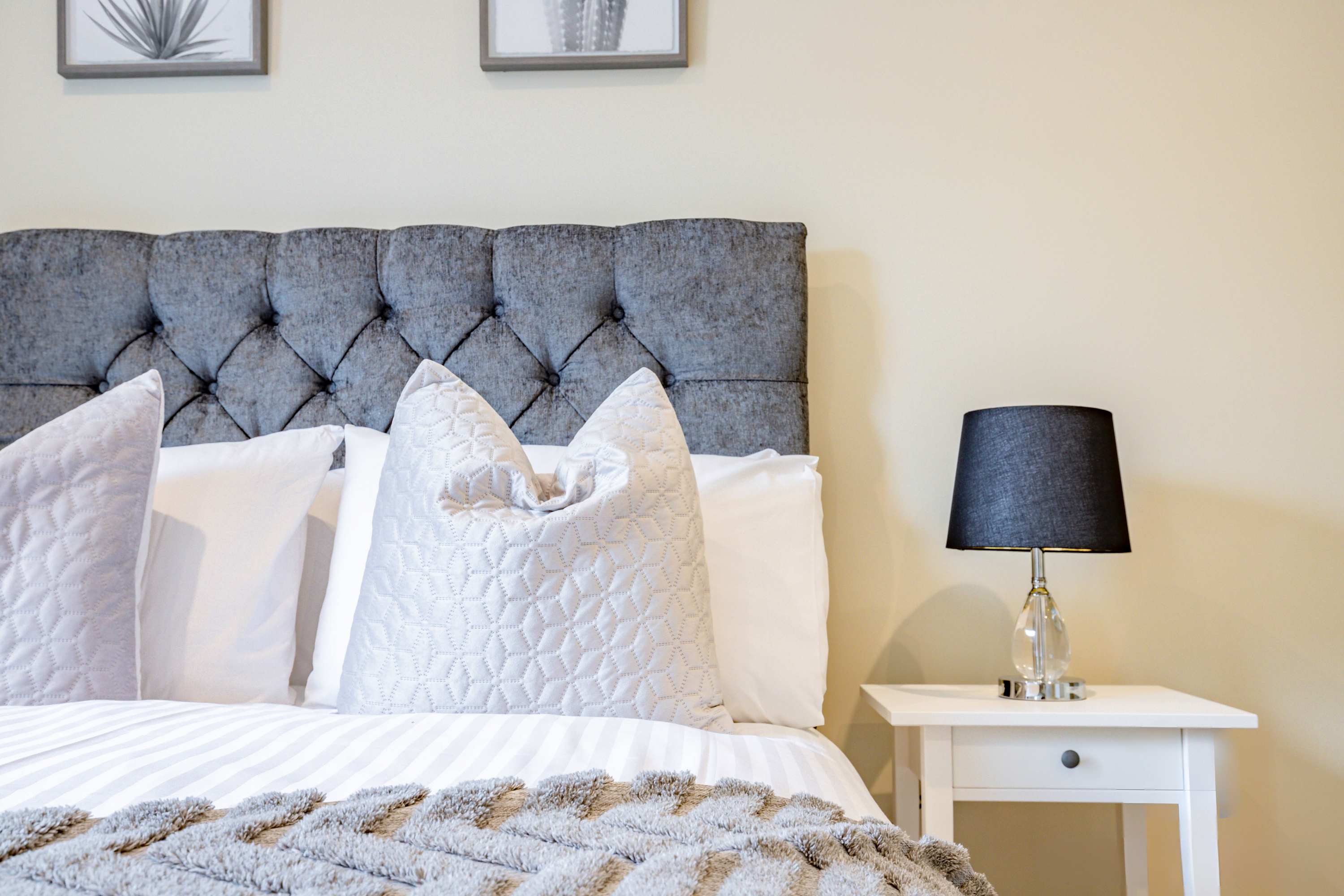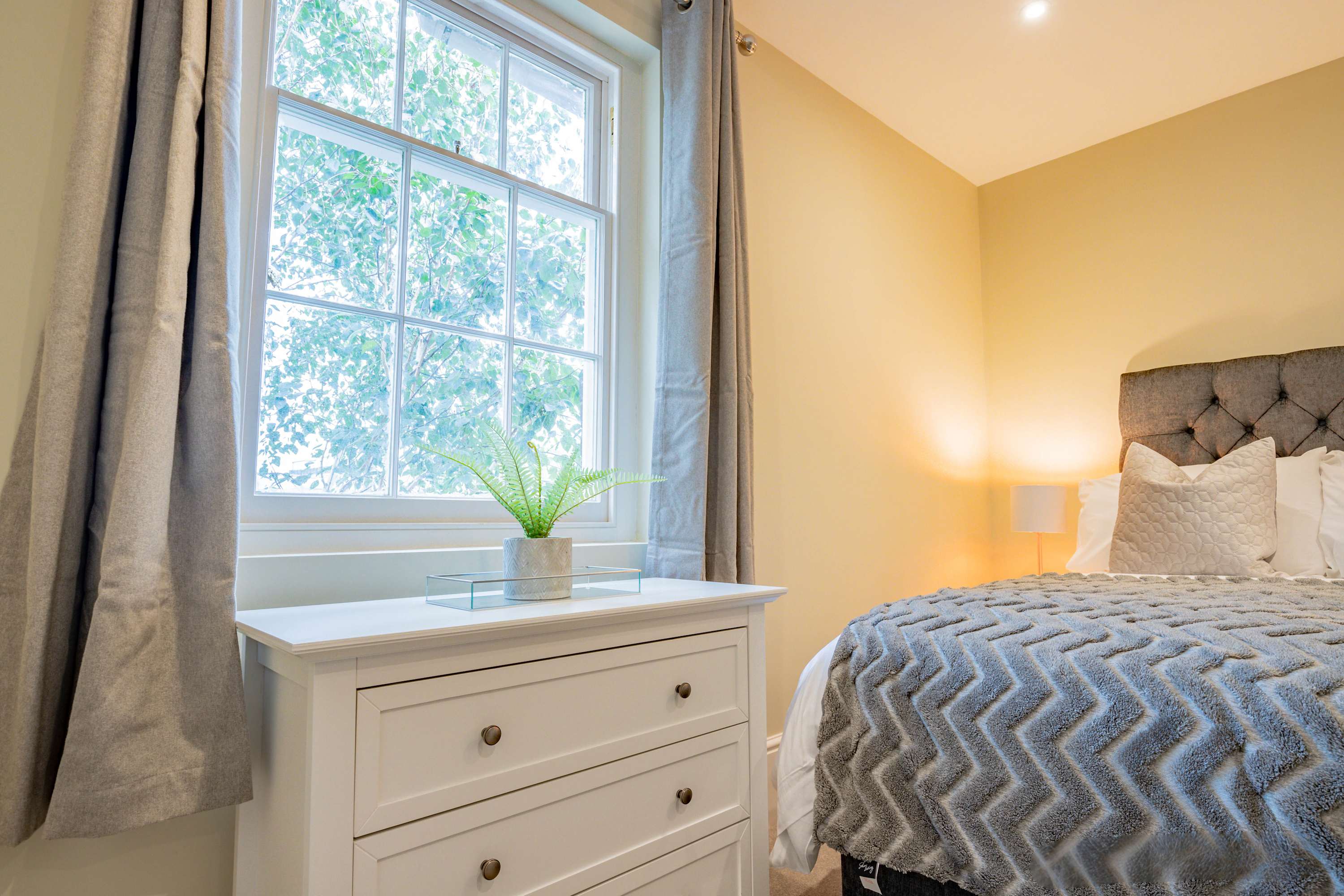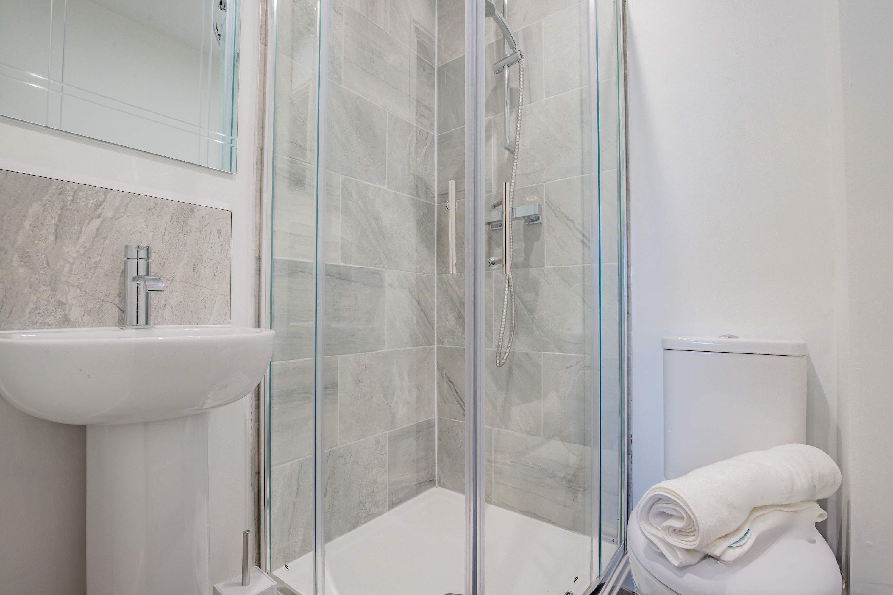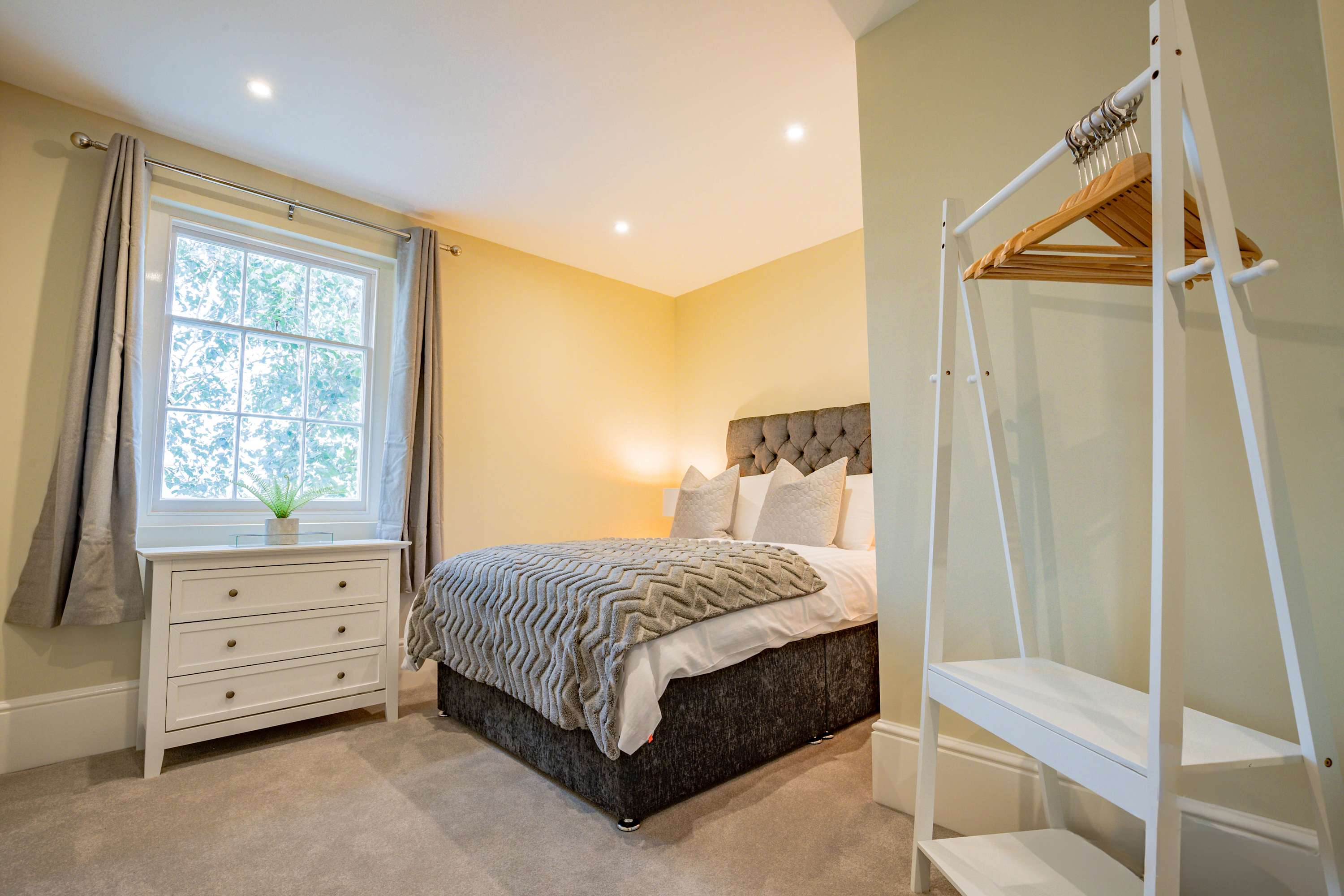 This charming apartment is located at the back of the property, up two flights of stairs. Although there is no designated parking with the apartment, Crown Gate Car Park (Moreton Pl, Worcester WR1 3LZ) is just a 3-minute walk away, and on-street parking is available in a 45-minute bay, though this restriction applies from 6pm to 9am. The kitchen is fully equipped for all your self-catering needs, with utensils, pots, and pans, as well as essential appliances including a hob, electric oven, microwave, kettle, and toaster, all under LED lighting. The living area provides a comfortable space to unwind, with a sofa for relaxation and a TV for watching Netflix or catching up on everyday life. The apartment features two bedrooms, both with double beds. One of the bedrooms has its own en-suite, while both rooms offer plenty of storage space with chest of drawers and a dressing table for getting ready for a day of exploring Worcester. The luxurious bathroom is complete with a bath, toilet, and sink, and we provide towels, soap, and toilet roll for your stay.