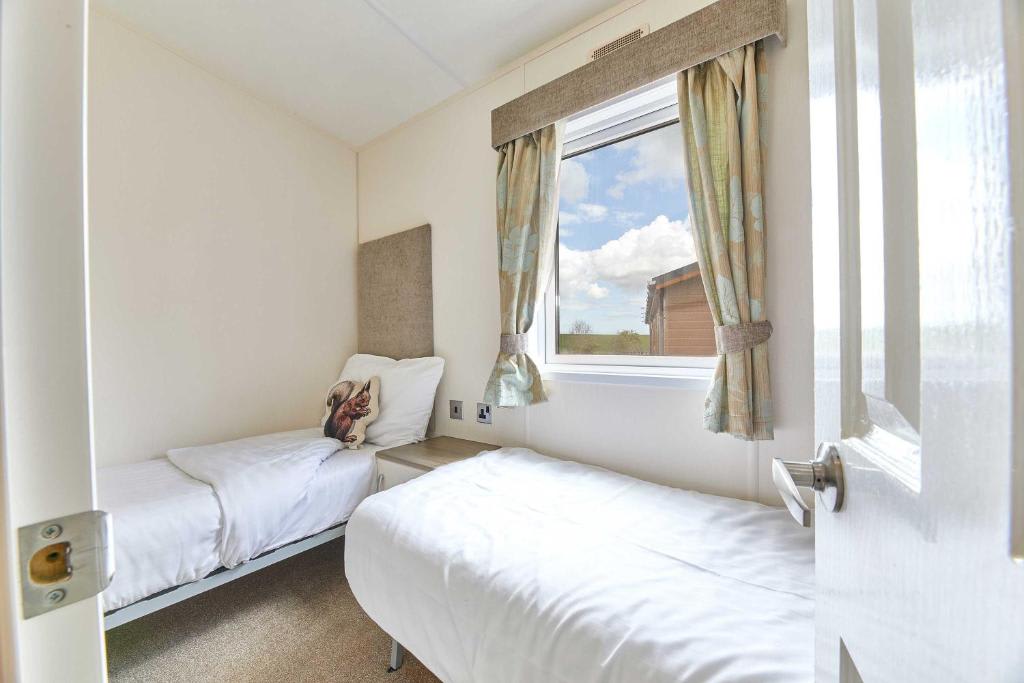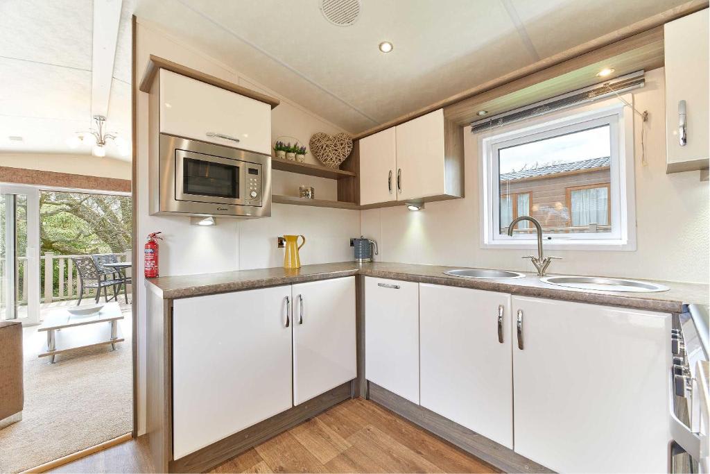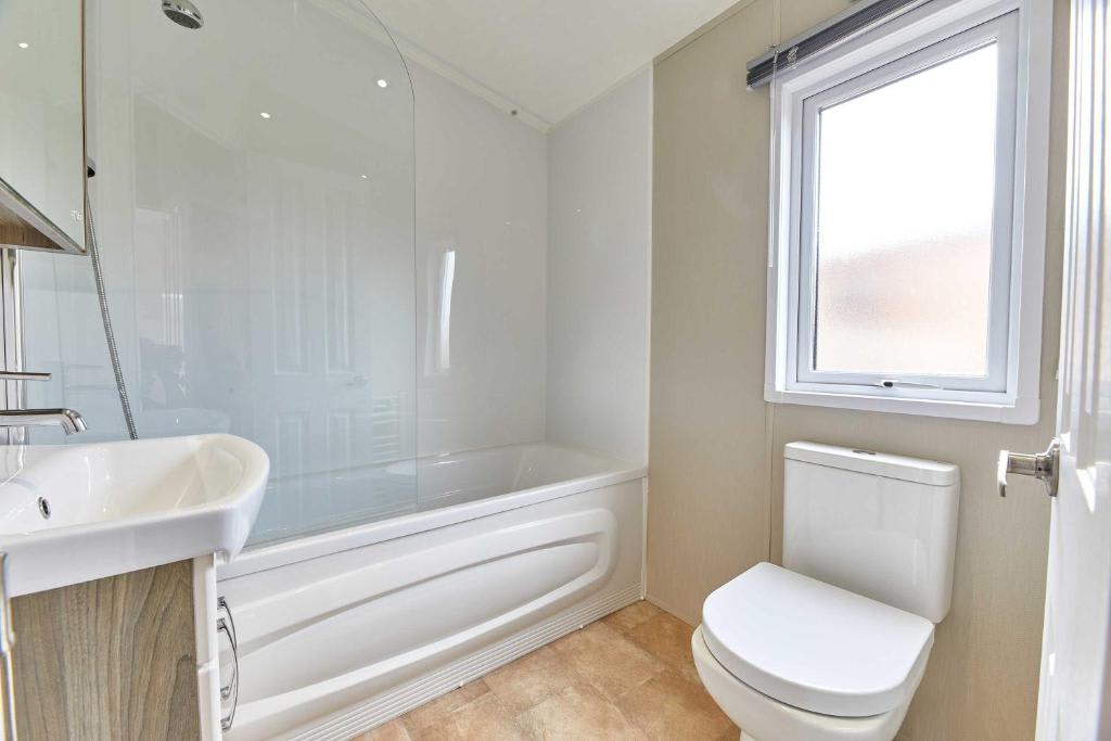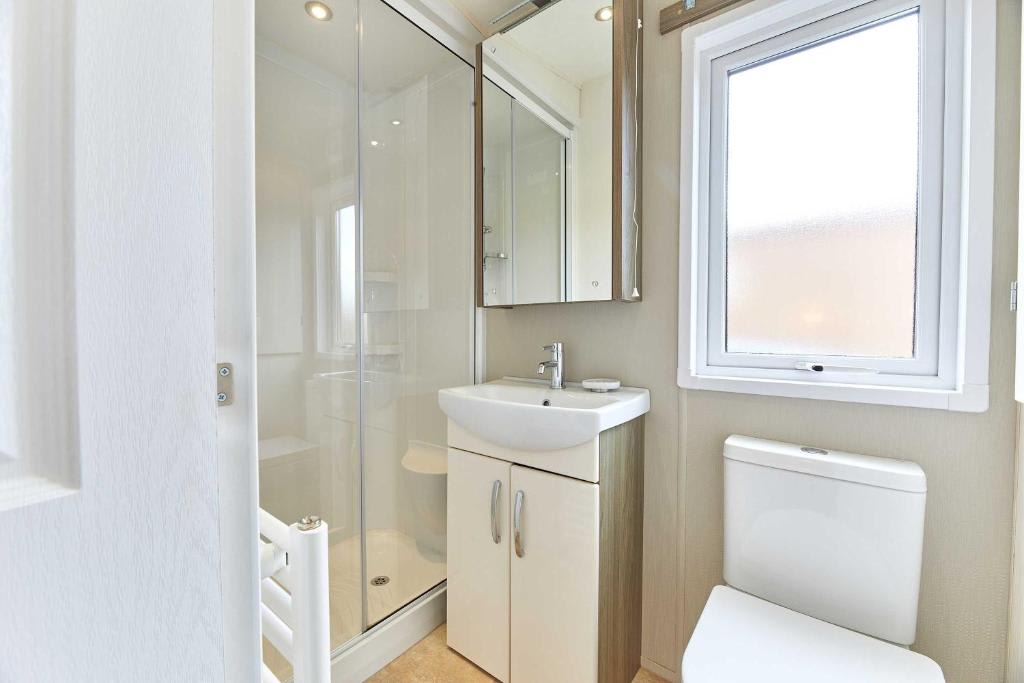 Norman Lodge has a cosy living area. The perfect place to relax with your loved ones, there is a comfy sofa, matching armchair, a fireplace and a flat screen TV. The space also features large patio doors which open out onto a terrace area. Outside you’ll find a black iron dining area which is perfect for morning coffees and al fresco dining. The terrace also boasts a hot tub where you can unwind during your stay. Fully equipped, the kitchen has an oven, hob, refrigerator, toaster and microwave so you’ll have everything you could need to prepare meals. There is a dishwasher, washing machine and dryer for your use too. Also sharing this space is the dining area which includes a dining area for 4 guests. The lodge has two bedrooms. Featuring an en suite shower room and a comfortable double bed, the master bedroom is ideal for couples. Head to the second room and you’ll find a twin. The master bathroom features a bath with an overhead shower, WC and basin.