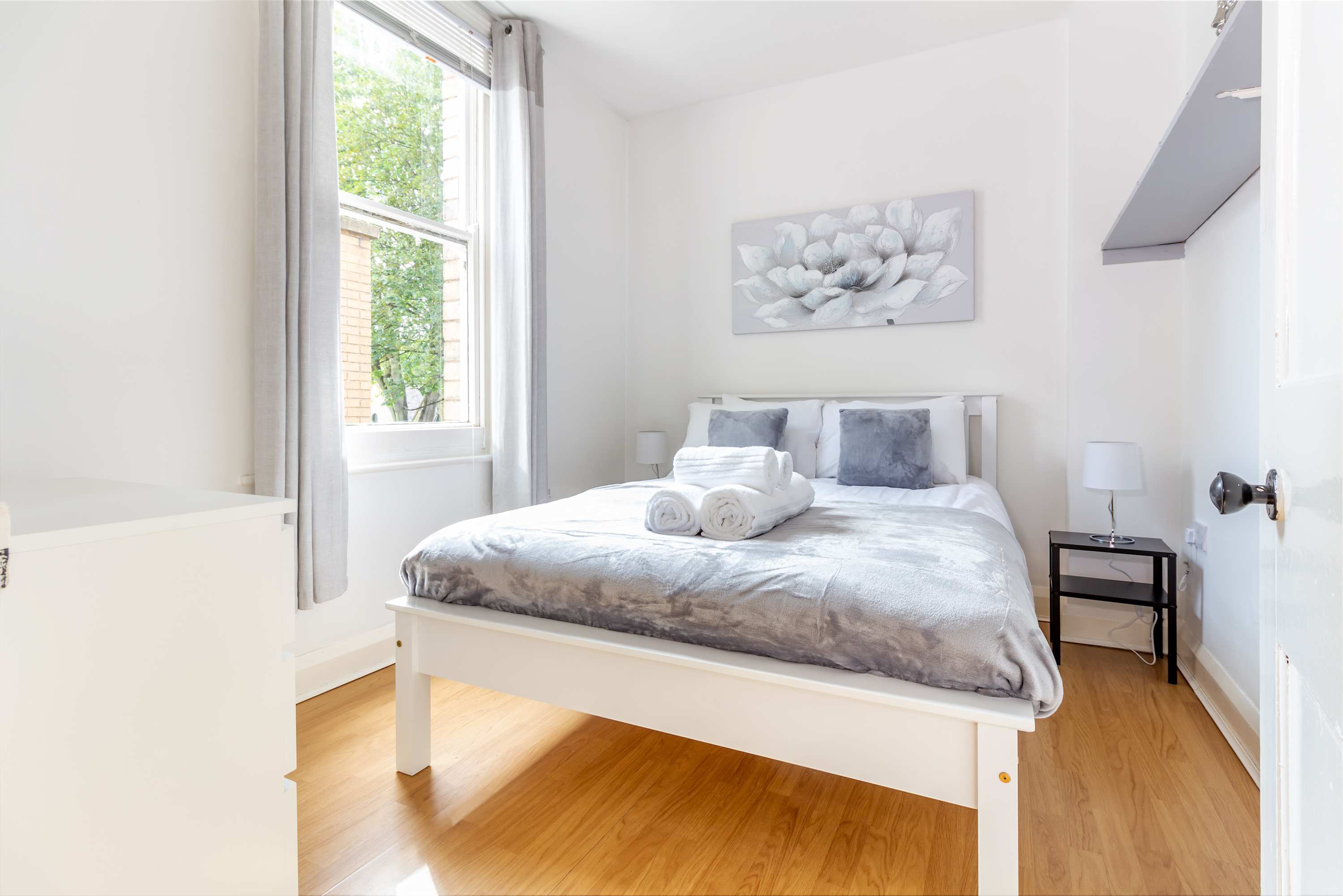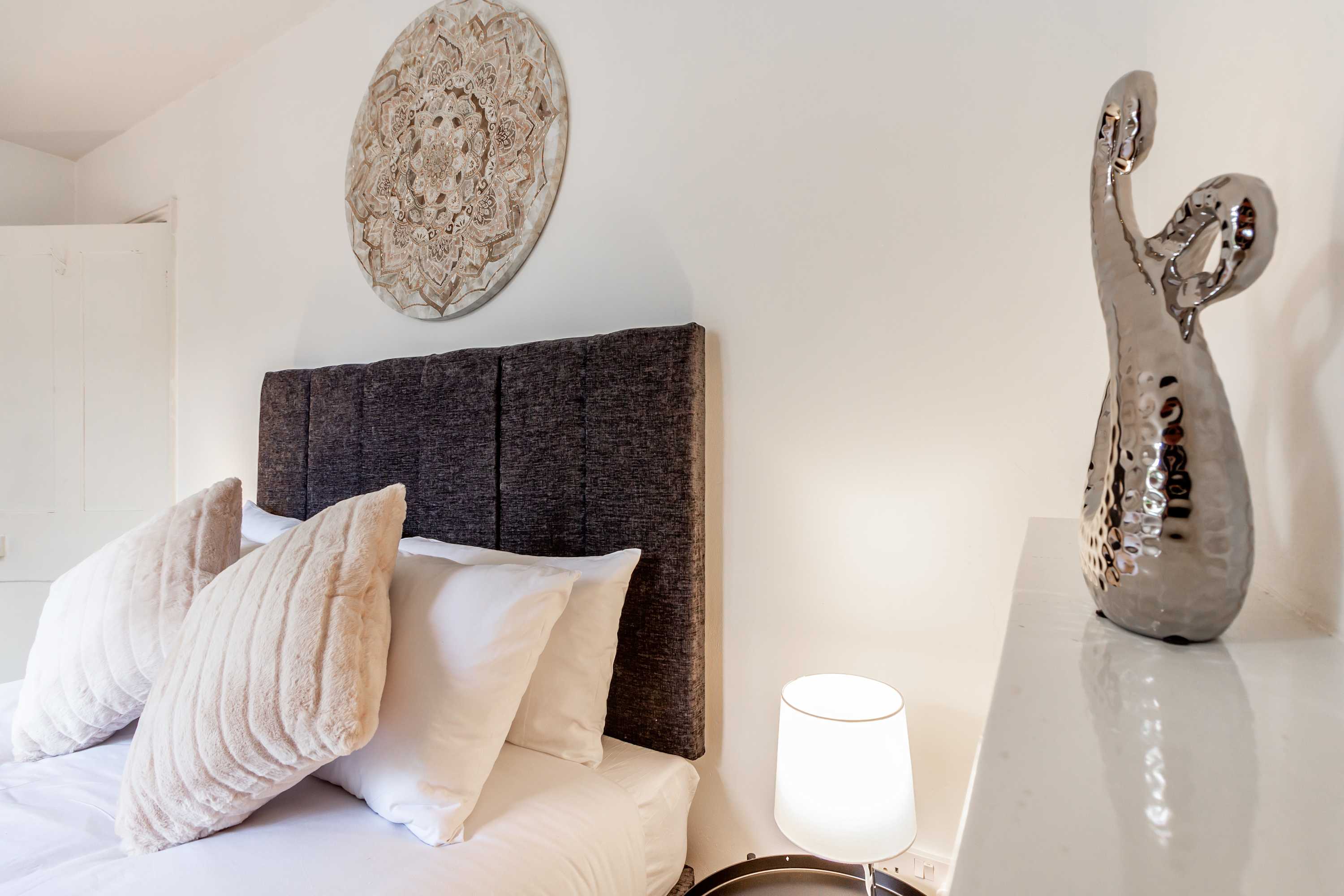 The property features two well-appointed bedrooms. Bedroom One includes a double bed, a chest of drawers, a bedside cabinet, and a lamp. The Master Bedroom offers a flexible sleeping arrangement with a double bed that can be split into two singles, along with two bedside cabinets, two lamps, an open wardrobe, a chest of drawers, a dressing table, stool, and mirror. The apartment also boasts an open-plan living room, dining area, and kitchen, perfect for relaxing and socializing with family, friends, or colleagues. The living room includes a double sofa bed, a flat-screen TV, a workspace area, and a dining area. The kitchen is fully equipped with a microwave, kettle, toaster, oven, fridge-freezer, and complimentary tea, coffee, and sugar for your convenience.