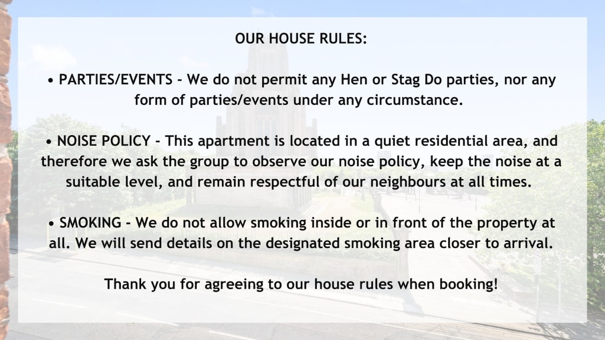 To minimise disruption to our Neighbours & Guests, we kindly ask guests to follow the following house rules: • Stag, Hen or Party Groups are not allowed in our Apartments. Please be aware you may be asked to leave if found in violation of this rule with no refund given. • Key collection is from 15:00 unless the early collection is arranged before arrival. This will be subject to availability and charged at £20 per hour. This also applies to dropping the keys back later than the check-out time of 10:00. • We are a non-smoking building. £250 will be charged if any signs of smoking are found following your stay within the flat. Please use the designated smoking area located at the back of the building and do not smoke in front of the building - Guests found doing so will be subject to a £100 charge. • Unfortunately reservations with large groups under the age of 25 will not be accepted. • Please make sure to return the parking permit into the flat upon check-out. Missing of parking permit can result in a deposit charge of £100.