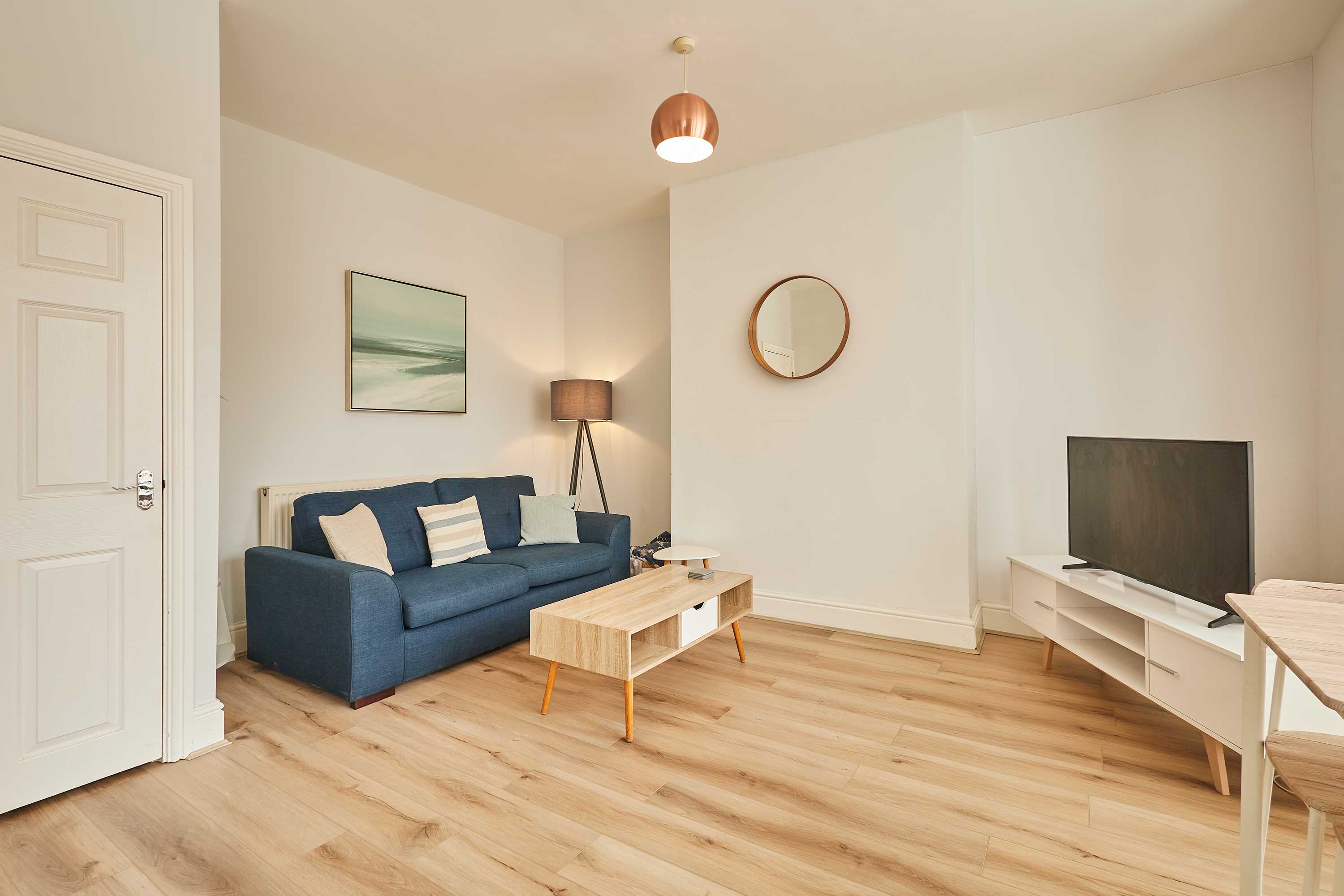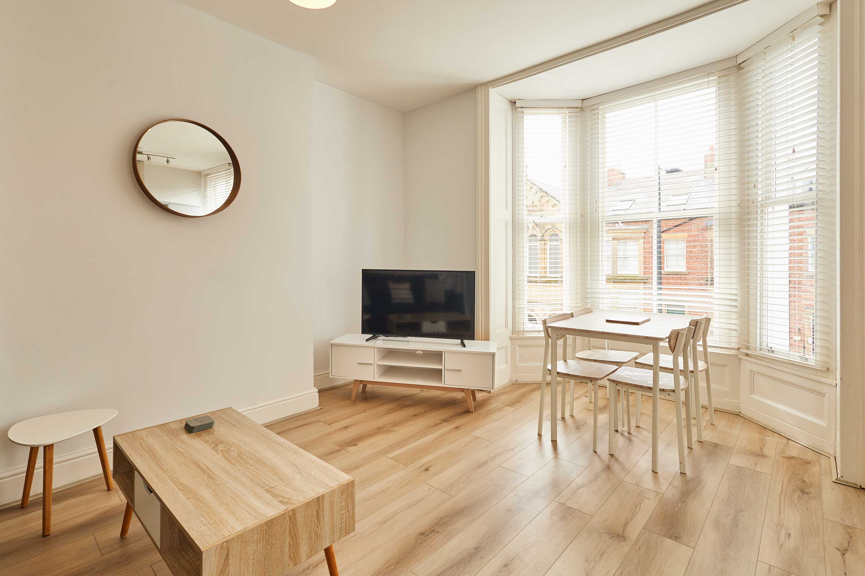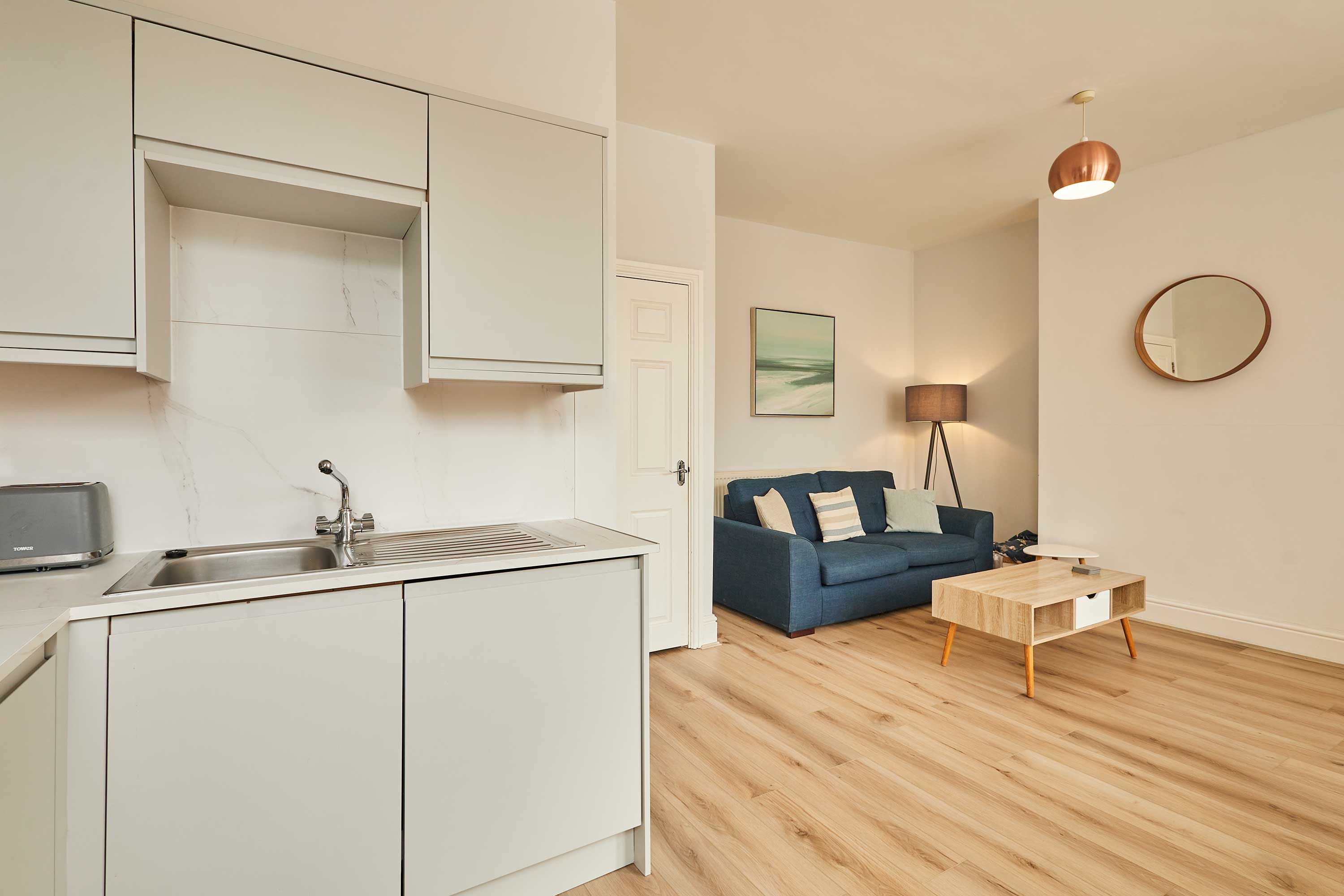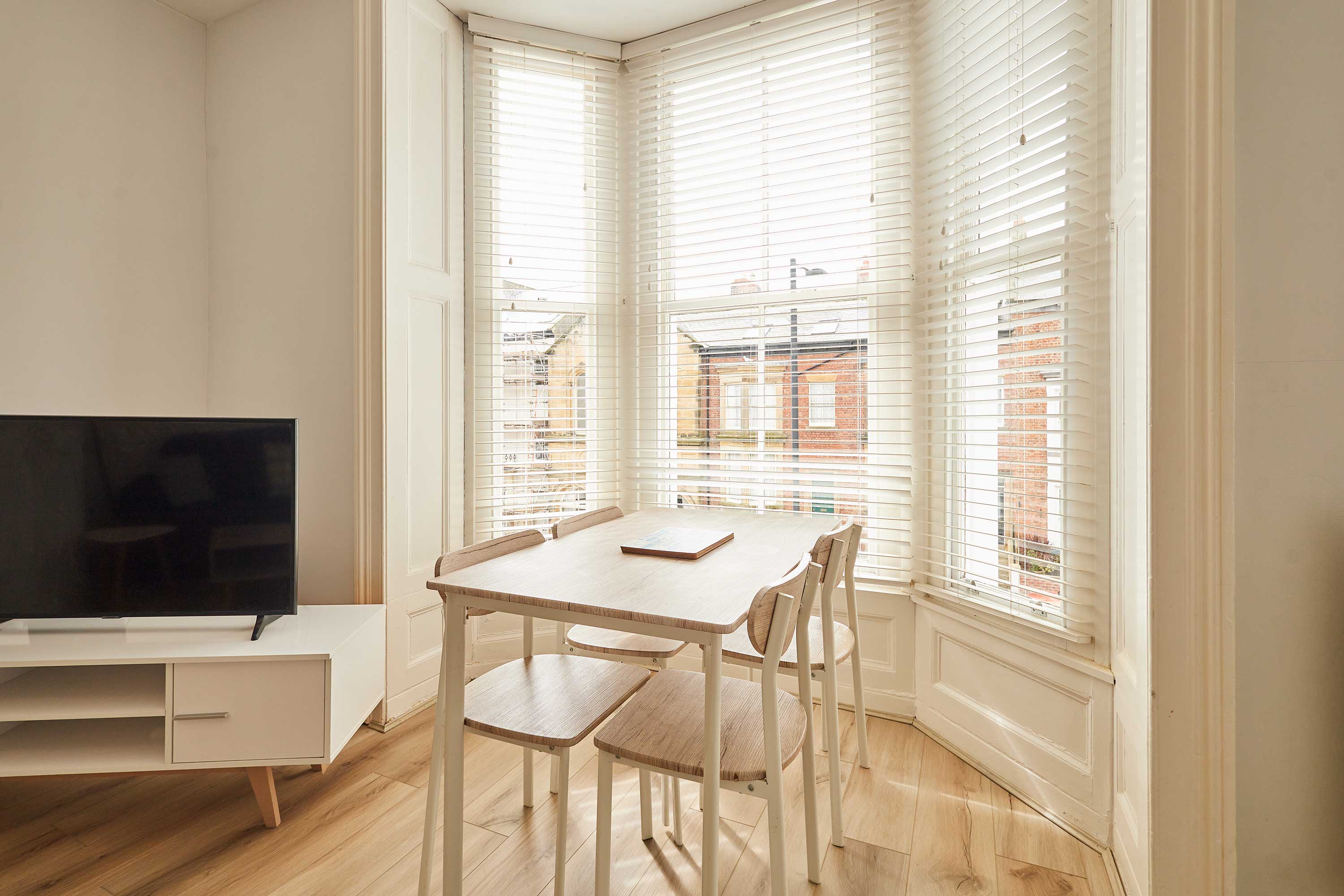 Upon entering the apartment, you’ll be welcomed into a bright and stylish space. With clean walls and plush carpets throughout, The Normanby is a breath of fresh air. The open plan living, dining and kitchen area is spacious and light. Kick back and relax after a long day of exploring the coast. Switch on the flat screen TV to catch up on your favourite shows or take some time out with a good book. In front of the huge bay window, you’ll find the dining area. The light wood dining table and chairs fit the minimalist style of the apartment. Enjoy breakfasts after lazy mornings and delicious evening meals with your loved one. The kitchen is modern and well-equipped. With an oven, fridge, toaster, kettle, washing machine, microwave and coffee machine – you’ll have everything you need for your stay. You can even make yourself a fresh coffee to start your day! The bedroom is a tranquil haven with a comfy king-size bed and stylish furnishings. Pops of dusky pink work perfectly in the room and the feather-like ceiling light is an elegant addition. The room is complete with a dressing table and mirror. Also sharing the same building is Silver Beach and together the apartments can sleep up to four guests. Please get in touch with our friendly team with preferred dates to enquire about booking both apartments together. Outside you’ll find an enclosed patio area with four wooden seats. This is shared with guests staying in Silver Beach.