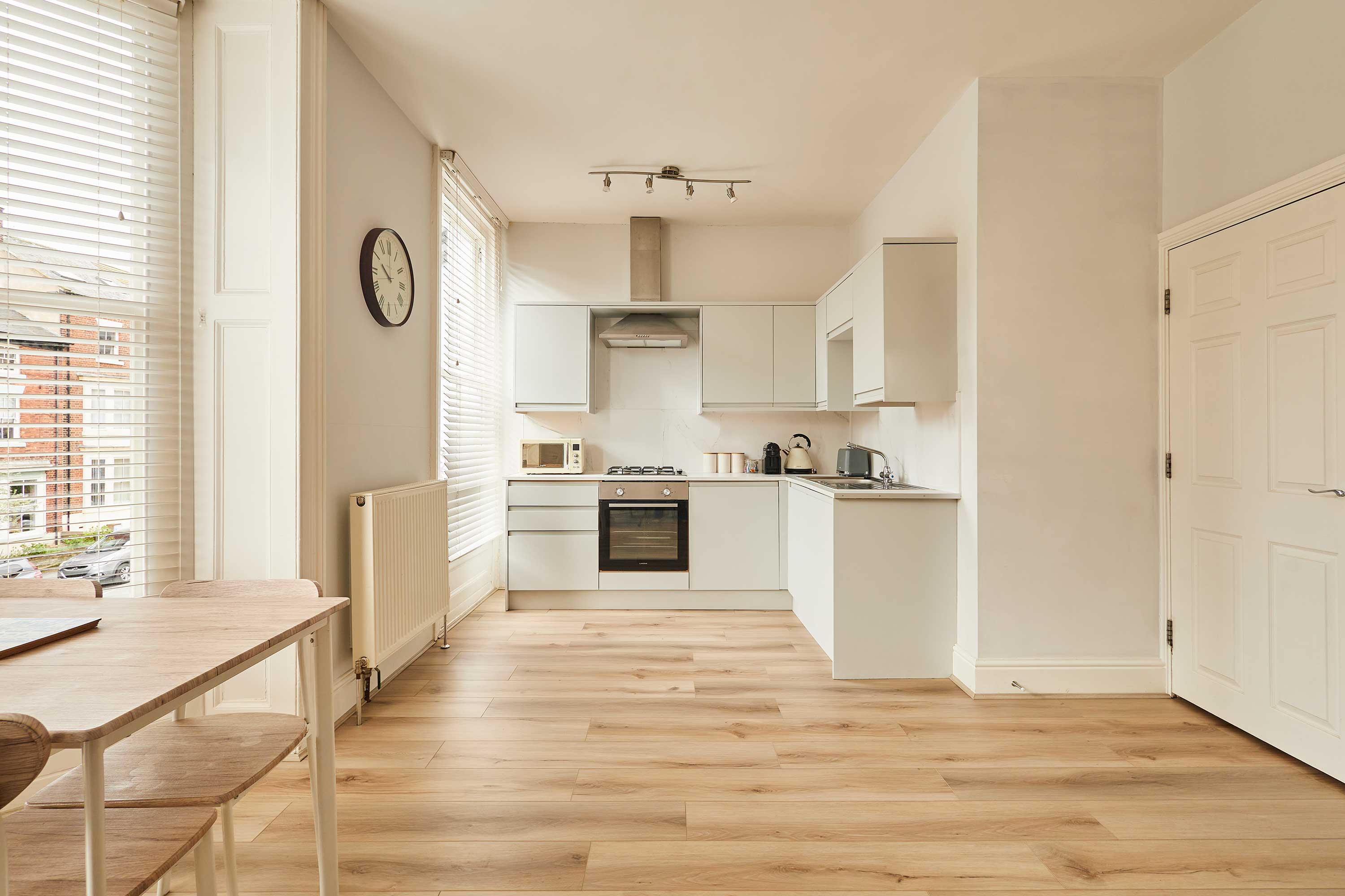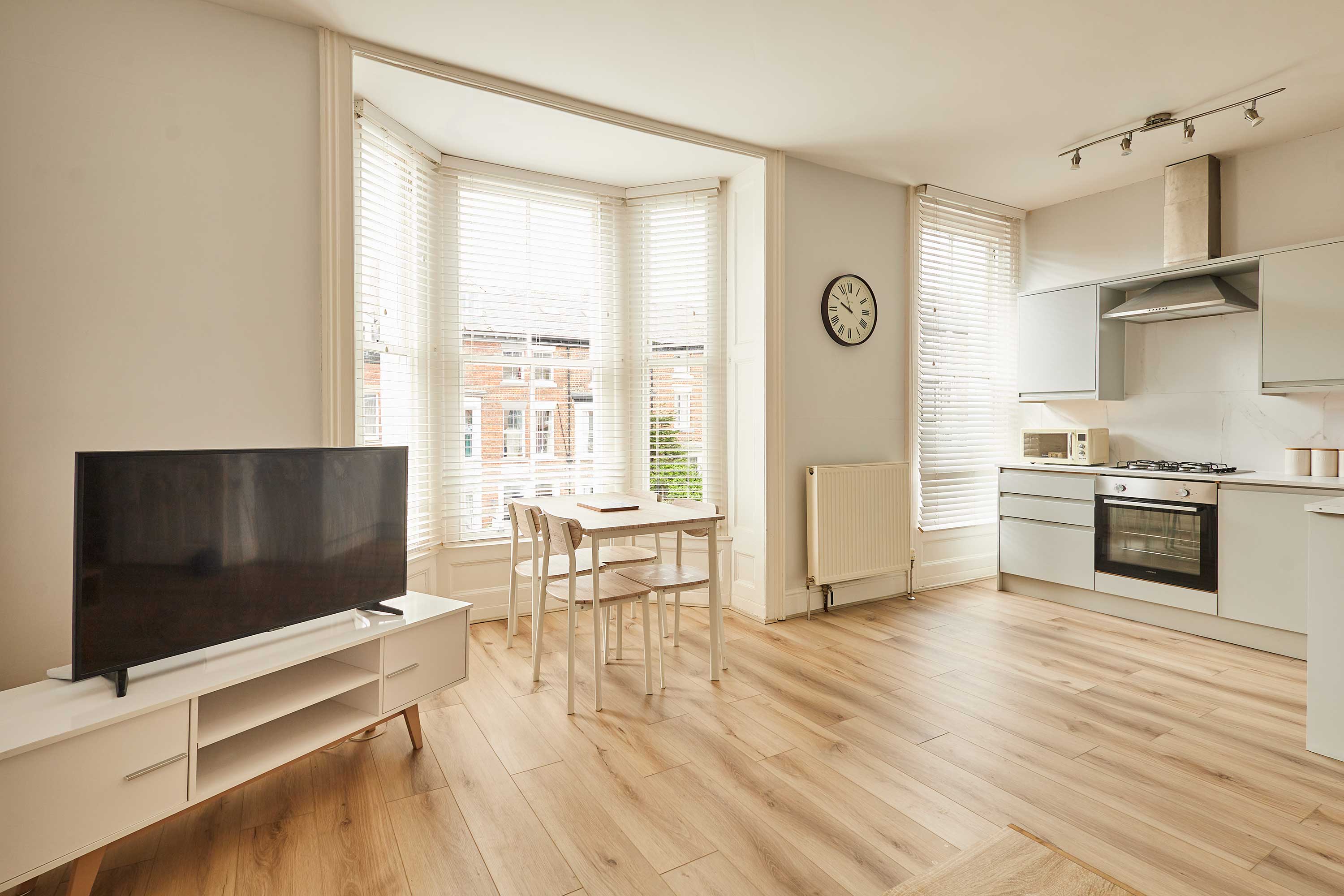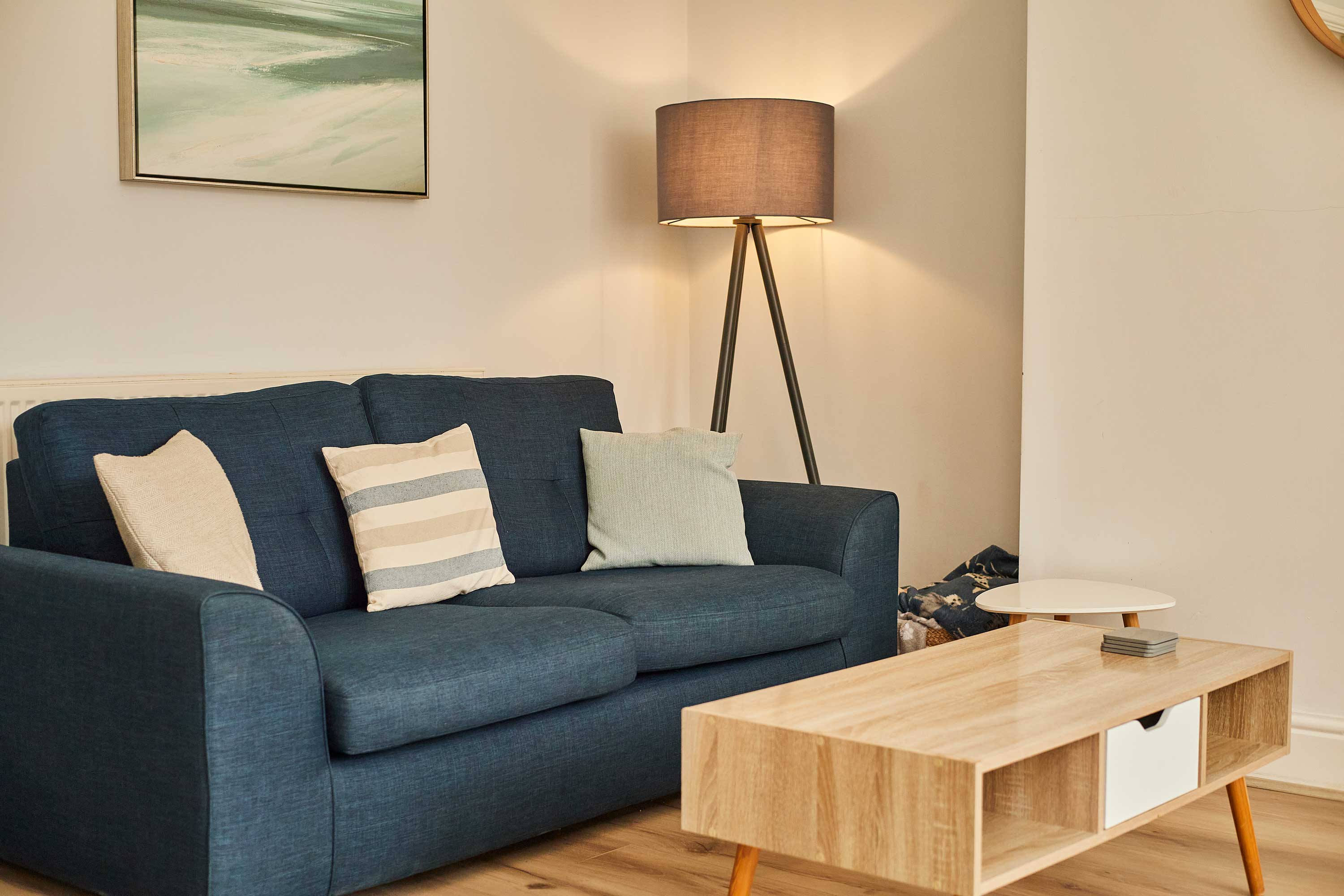 Upon entering the apartment, you’ll be welcomed into a bright and stylish space. With clean walls and plush carpets throughout, The Normanby is a breath of fresh air. The open plan living, dining and kitchen area is spacious and light. Kick back and relax after a long day of exploring the coast. Switch on the flat screen TV to catch up on your favourite shows or take some time out with a good book. In front of the huge bay window, you’ll find the dining area. The light wood dining table and chairs fit the minimalist style of the apartment. Enjoy breakfasts after lazy mornings and delicious evening meals with your loved one. The kitchen is modern and well-equipped. With an oven, fridge, toaster, kettle, washing machine, microwave and coffee machine – you’ll have everything you need for your stay. You can even make yourself a fresh coffee to start your day! The bedroom is a tranquil haven with a comfy king-size bed and stylish furnishings. Pops of dusky pink work perfectly in the room and the feather-like ceiling light is an elegant addition. The room is complete with a dressing table and mirror. Also sharing the same building is Silver Beach and together the apartments can sleep up to four guests. Please get in touch with our friendly team with preferred dates to enquire about booking both apartments together. Outside you’ll find an enclosed patio area with four wooden seats. This is shared with guests staying in Silver Beach.