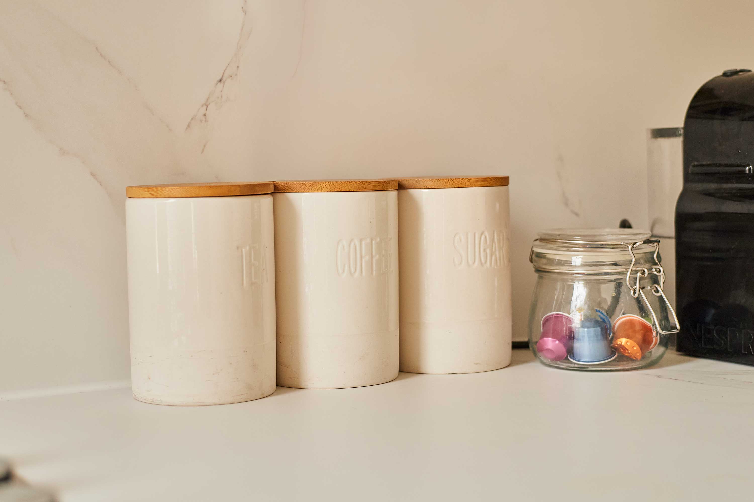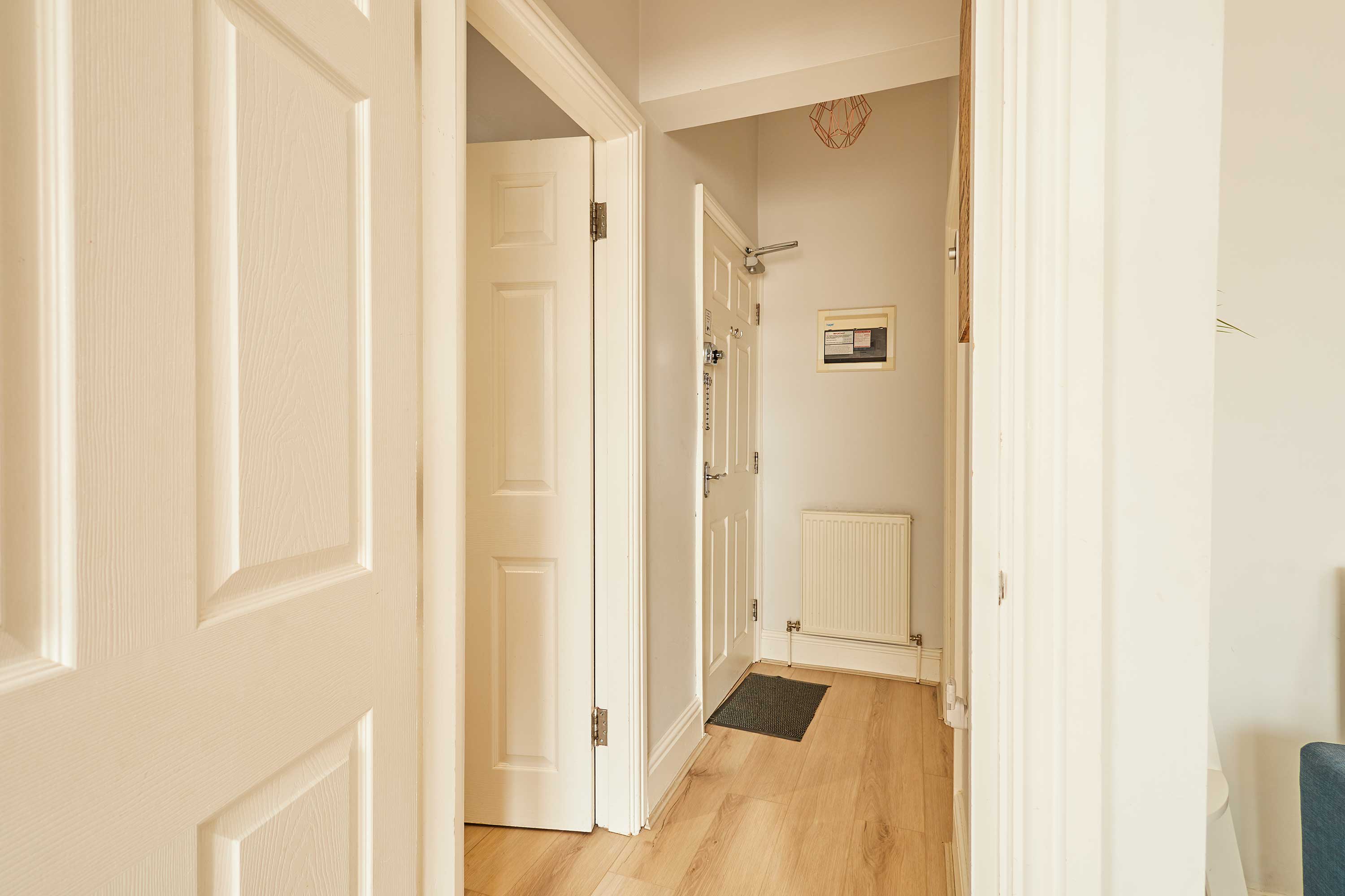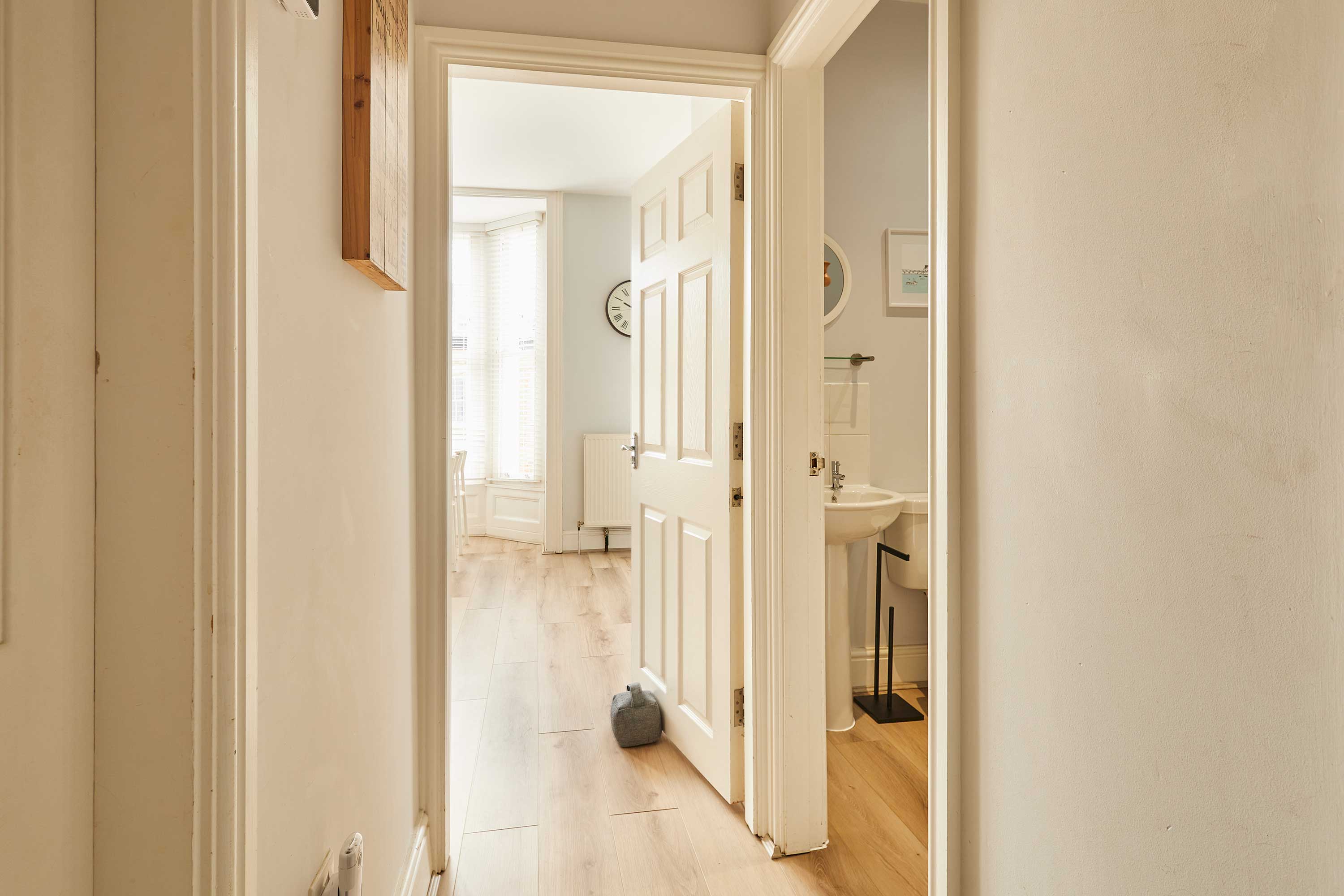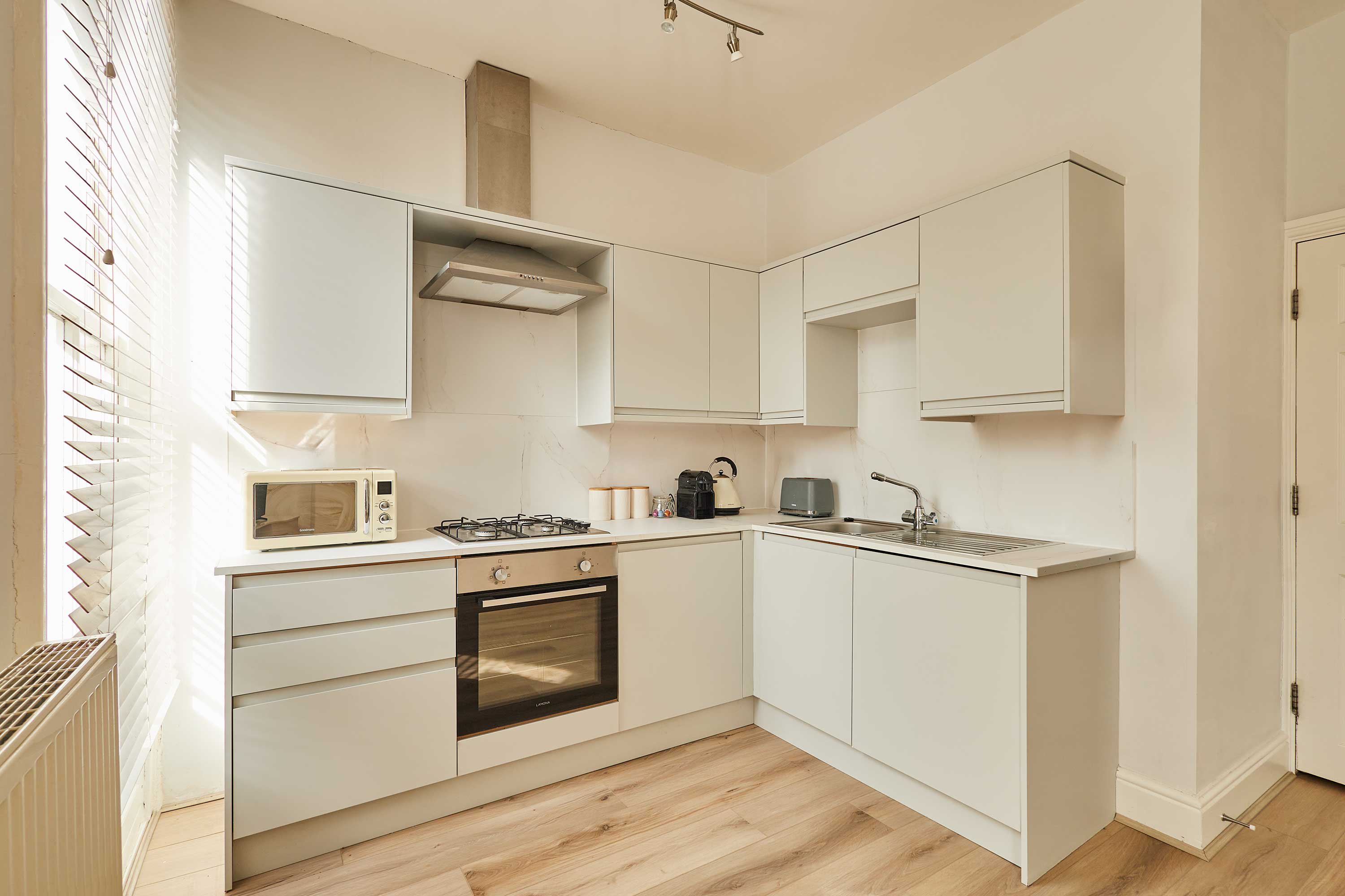 Upon entering the apartment, you’ll be welcomed into a bright and stylish space. With clean walls and plush carpets throughout, The Normanby is a breath of fresh air. The open plan living, dining and kitchen area is spacious and light. Kick back and relax after a long day of exploring the coast. Switch on the flat screen TV to catch up on your favourite shows or take some time out with a good book. In front of the huge bay window, you’ll find the dining area. The light wood dining table and chairs fit the minimalist style of the apartment. Enjoy breakfasts after lazy mornings and delicious evening meals with your loved one. The kitchen is modern and well-equipped. With an oven, fridge, toaster, kettle, washing machine, microwave and coffee machine – you’ll have everything you need for your stay. You can even make yourself a fresh coffee to start your day! The bedroom is a tranquil haven with a comfy king-size bed and stylish furnishings. Pops of dusky pink work perfectly in the room and the feather-like ceiling light is an elegant addition. The room is complete with a dressing table and mirror. Also sharing the same building is Silver Beach and together the apartments can sleep up to four guests. Please get in touch with our friendly team with preferred dates to enquire about booking both apartments together. Outside you’ll find an enclosed patio area with four wooden seats. This is shared with guests staying in Silver Beach.