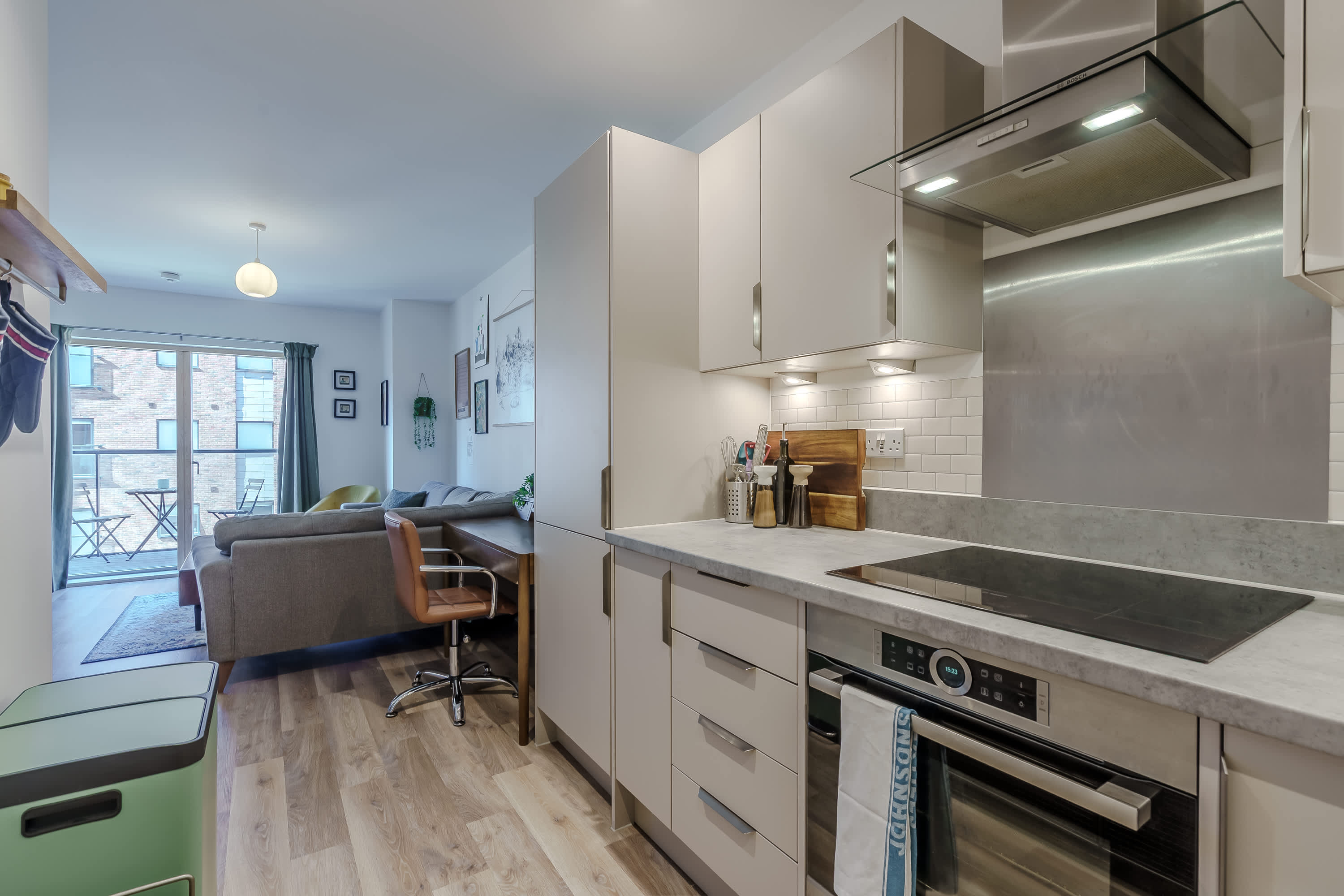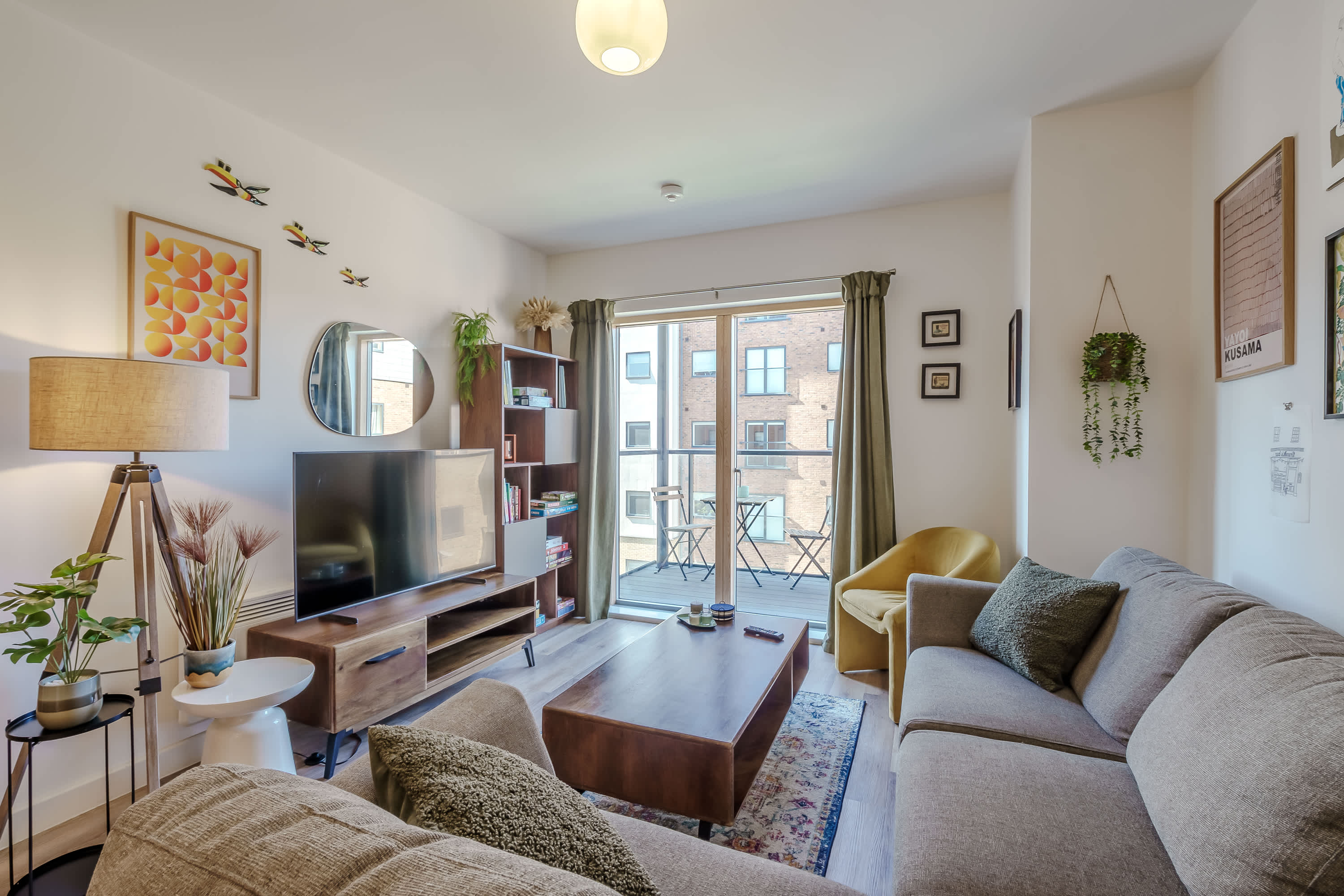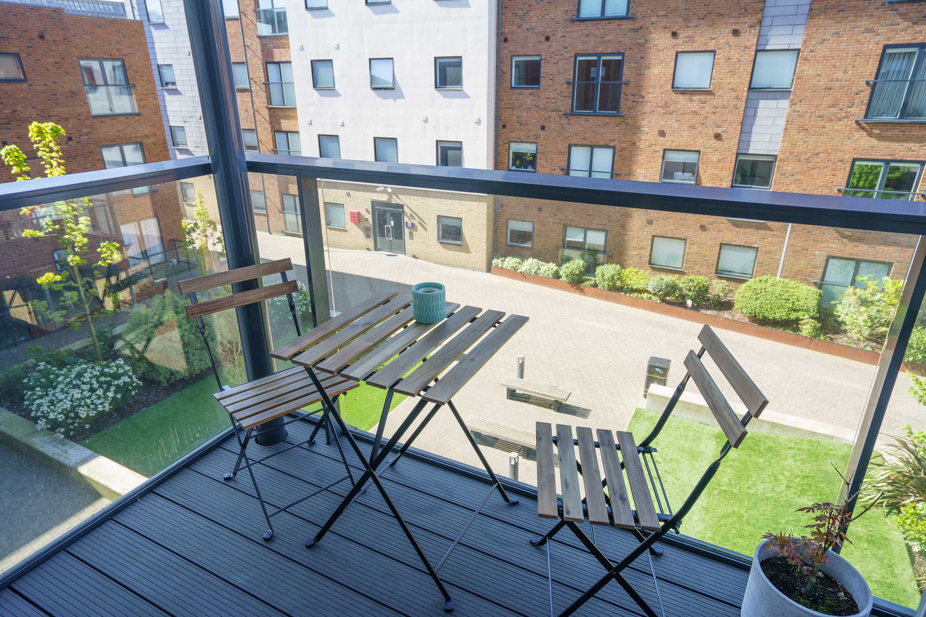The heart of this home is the cosy open-plan living area that features comfortable seating and is ideal for guests looking to relax and unwind. It is thoughtfully decorated to create a warm and welcoming space where guests can curl up with a book or watch television. The fully equipped kitchen provides everything guests need for quick snacks or home cooked meals during their stay. This creates convenience for guests, whether they're enjoying a short break or a longer getaway. The bedroom features a comfortable bed and ample storage space, creating a calm and inviting setting where guests can truly unwind. Soft furnishings and a soothing colour palette add to the sense of tranquillity, making it easy to relax after a busy day in the city. The bathroom is a bright and well-appointed space designed to offer both comfort and convenience. Whether you’re getting ready to explore the city or settling in for a relaxing evening, the bathroom provides a calm and functional environment to suit your needs. The balcony offers a charming outdoor space with seating where guests can relax and enjoy a breath of fresh air. Perfect for starting the day with a morning coffee or unwinding in the evening, it provides a peaceful spot to sit back and take in the surroundings.