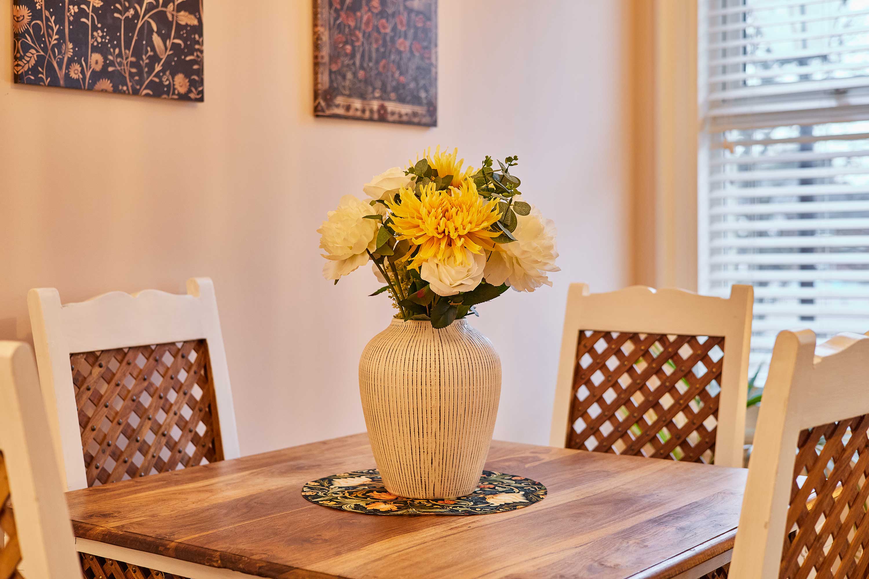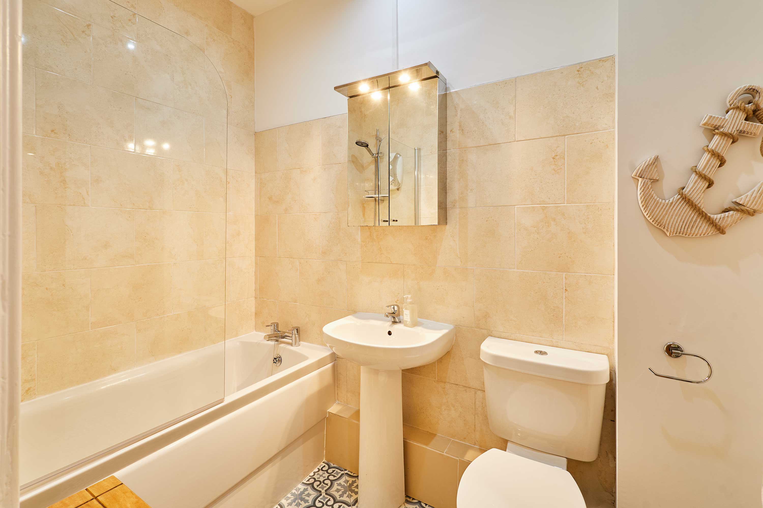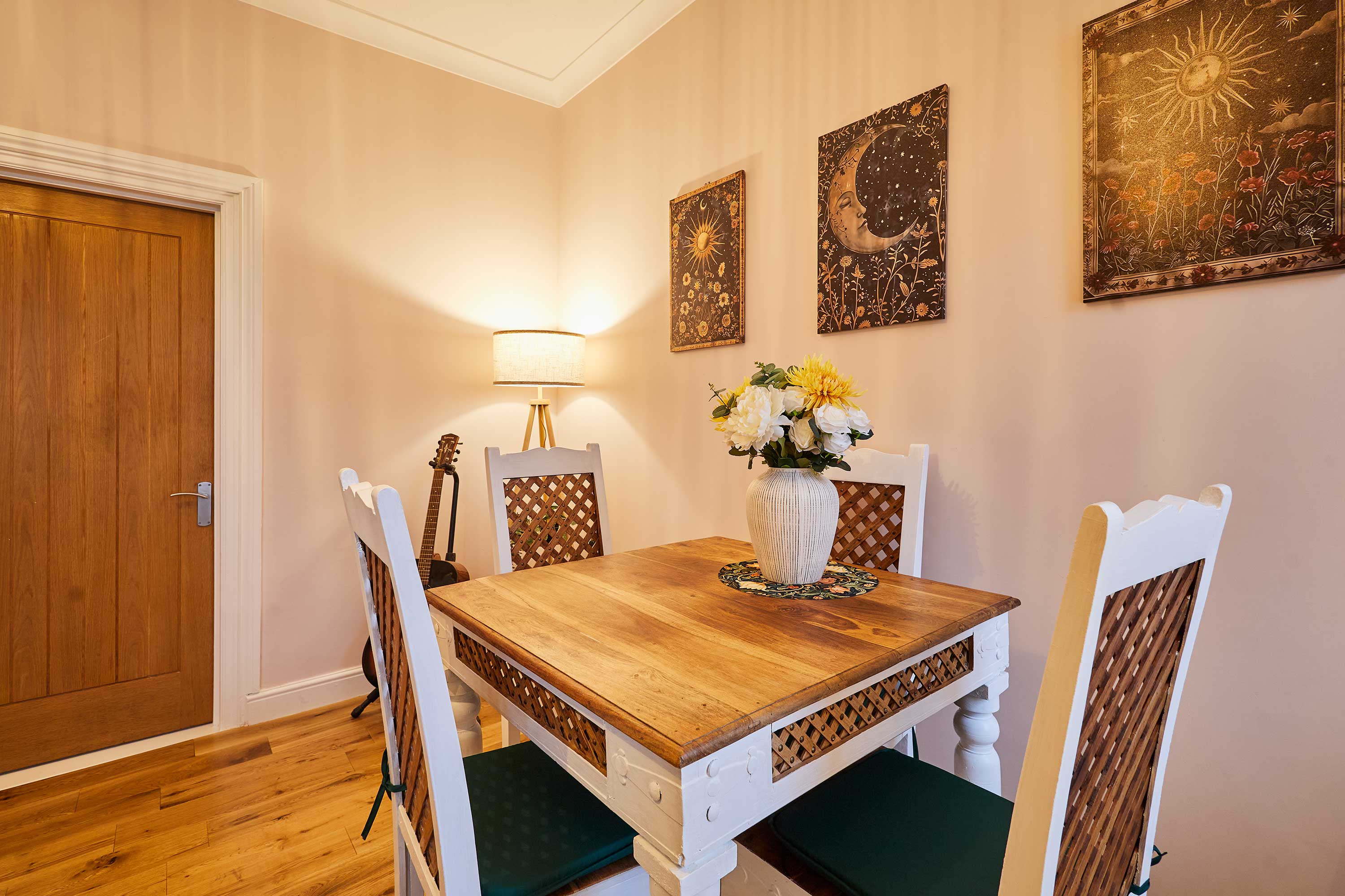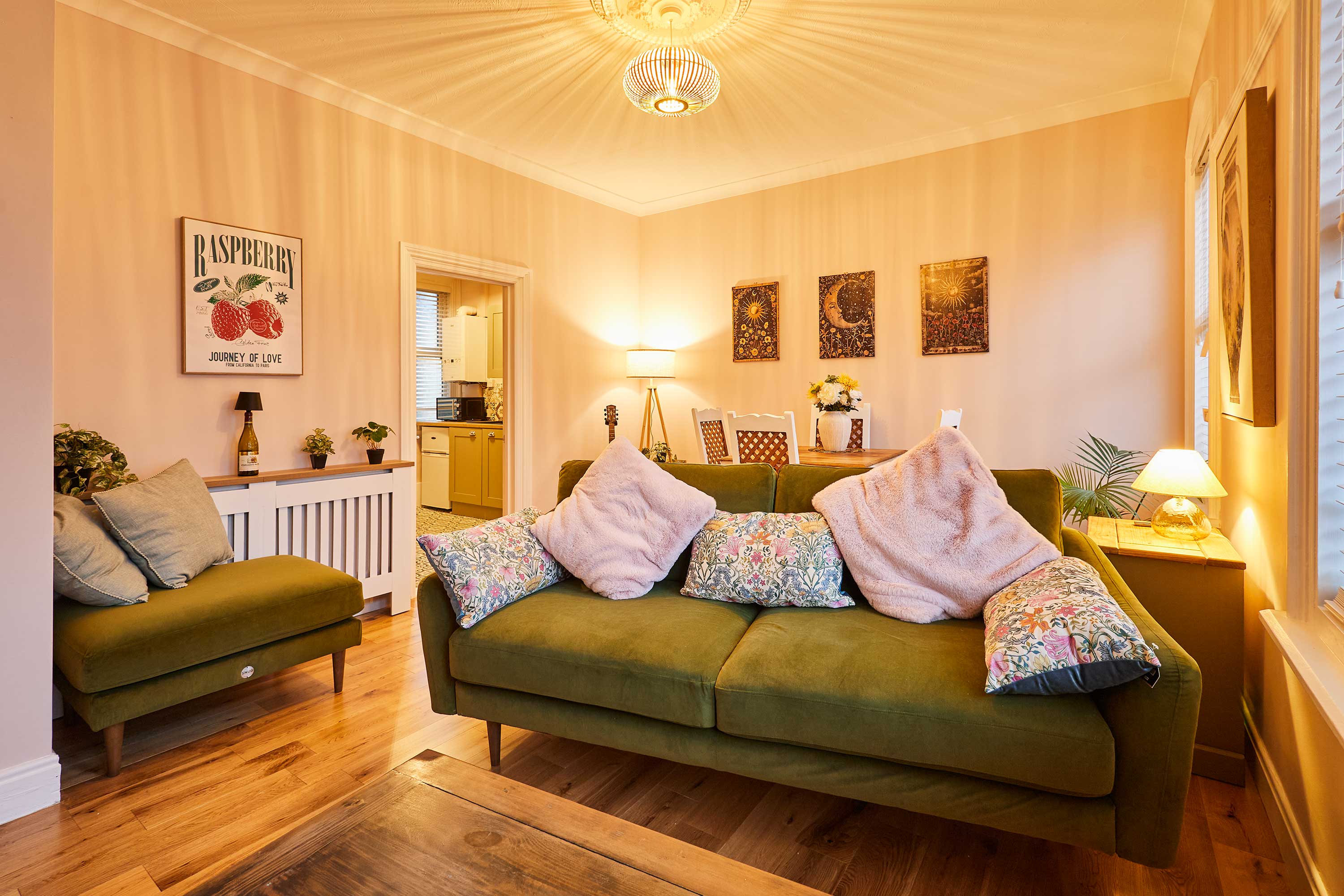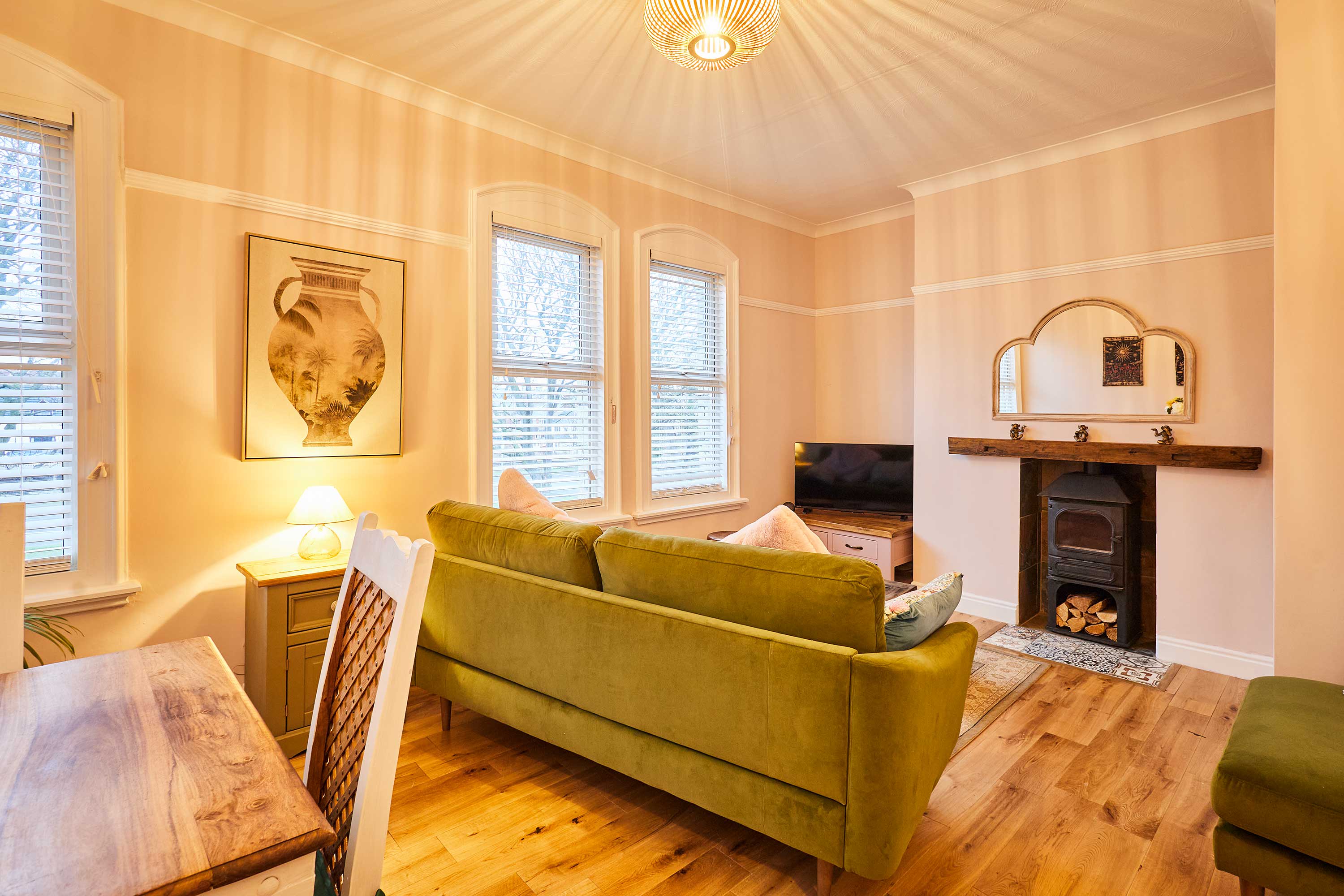This spacious and quirky apartment offers a welcoming blend of character, comfort and modern convenience, creating a relaxed home-from-home feel. The living room is bright and inviting, centred around a charming log burner (not for use) that adds warmth and ambience to the space. Comfortable sofas provide the perfect spot to unwind, while a flat-screen TV is on hand for cosy evenings in. The living area flows seamlessly into an open-plan dining space, with a seating area and dining table ideal for shared meals and leisurely mornings. The kitchen is tastefully decorated to reflect the character of the property, while still offering modern appliances and everything needed for self-catering during your stay. Both large double bedrooms are thoughtfully furnished to provide a restful night’s sleep, with ample space and stylish touches that continue the apartment’s unique personality. Completing the apartment is a modern bathroom with both a bath and shower, perfect for relaxing and unwinding after a day spent exploring the beach and coastline. With its spacious layout, quirky charm and thoughtful touches throughout, this apartment provides a comfortable and characterful base for your seaside getaway.