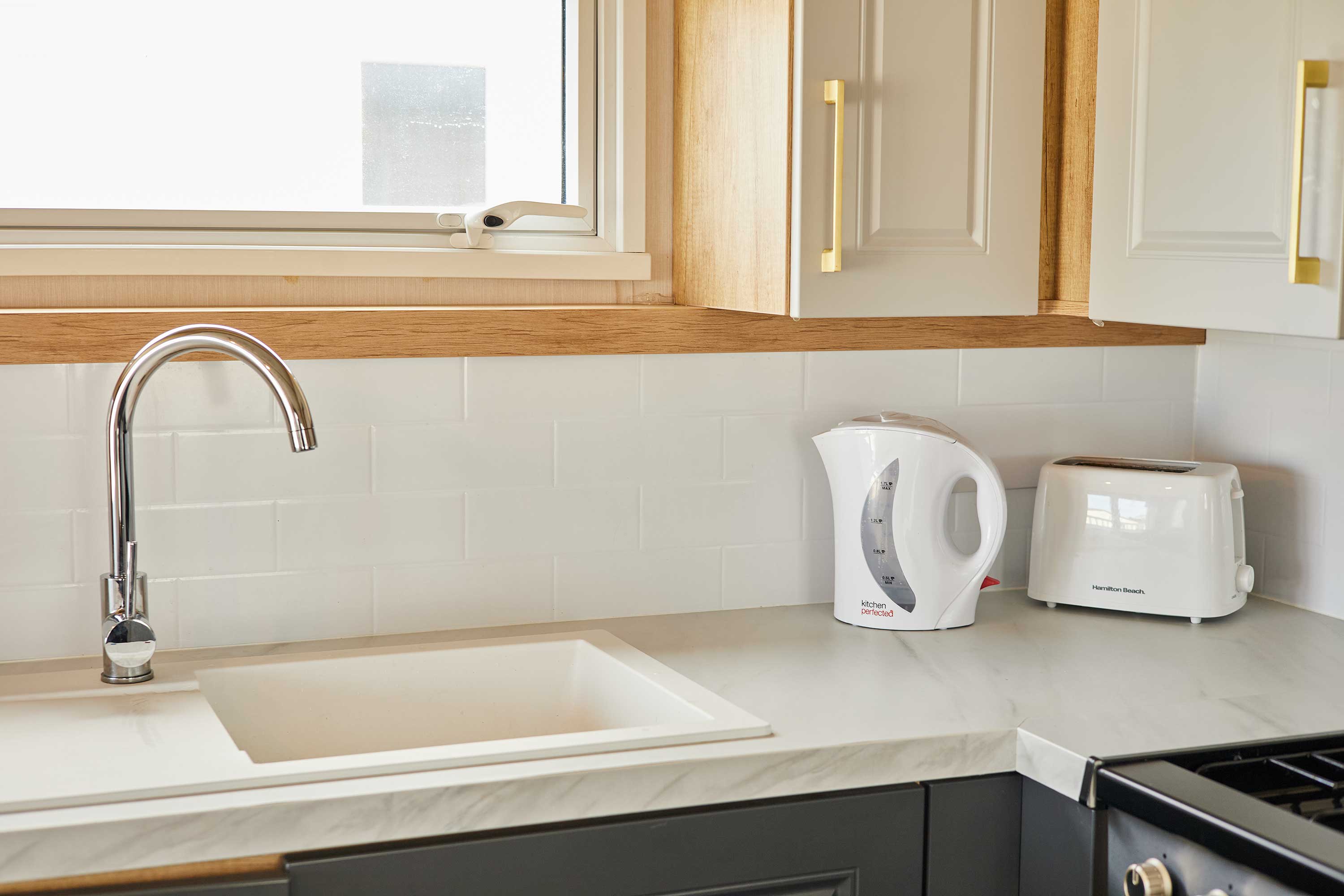 The heart of this cosy home is the open-plan living room as it features comfortable sofas and a television that creates the perfect space for guests to gather and create memories or spend time relaxing. It is thoughtfully designed using neutral tones and tasteful decor to provide a warm and welcoming area. The fully equipped kitchen allows for guests to cook delicious home-cooked meals or grab a quick snack before heading out to explore the local area. Guests can then enjoy delicious meals together at the dining area beside the kitchen. Both bedrooms feature comfortable beds, ample storage spaces and offer a calming space for guests to relax at the end of the day. The main bedroom also features a television to help guests unwind. The bright bathroom is perfect for guests to refresh themselves throughout each day.